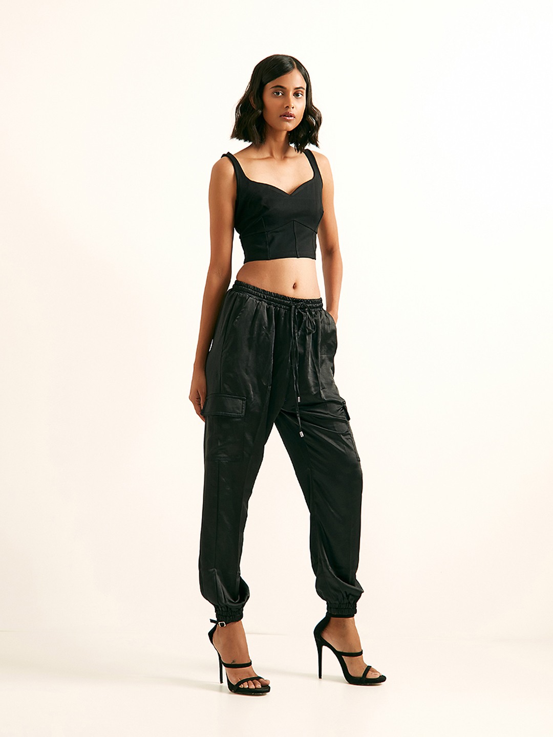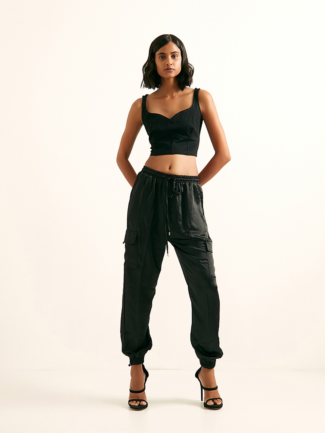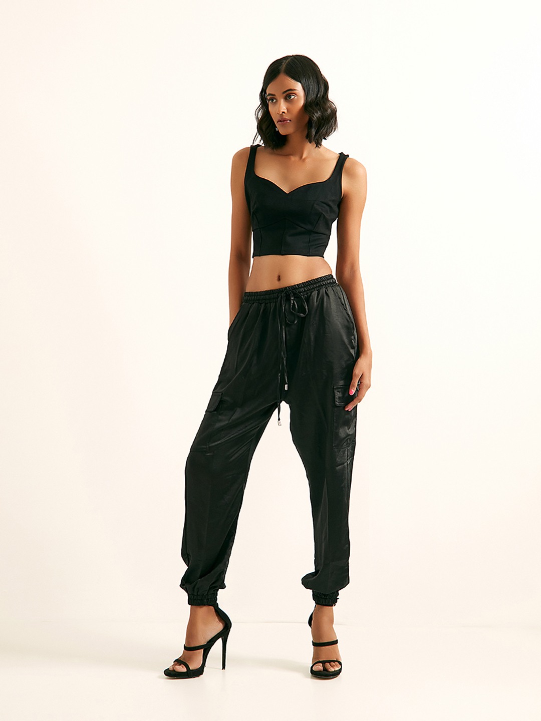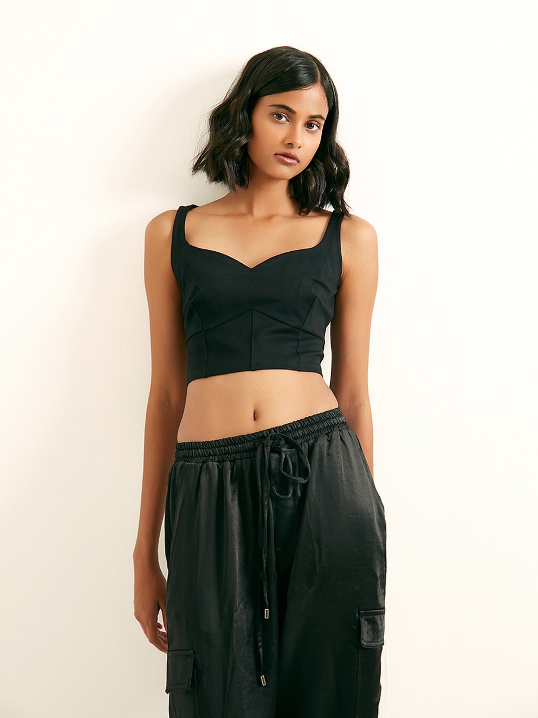 Black sleeveless bustier top featuring a sweetheart neckline