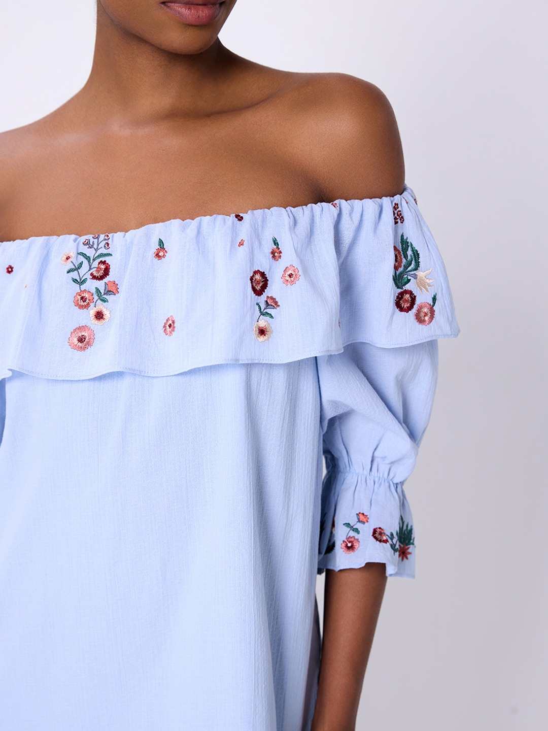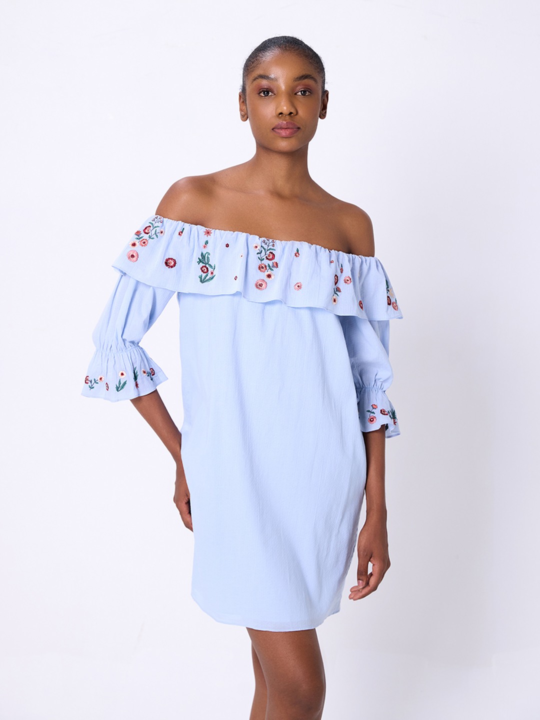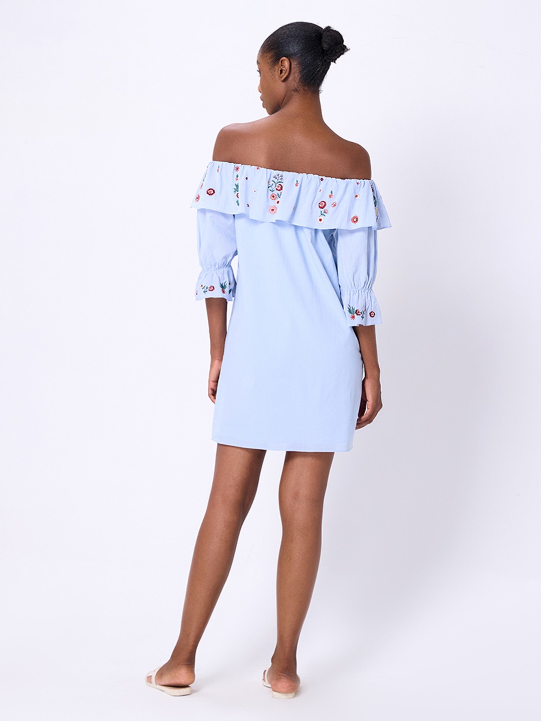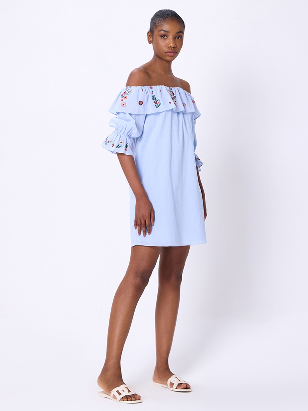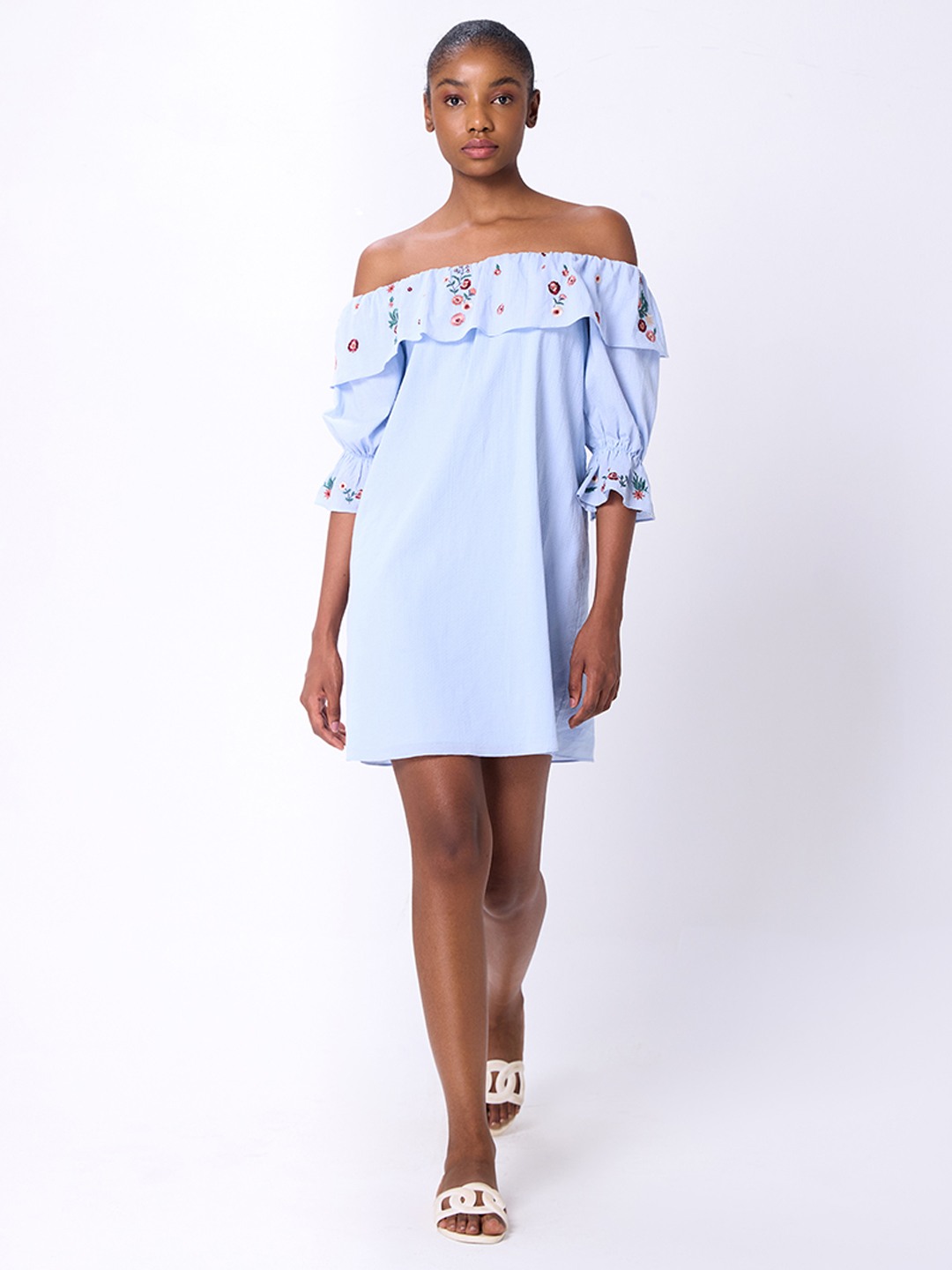 Blue shift mini dress featuring ruffle bardot with embroidery detail
