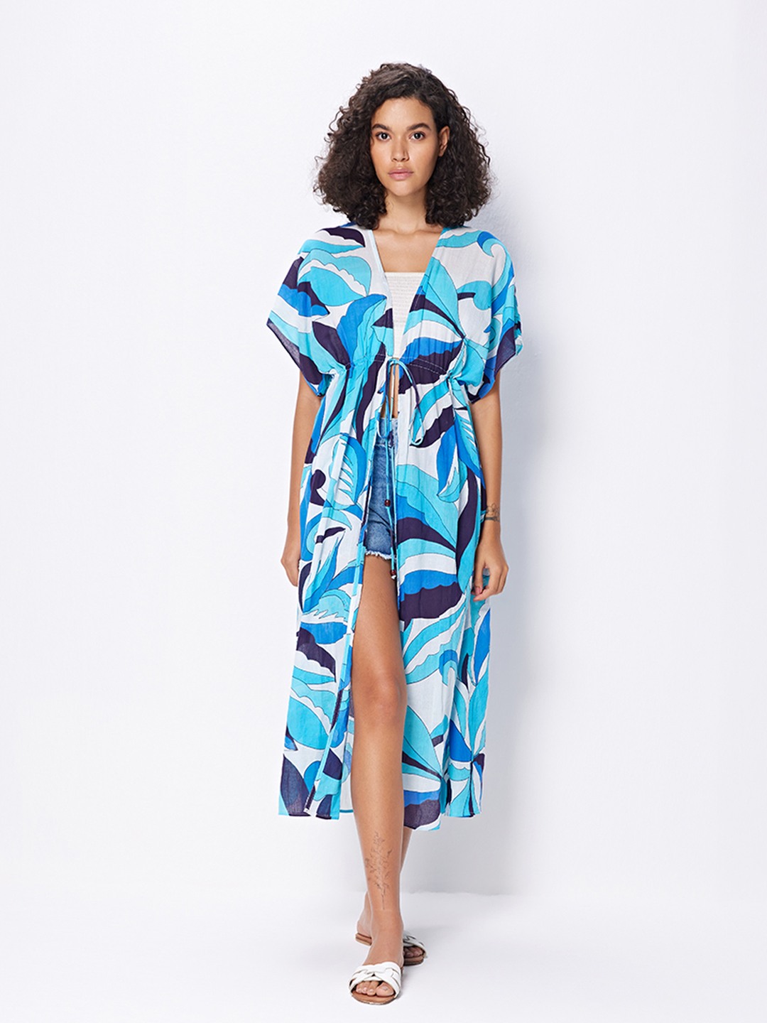Blue nautical print long kimono shrug
