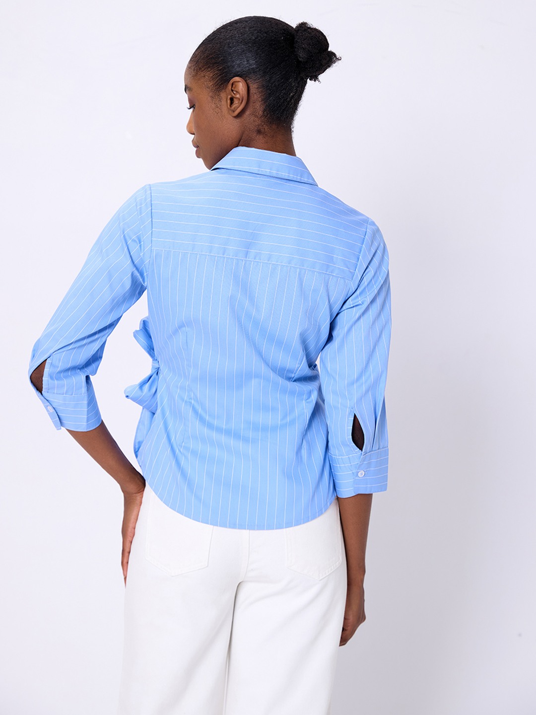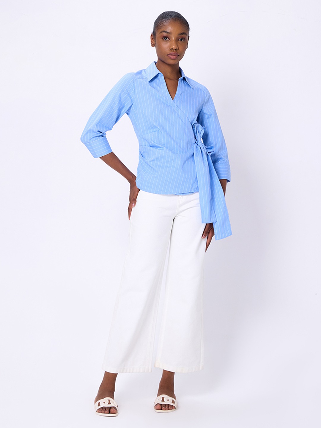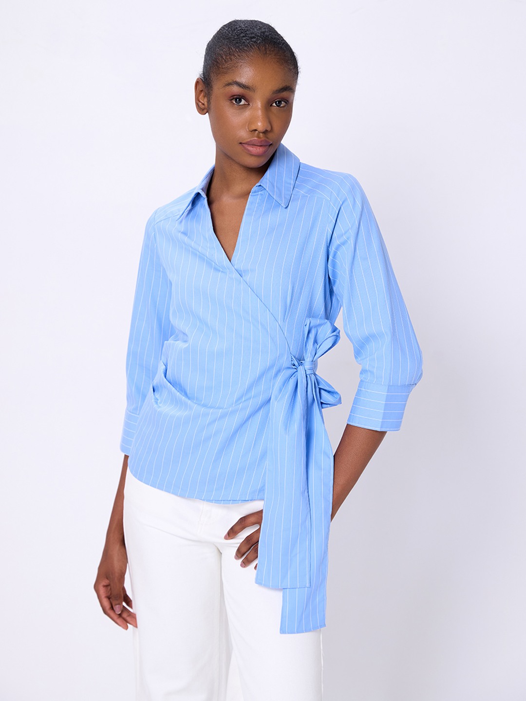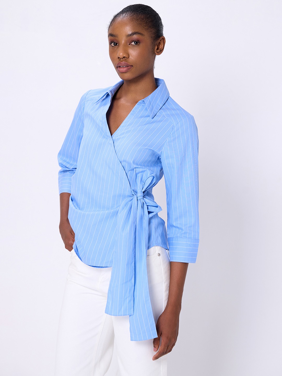 Blue stripe poplin wrap shirt featuring long cuffed sleeves