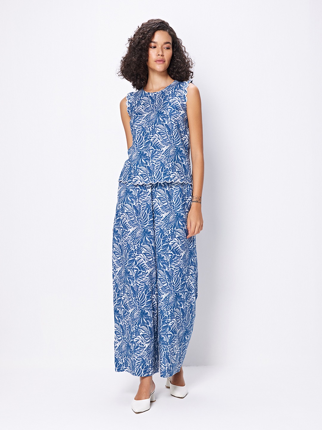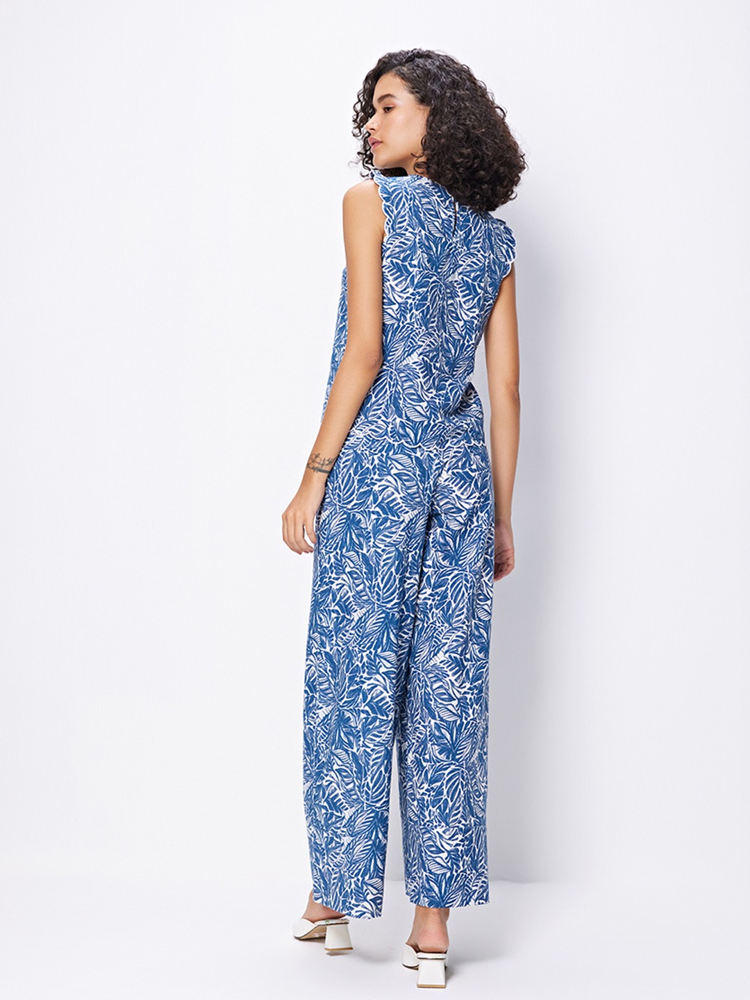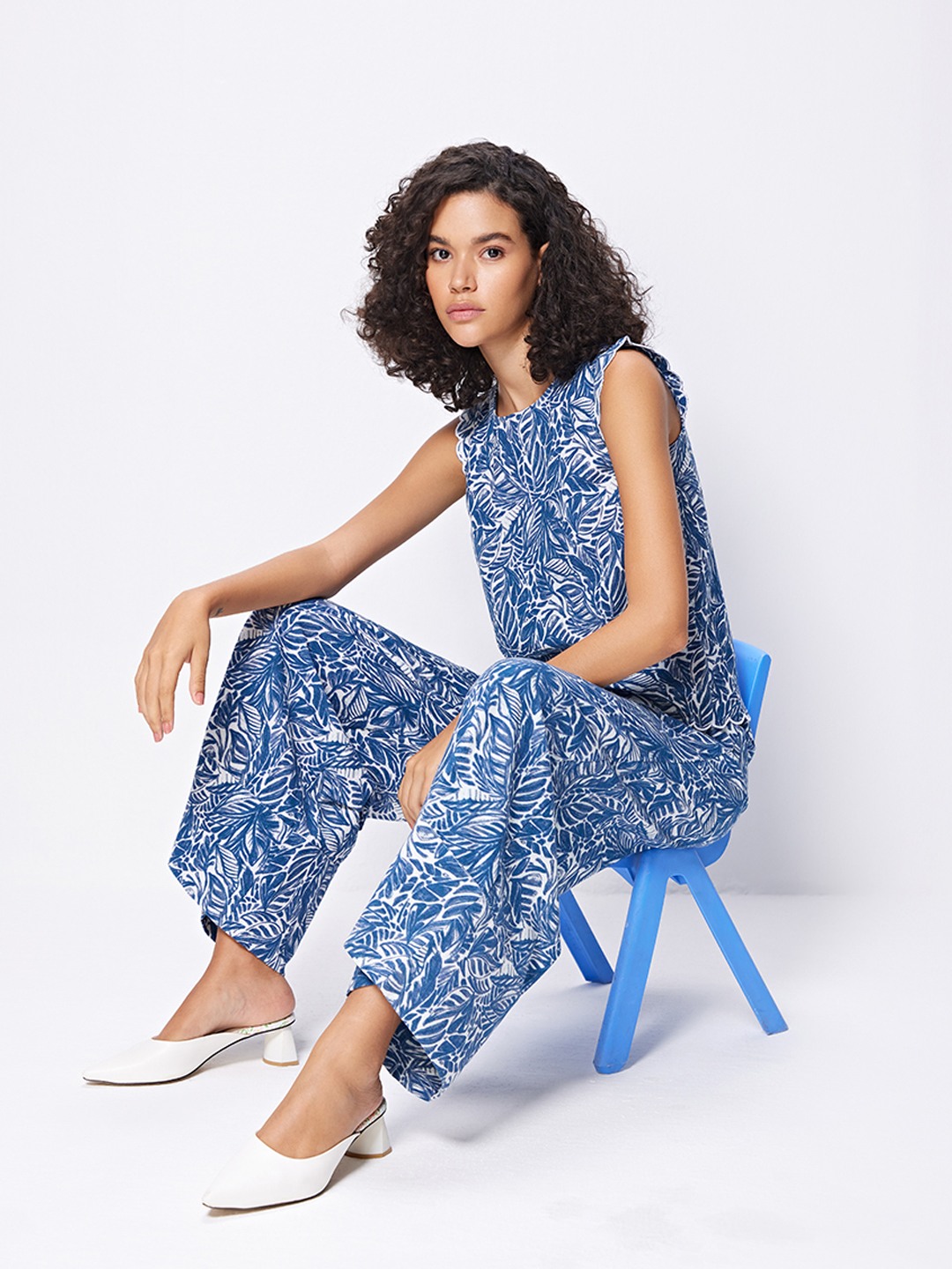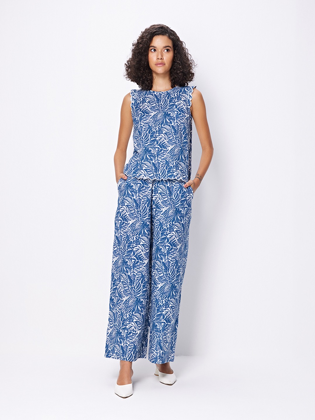 Blue & white tropical sleevless linen shell top featuring scalloped edging