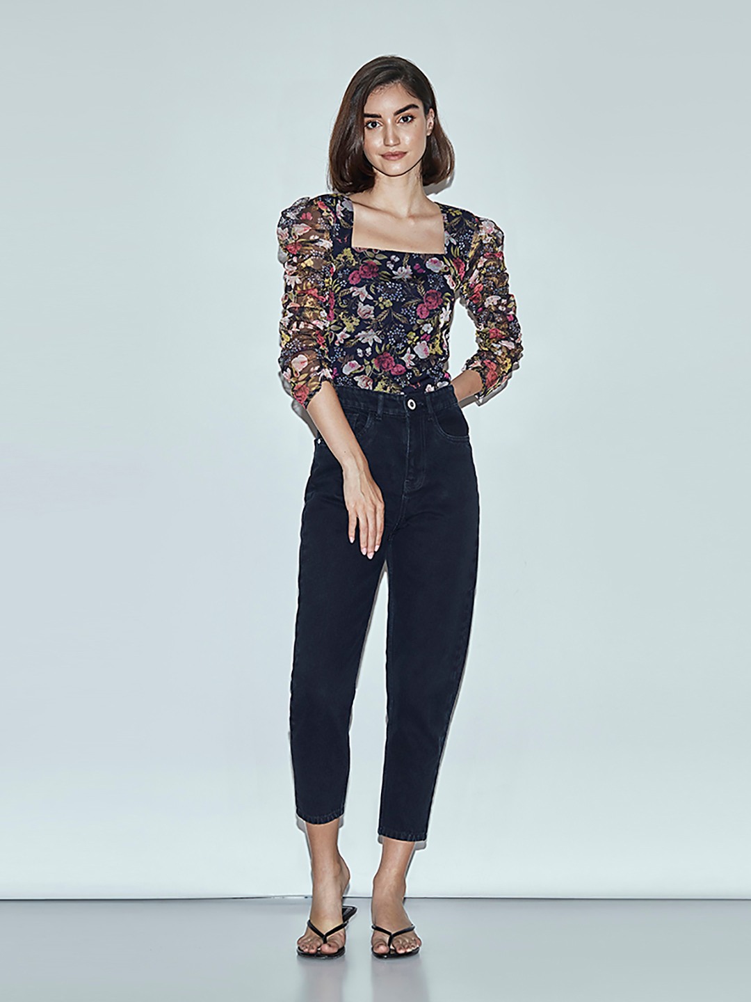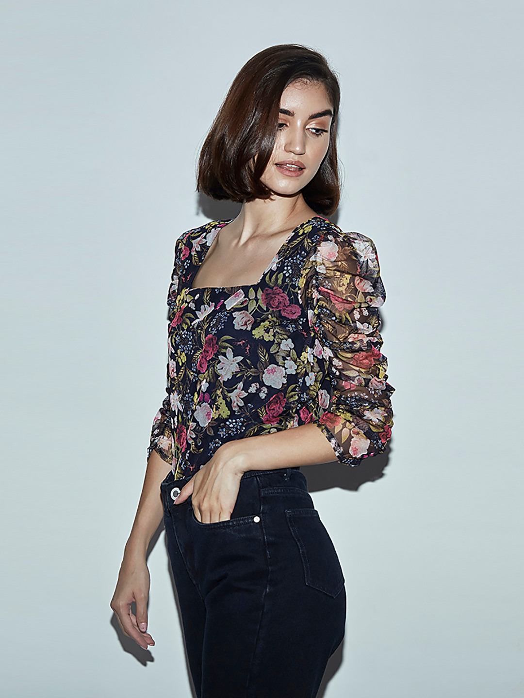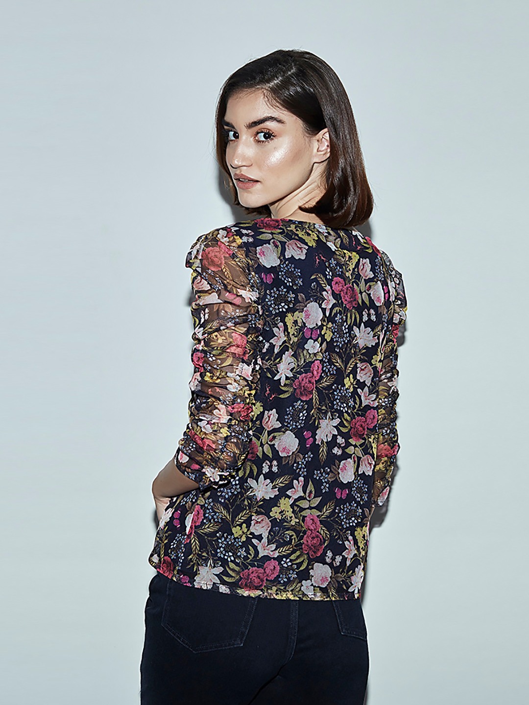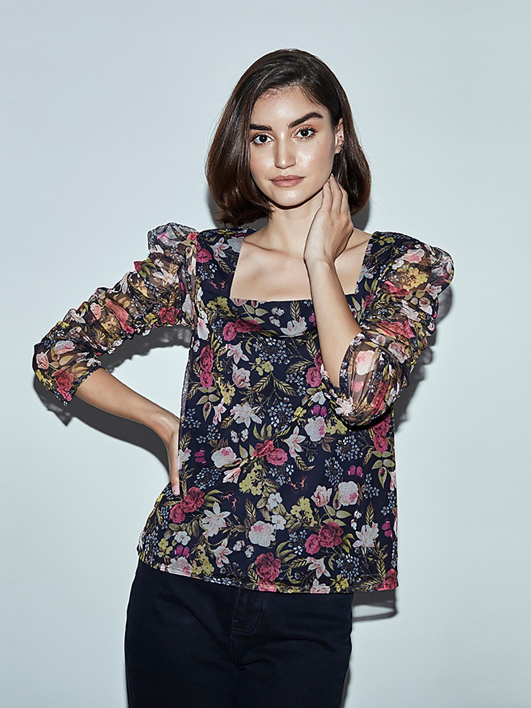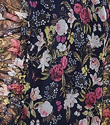 • Navy floral print mesh top featuring long puff sleeves and a high neck with ribbon tie detail