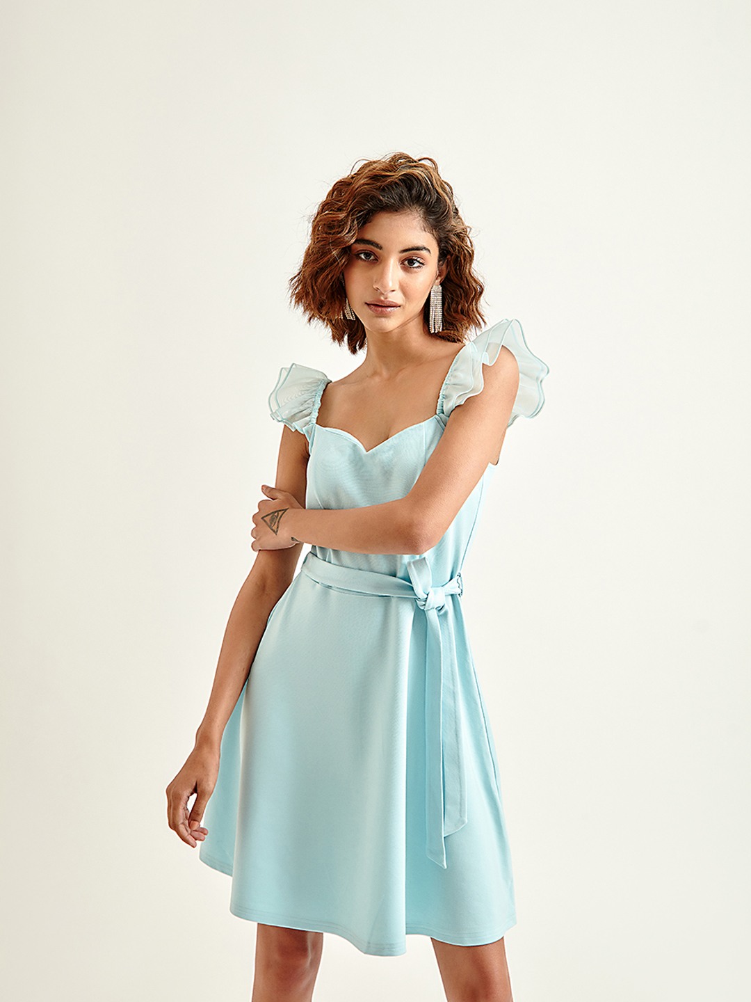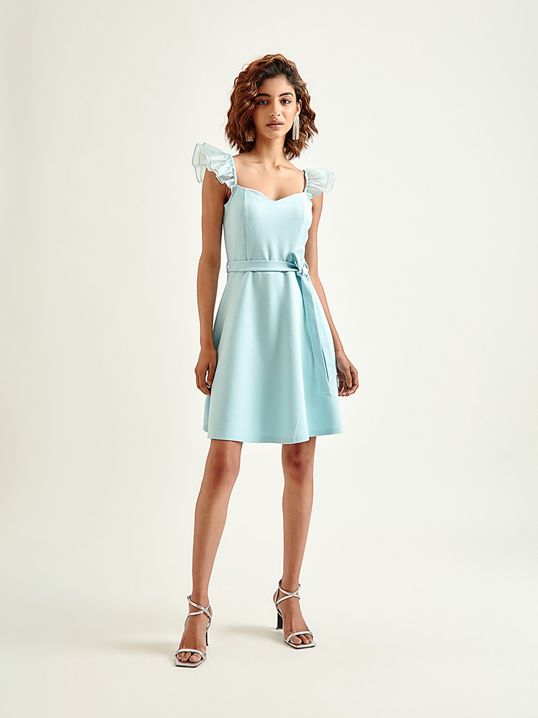 - Blue skater mini dress featuring sweetheart neckline, short sleeves with pleated ruffle detail and self fabric belt
