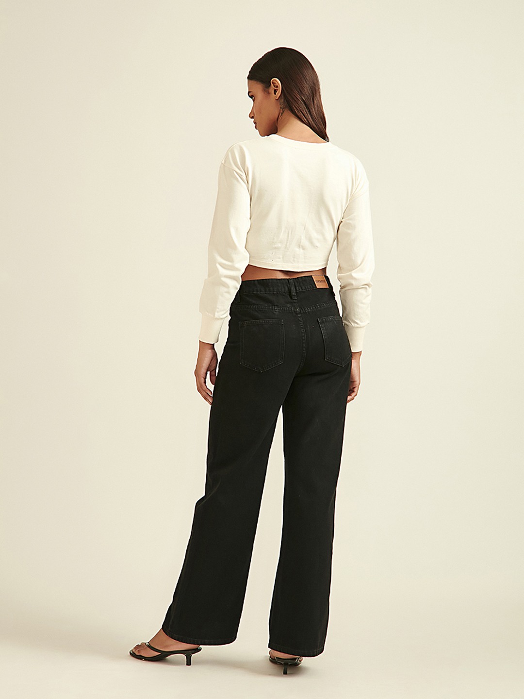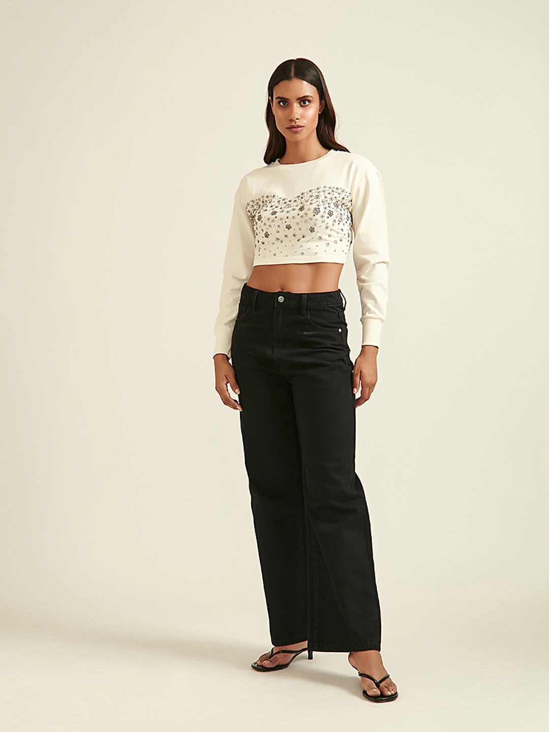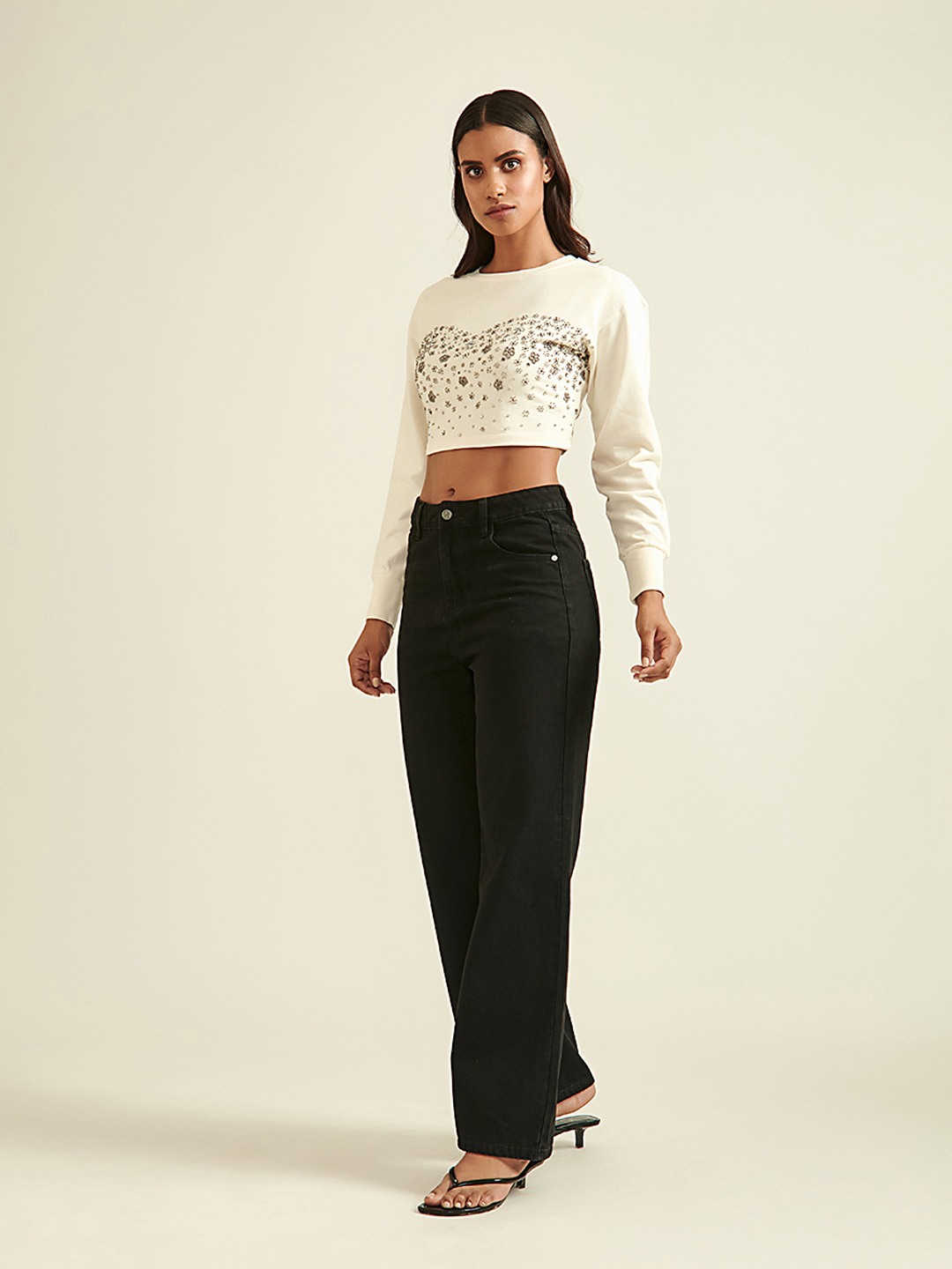 - Ivory crop sweatshirt with diamont detail featuring round neck and long sleeves