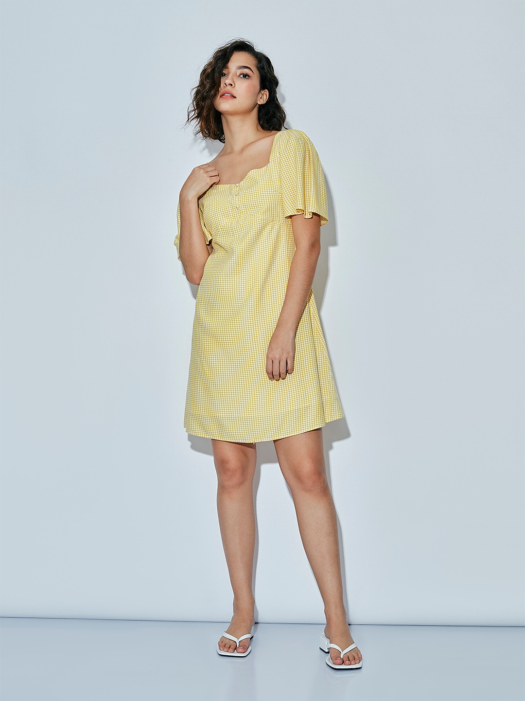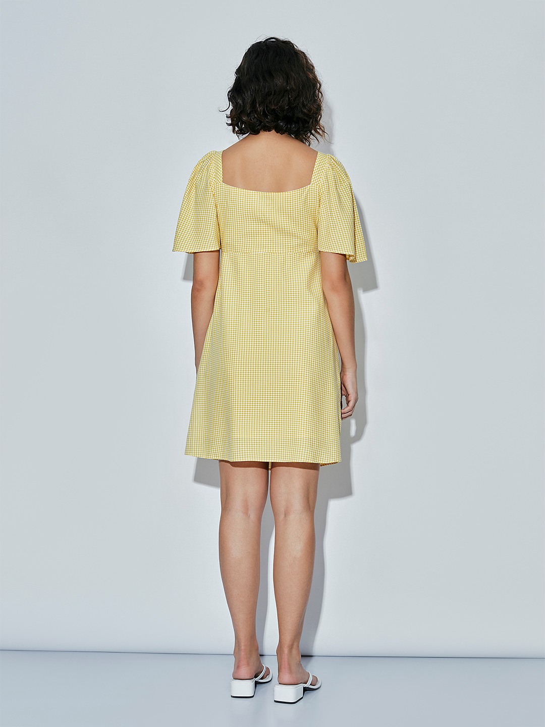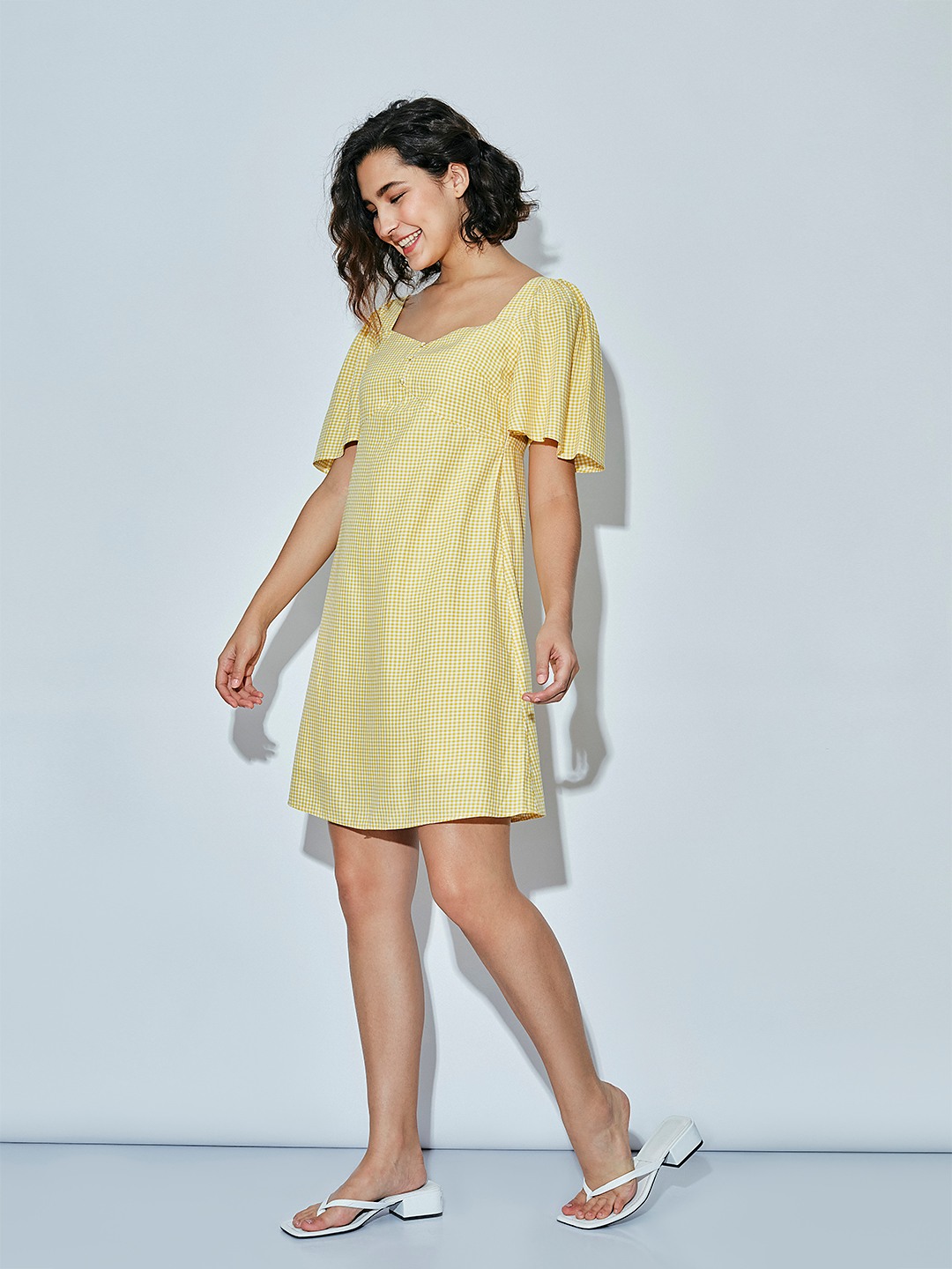 - Yellow & white gingham check shift dress with a sweetheart neckline and short puff sleeves