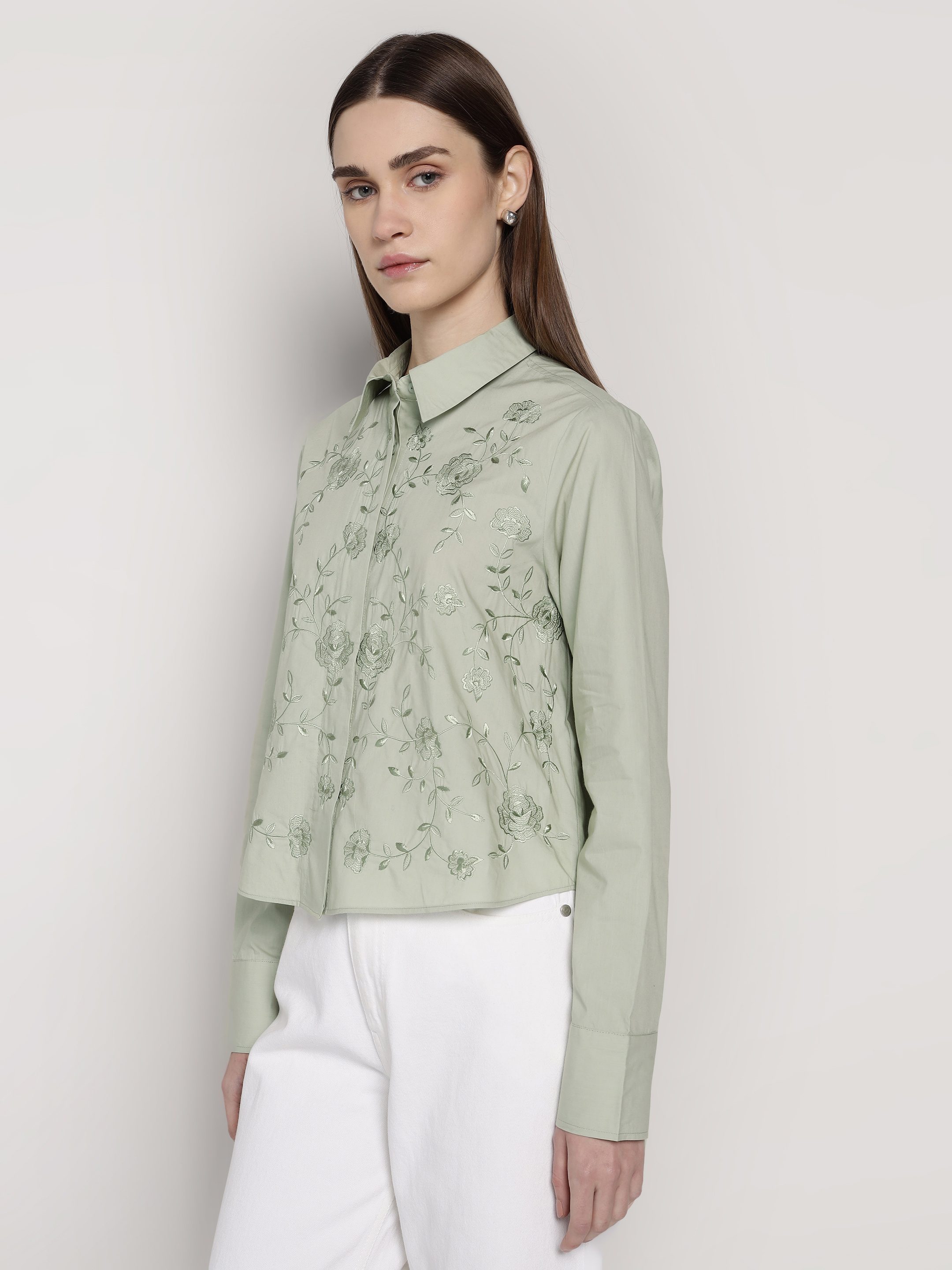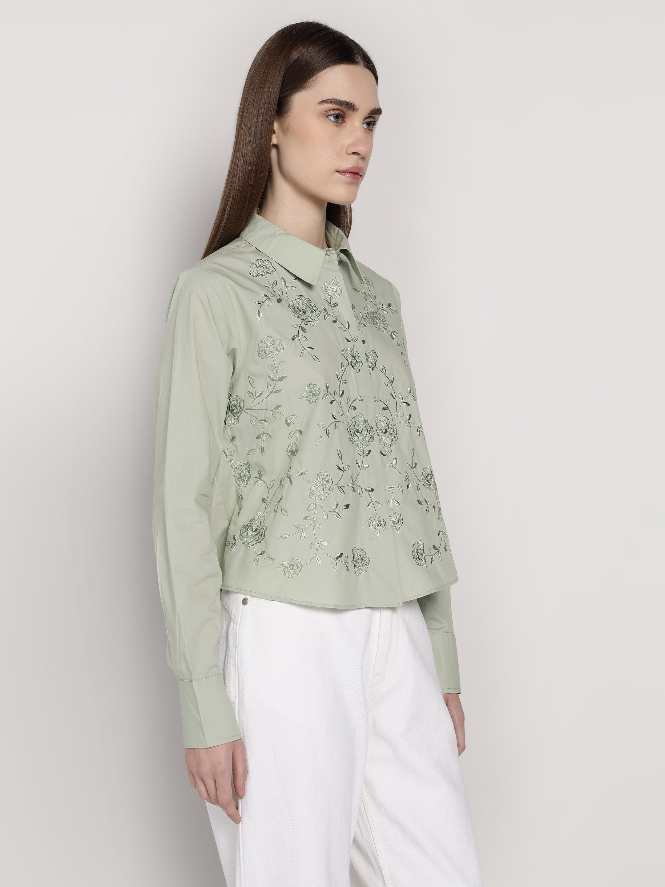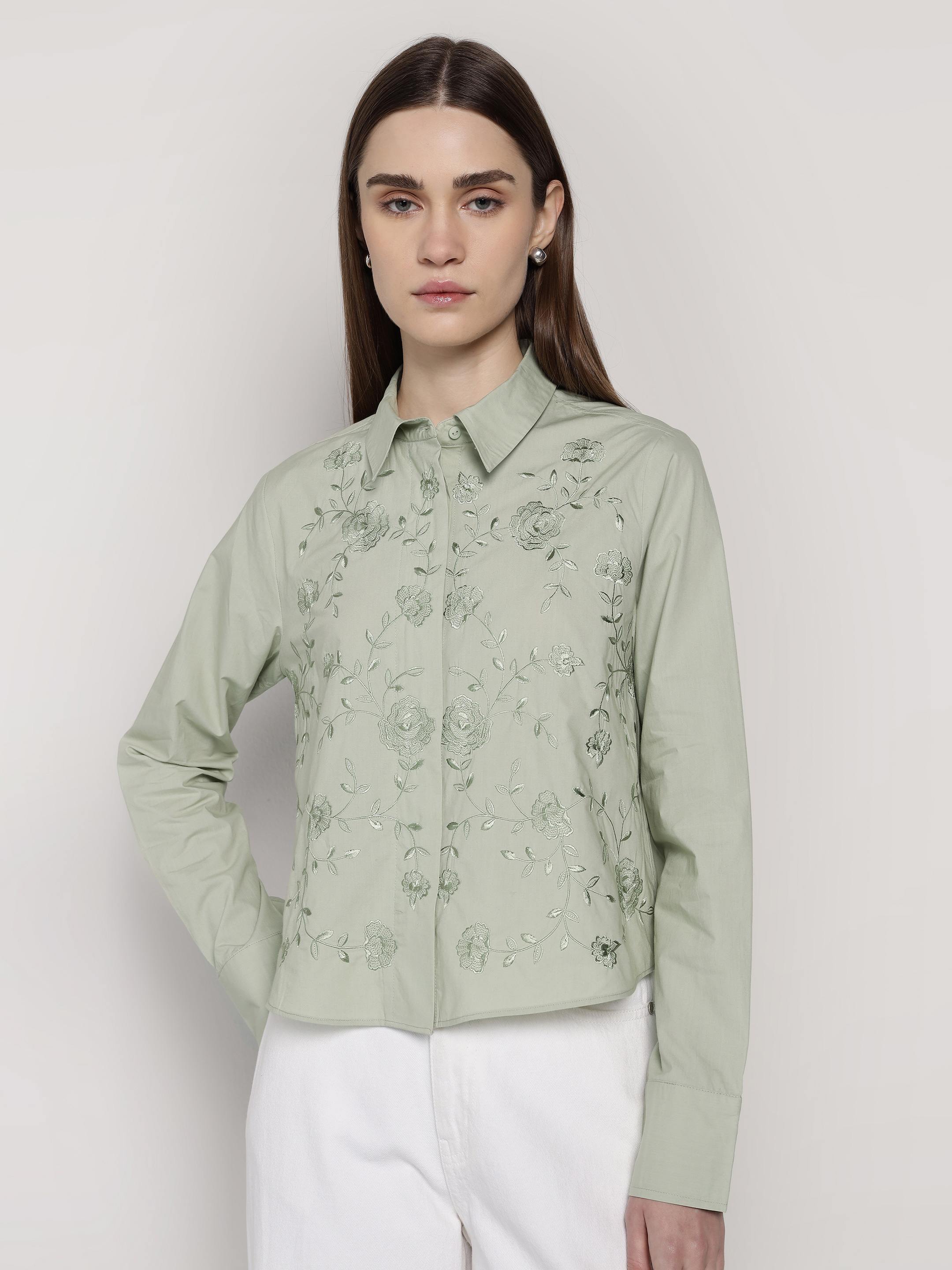 Green Embroidered Crop Shirt