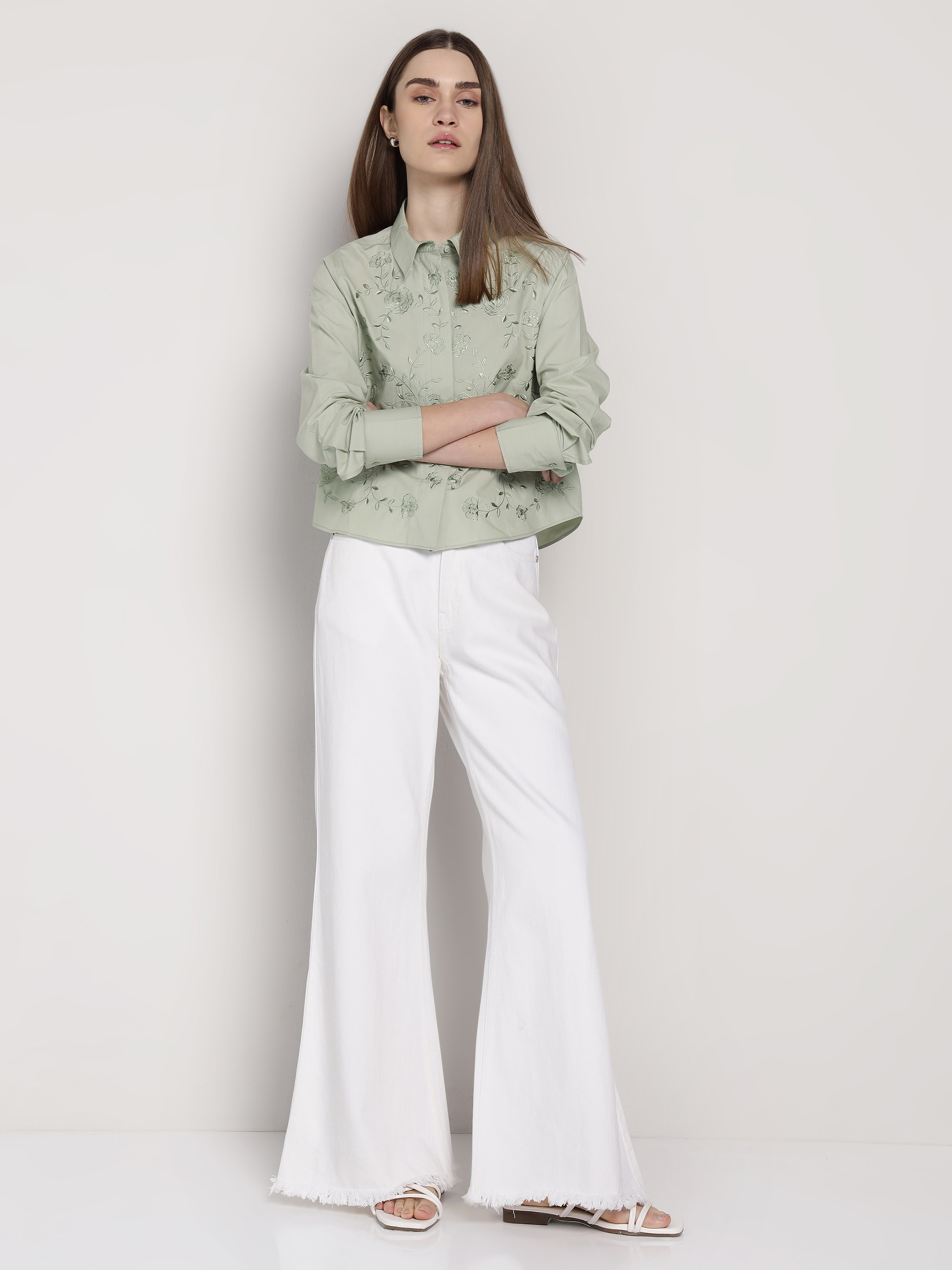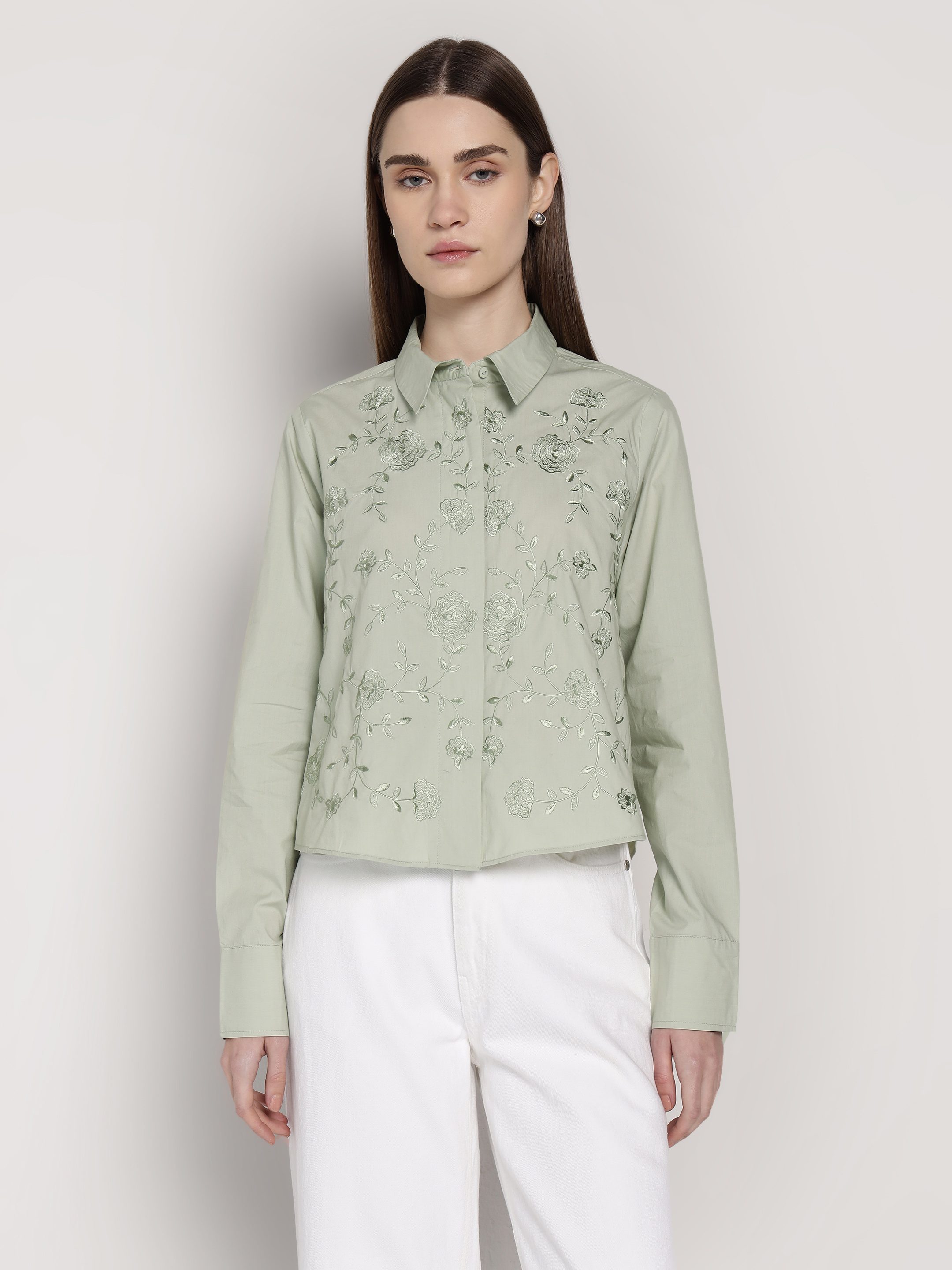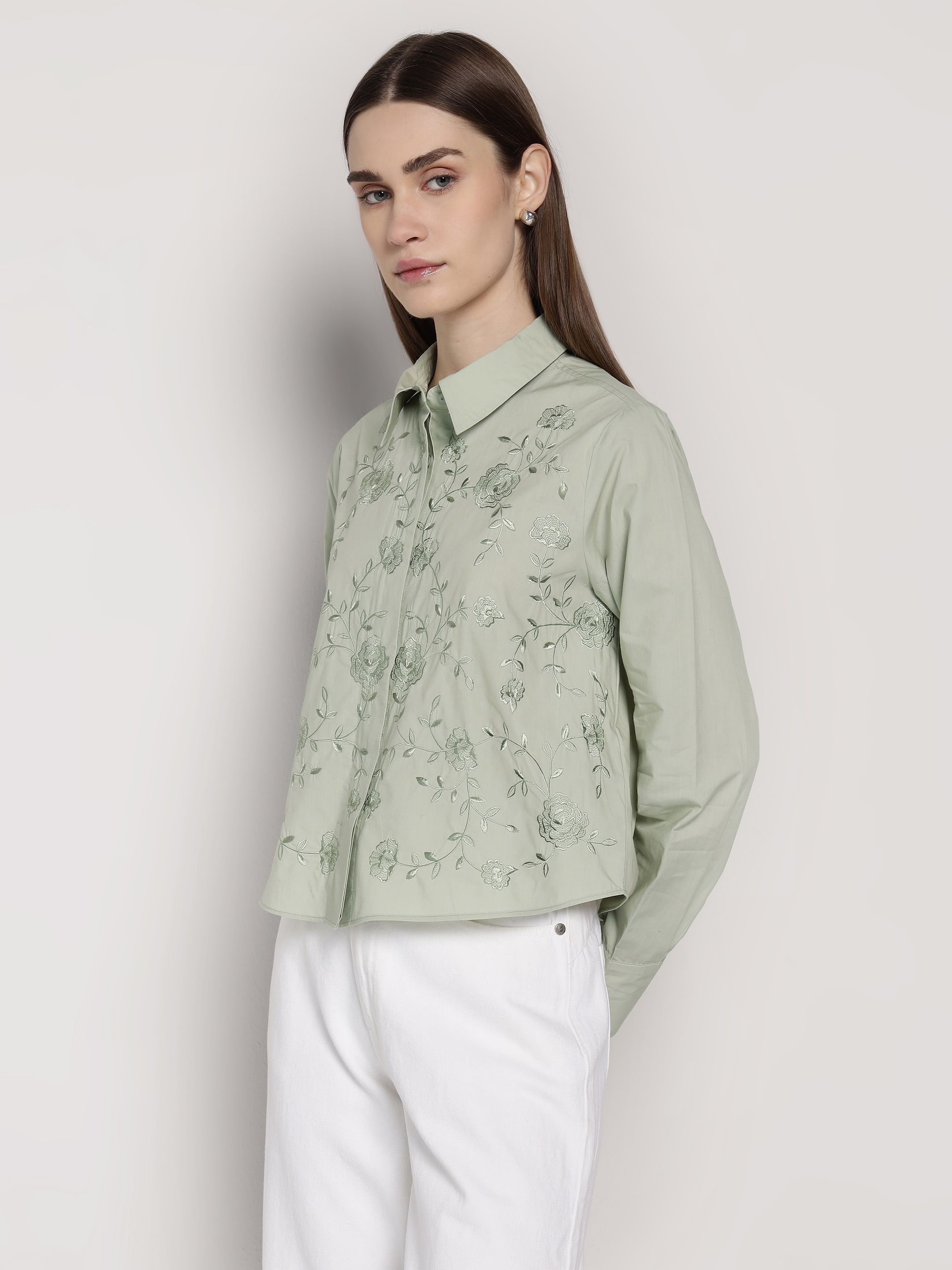 Green Embroidered Crop Shirt
