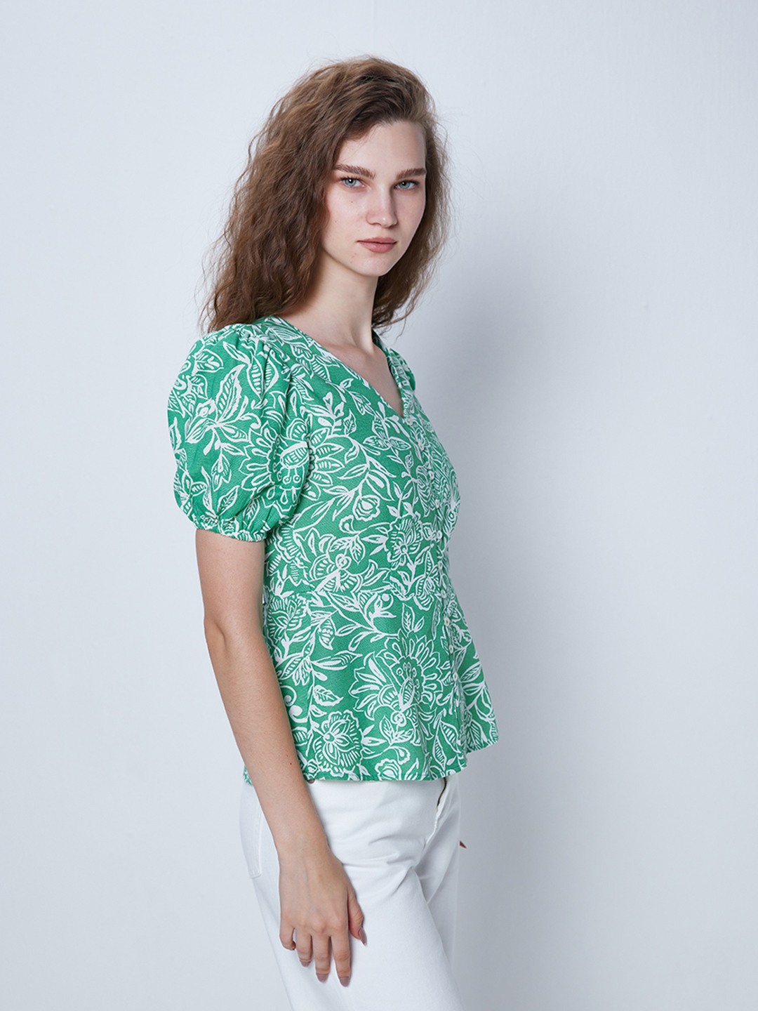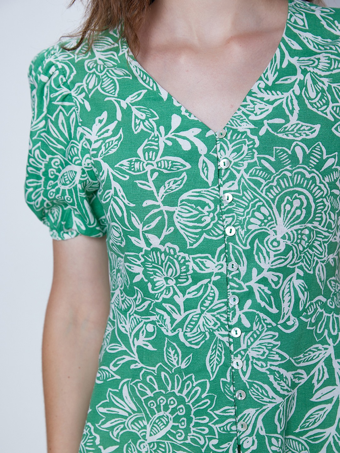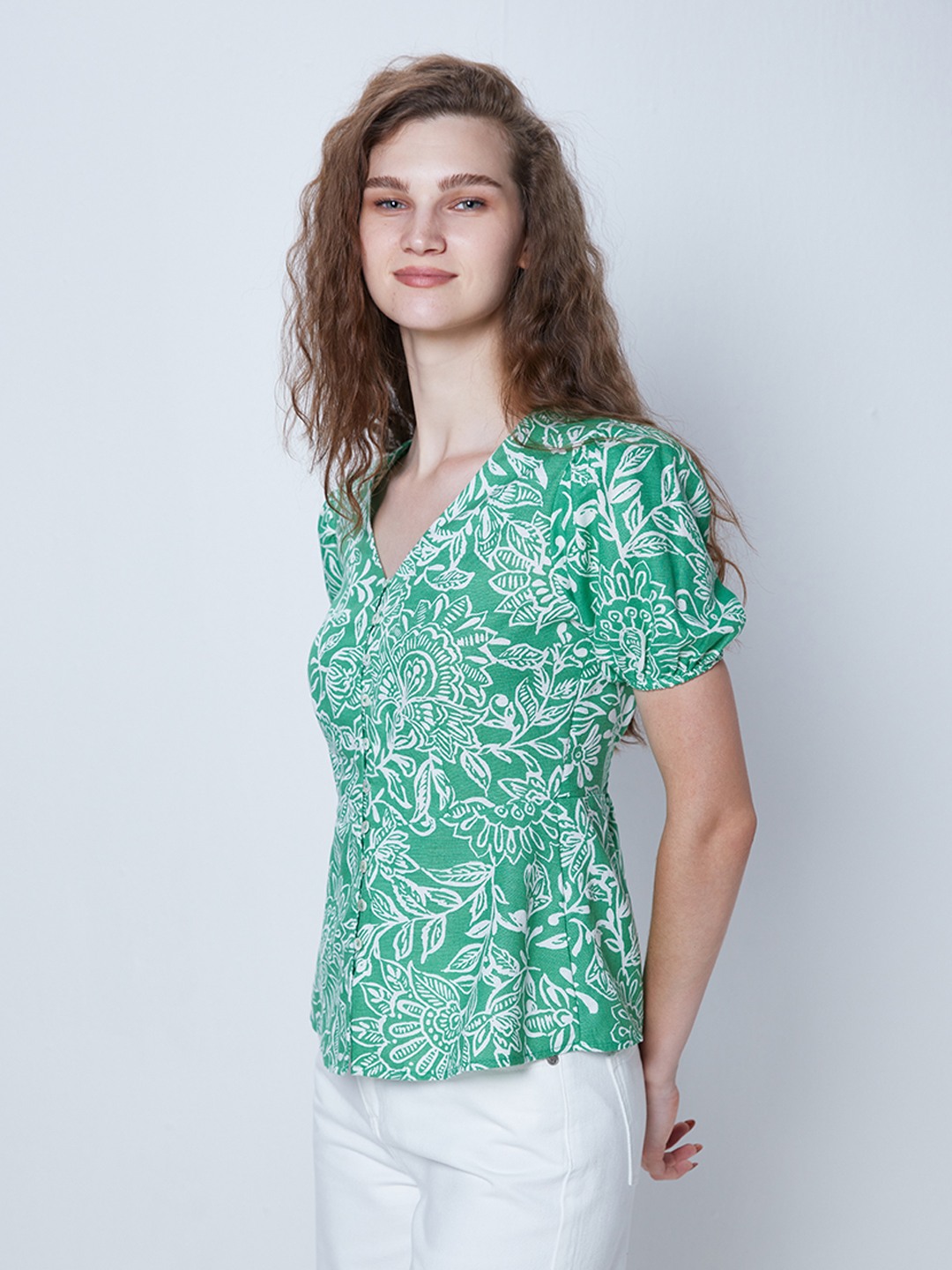 Green floral print button through peplum top featuring v-neck and short puff sleeves