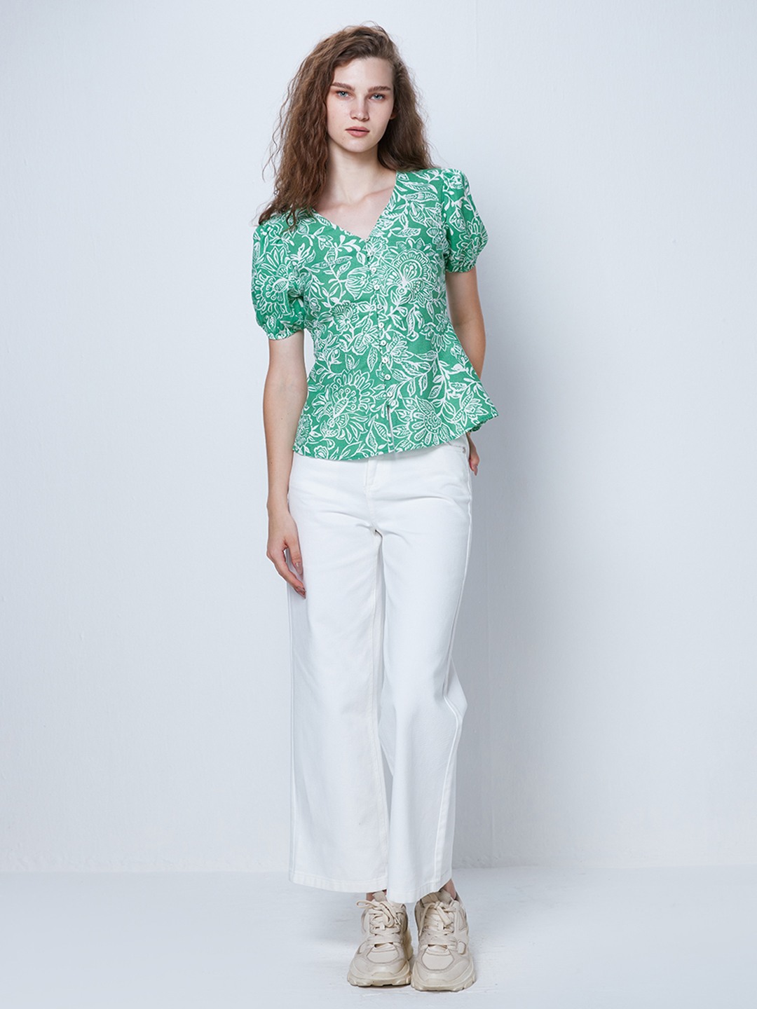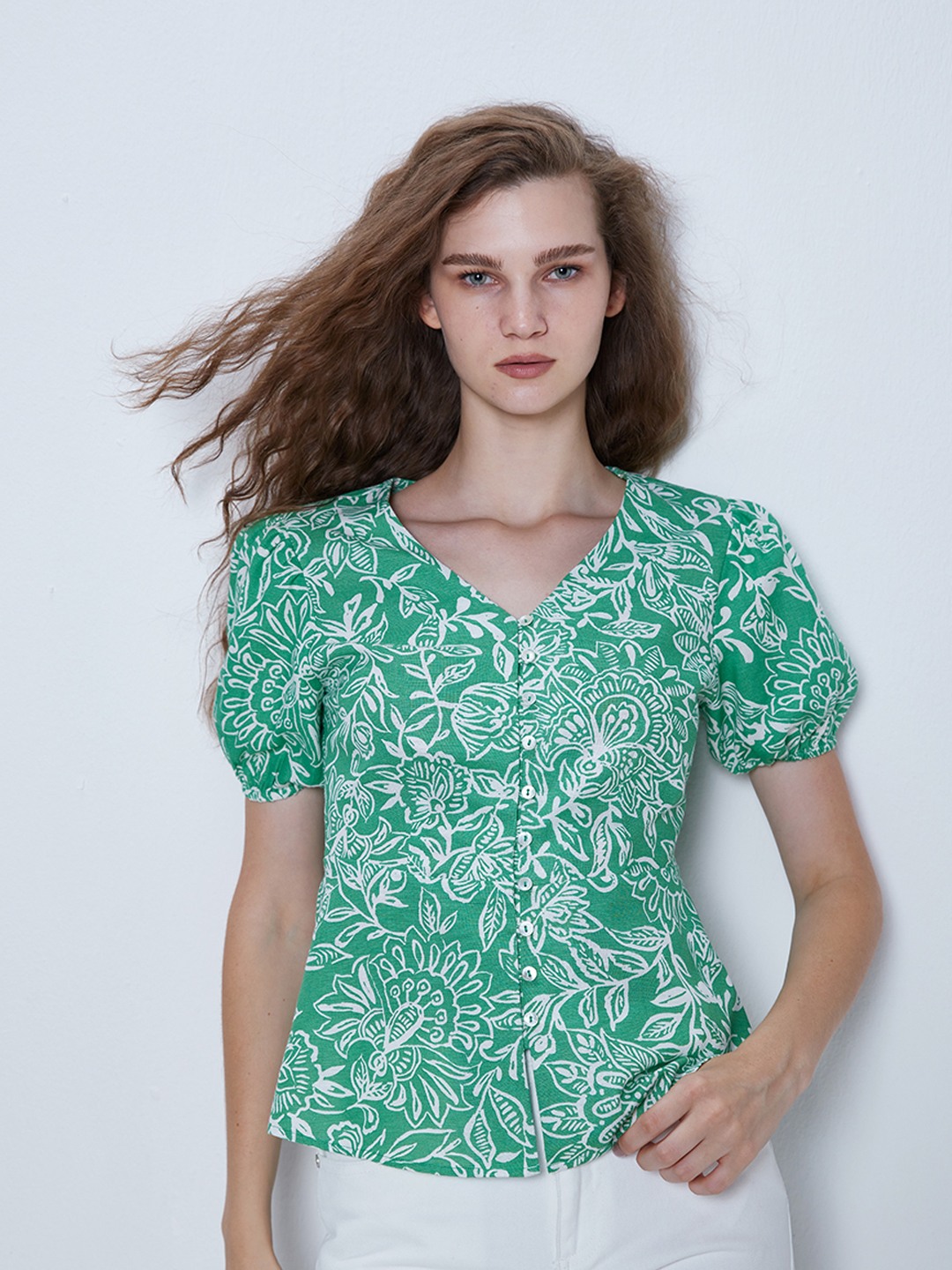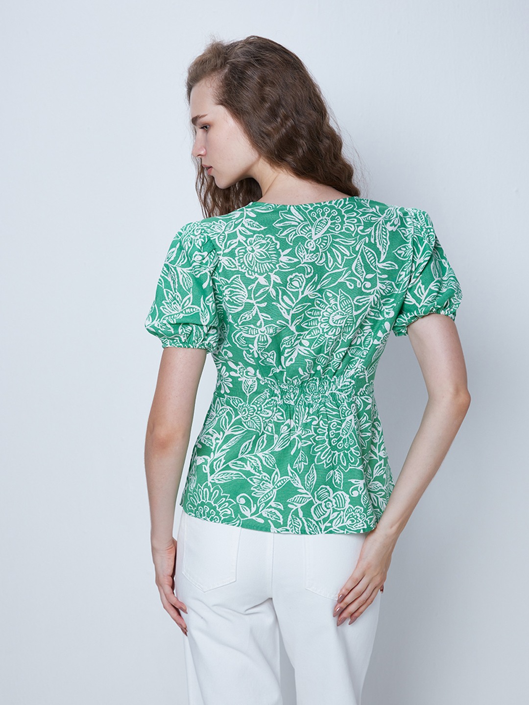 Green floral print button through peplum top featuring v-neck and short puff sleeves
