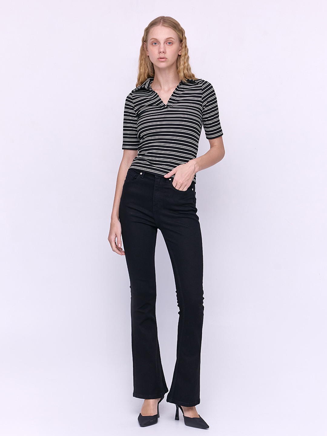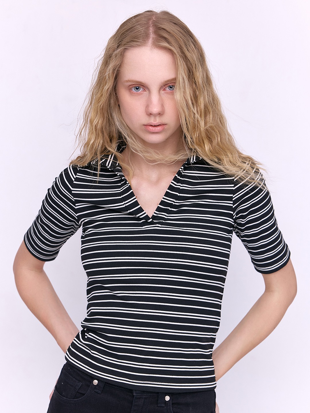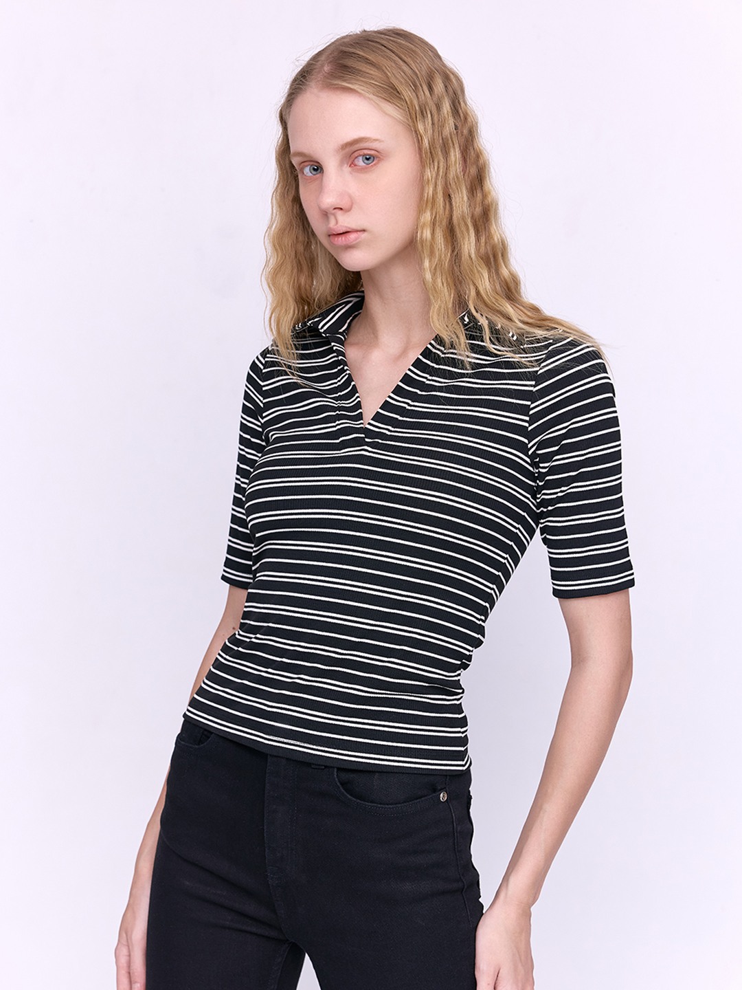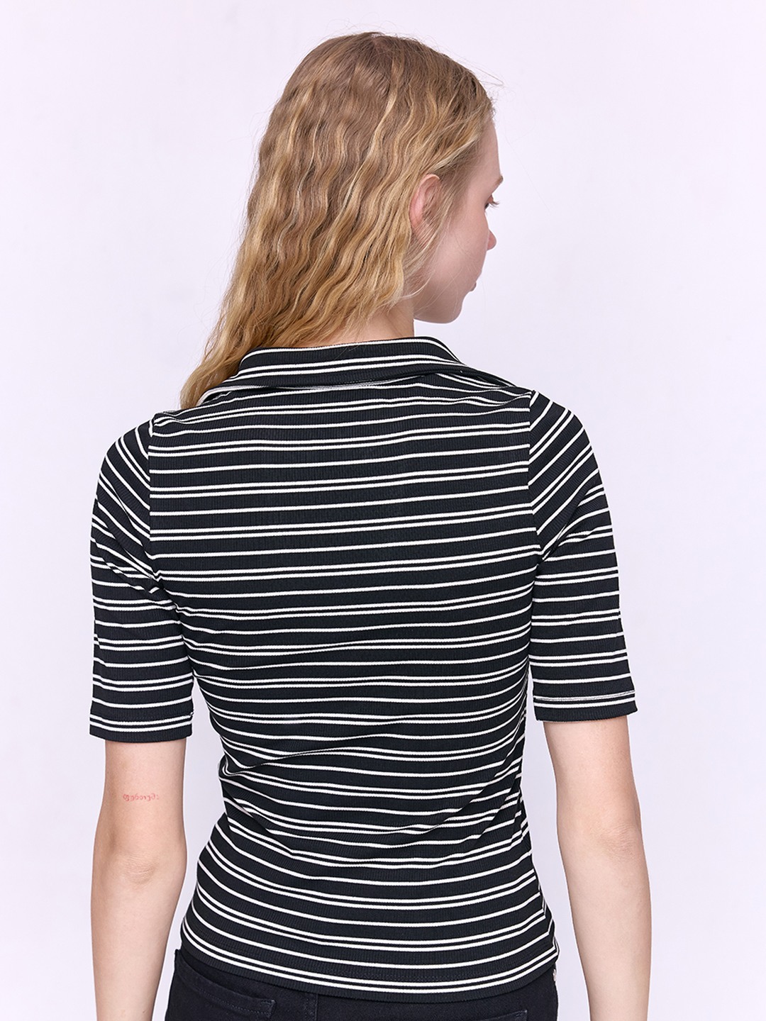 Black & white stripe polo collar jersey t-shirt featuring 3/4th sleeves
