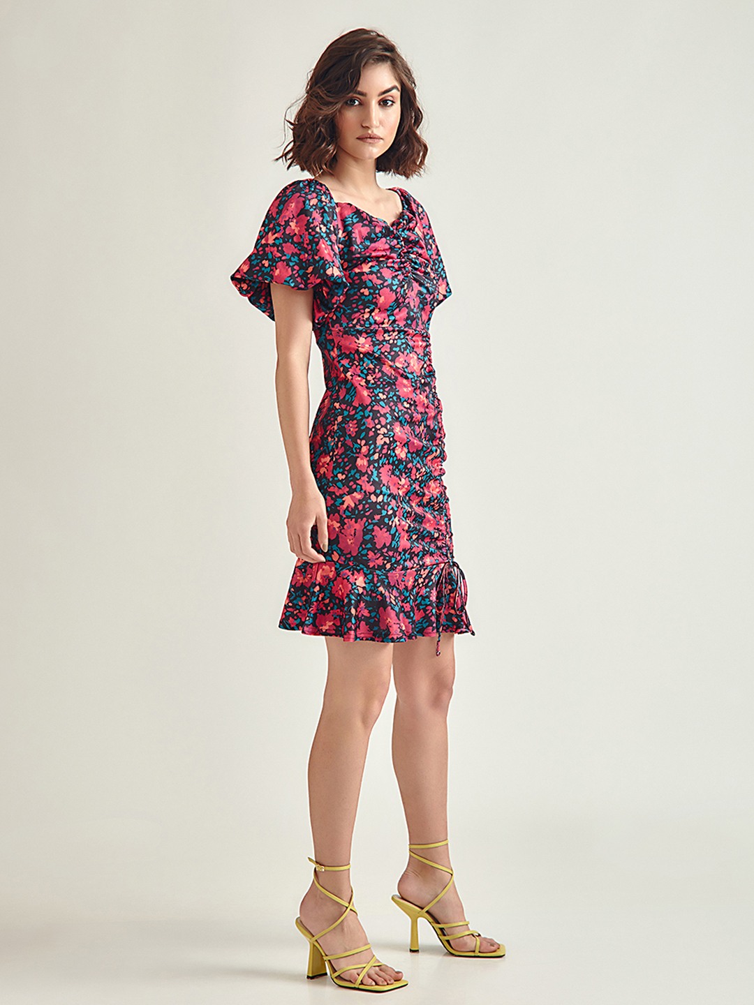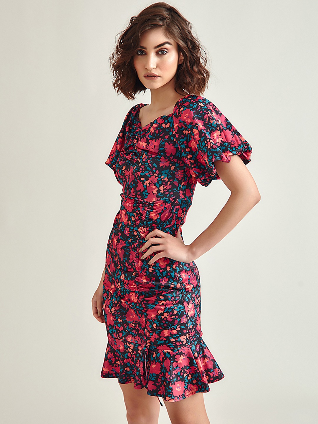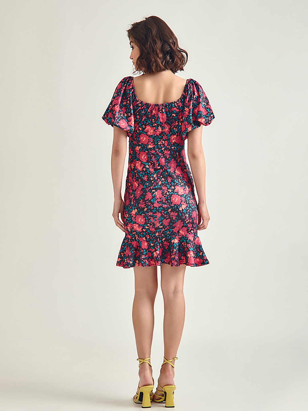 • Navy floral print bodycon mini off shoulder dress with short puff sleeves