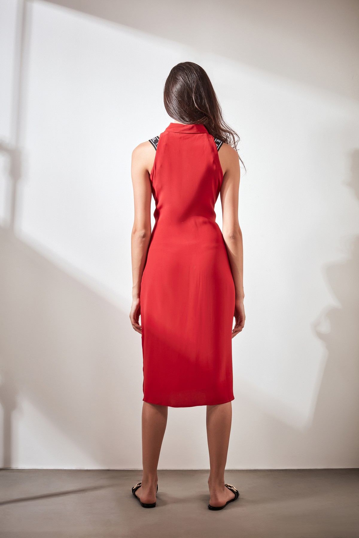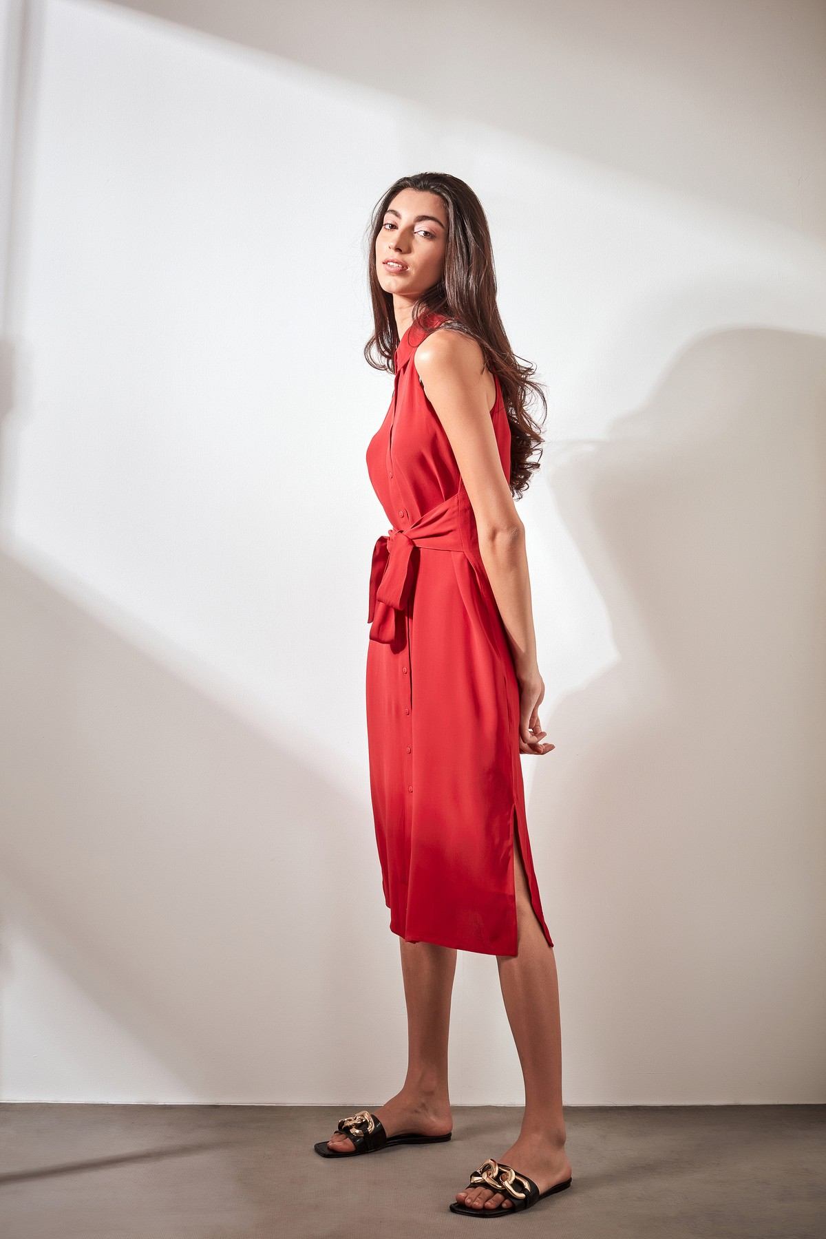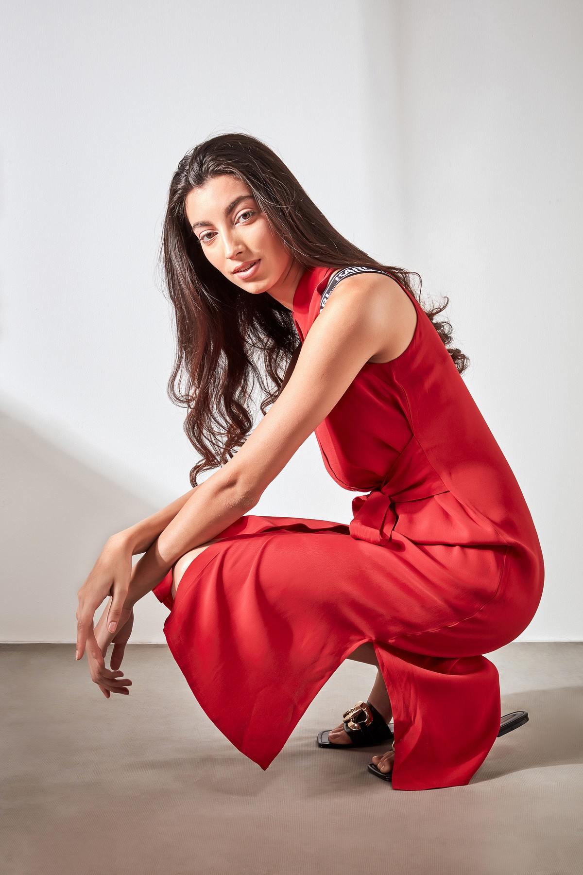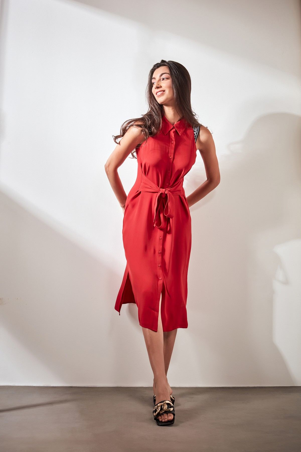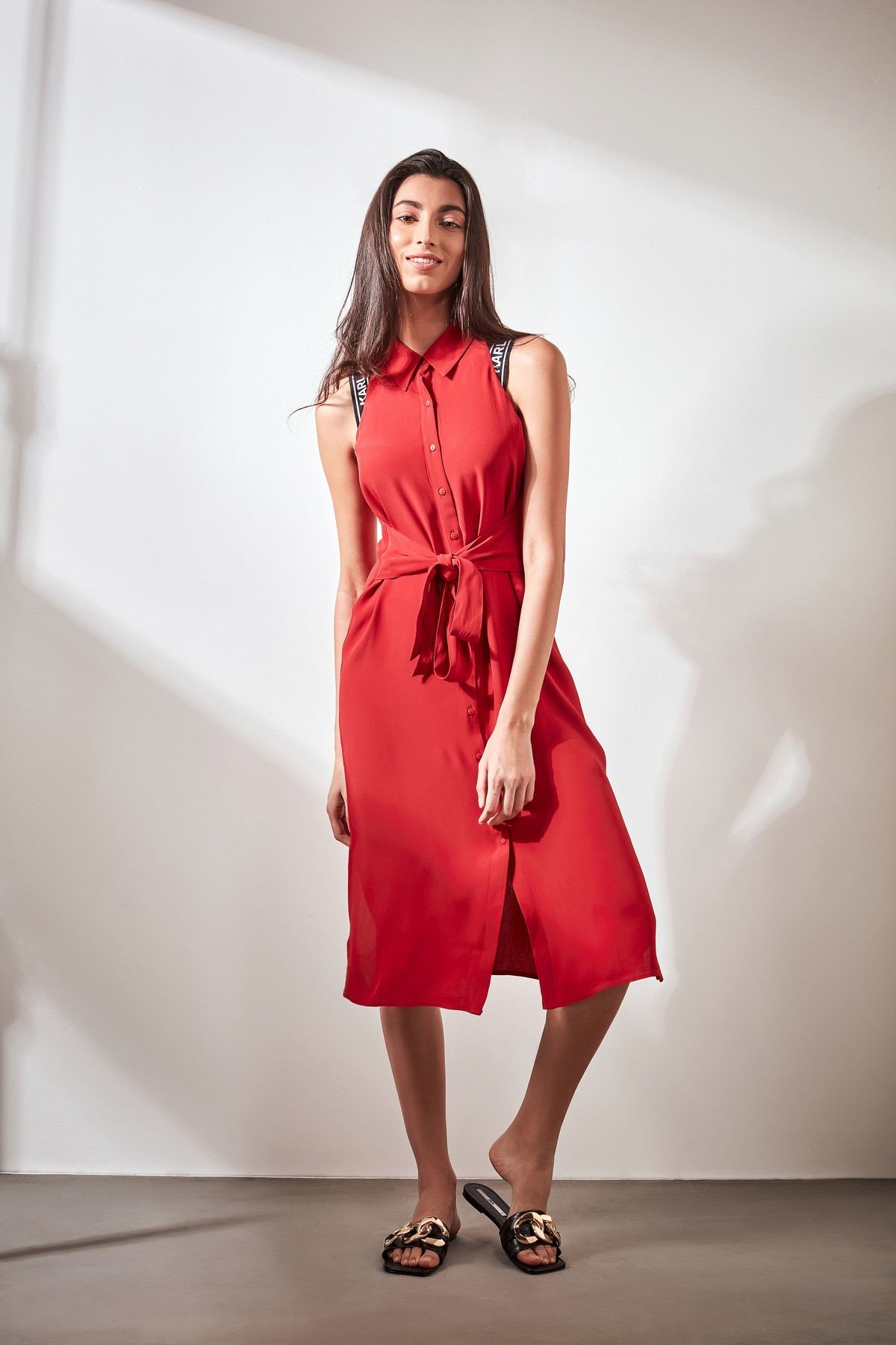 - Red sleeveless shirt dress featuring self tie belt and accessorized Karl logo straps