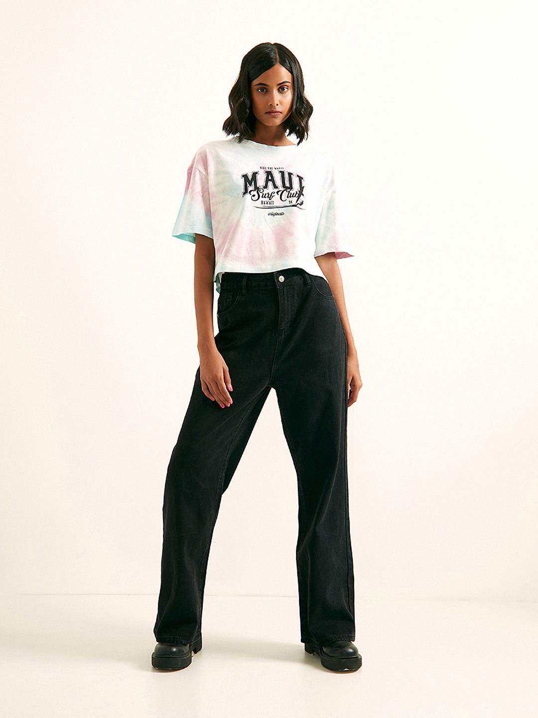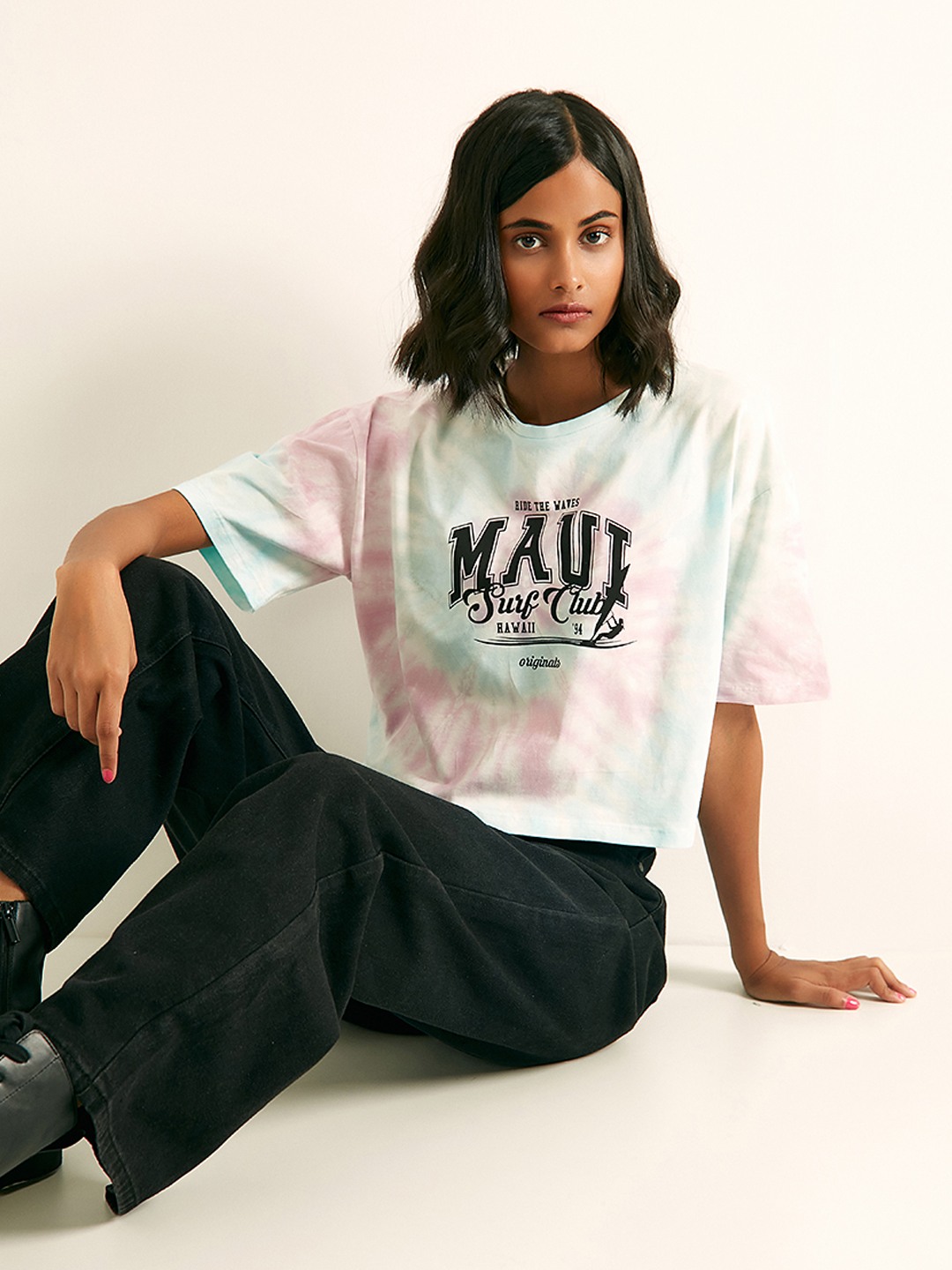 Blue tie and dye cropped tee featuring graphic statement 'maui' with round neckline and short sleeves