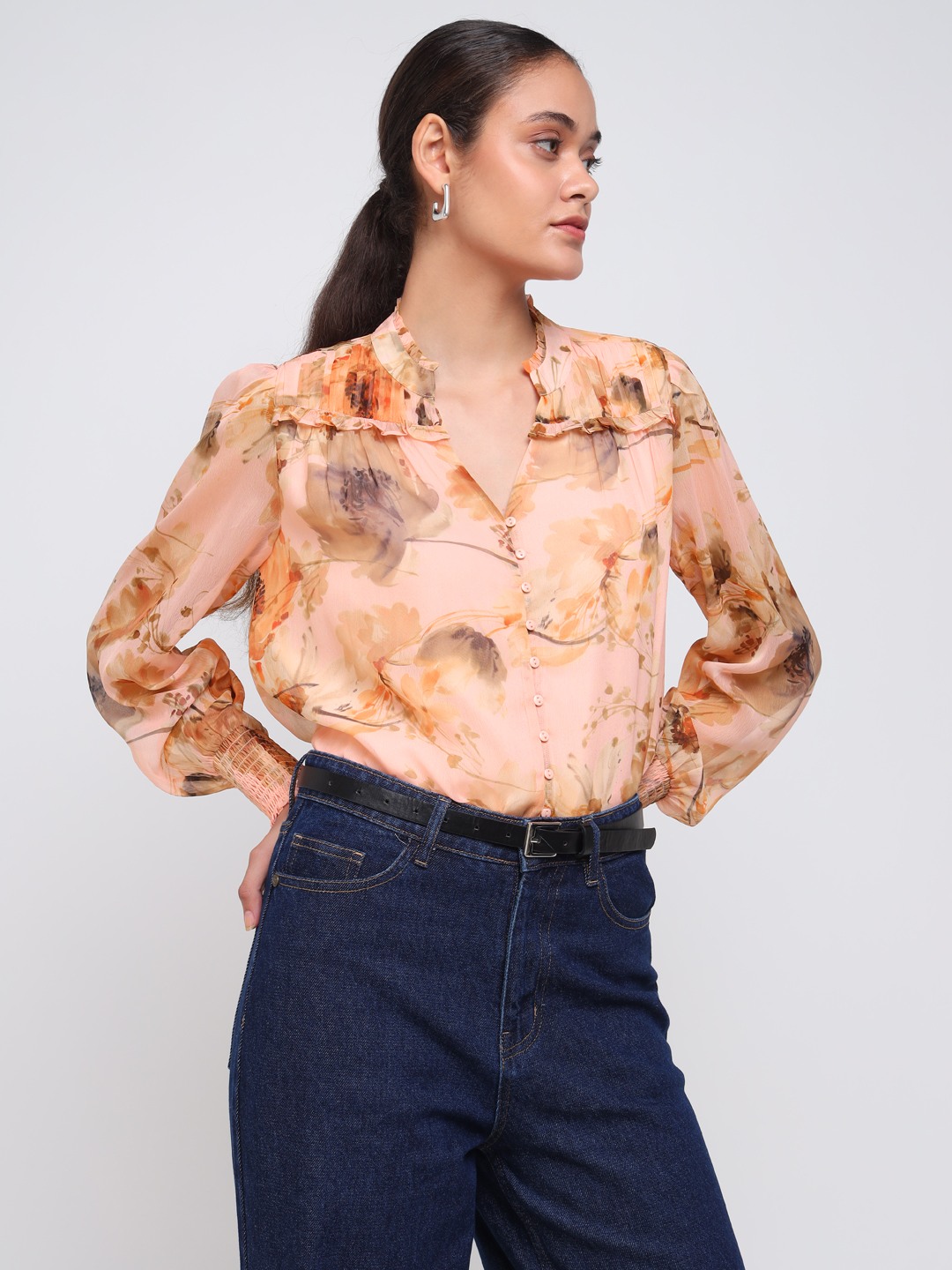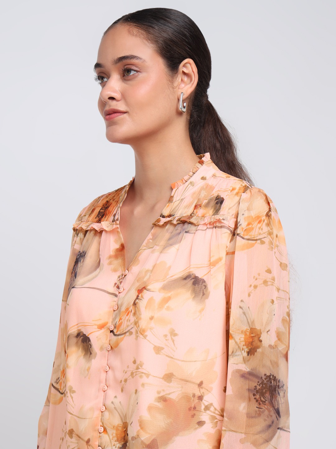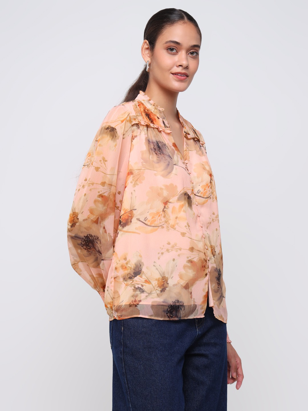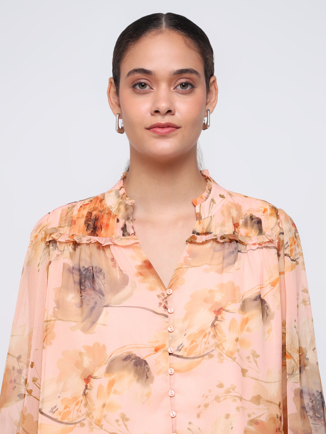 This soft peach floral Top features delicate button detailing and subtle ruffle accents for a romantic, vintage-inspired look.