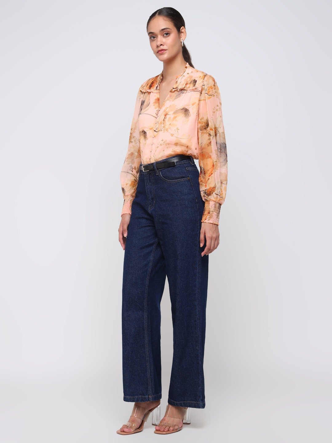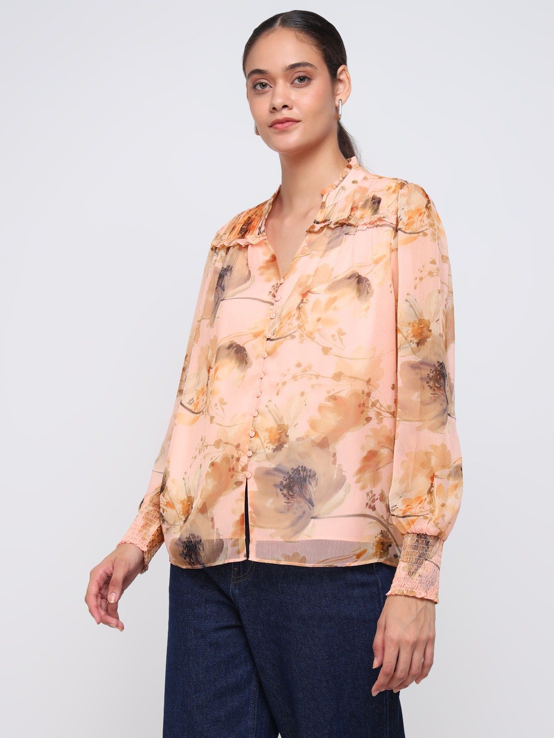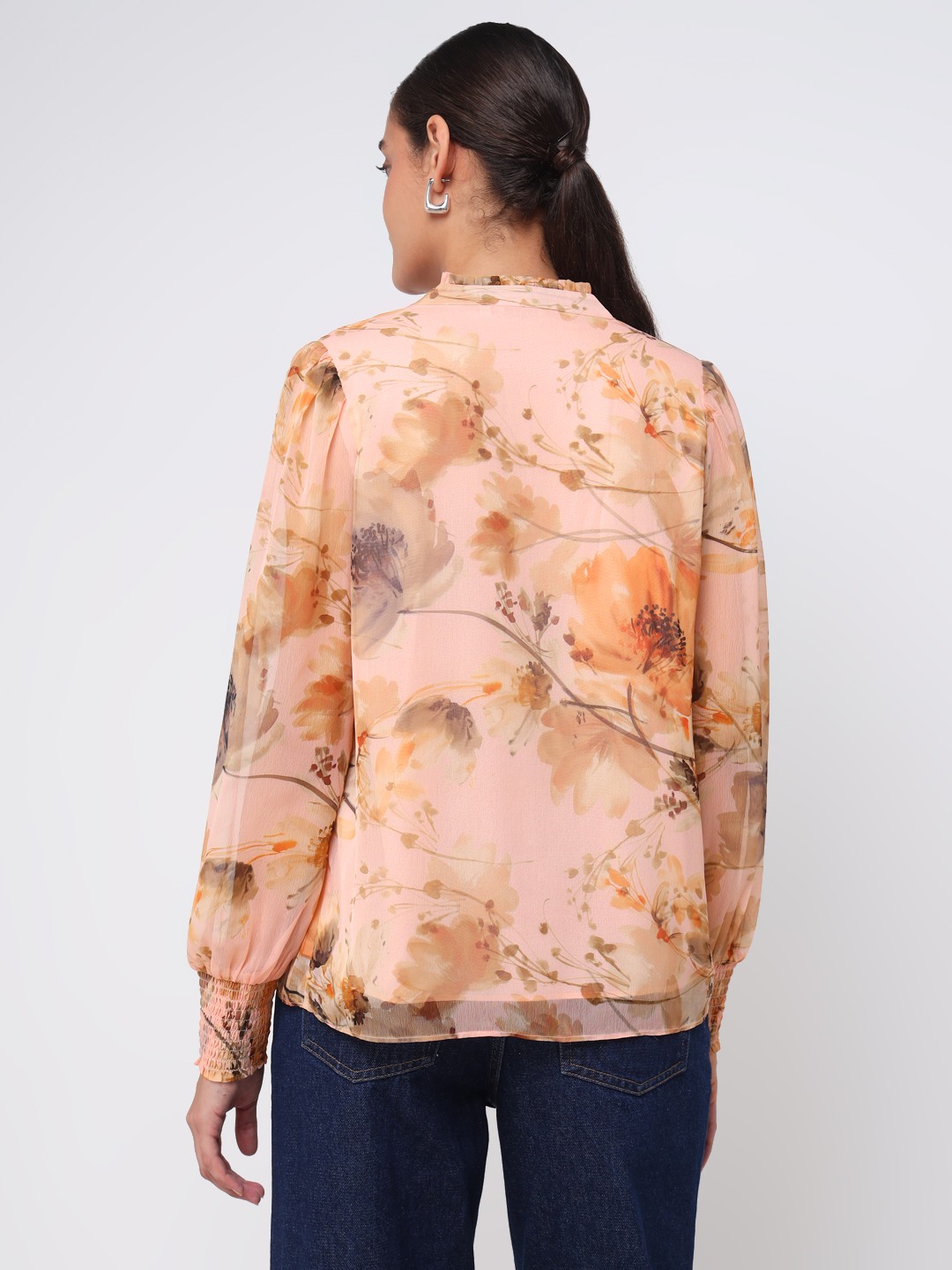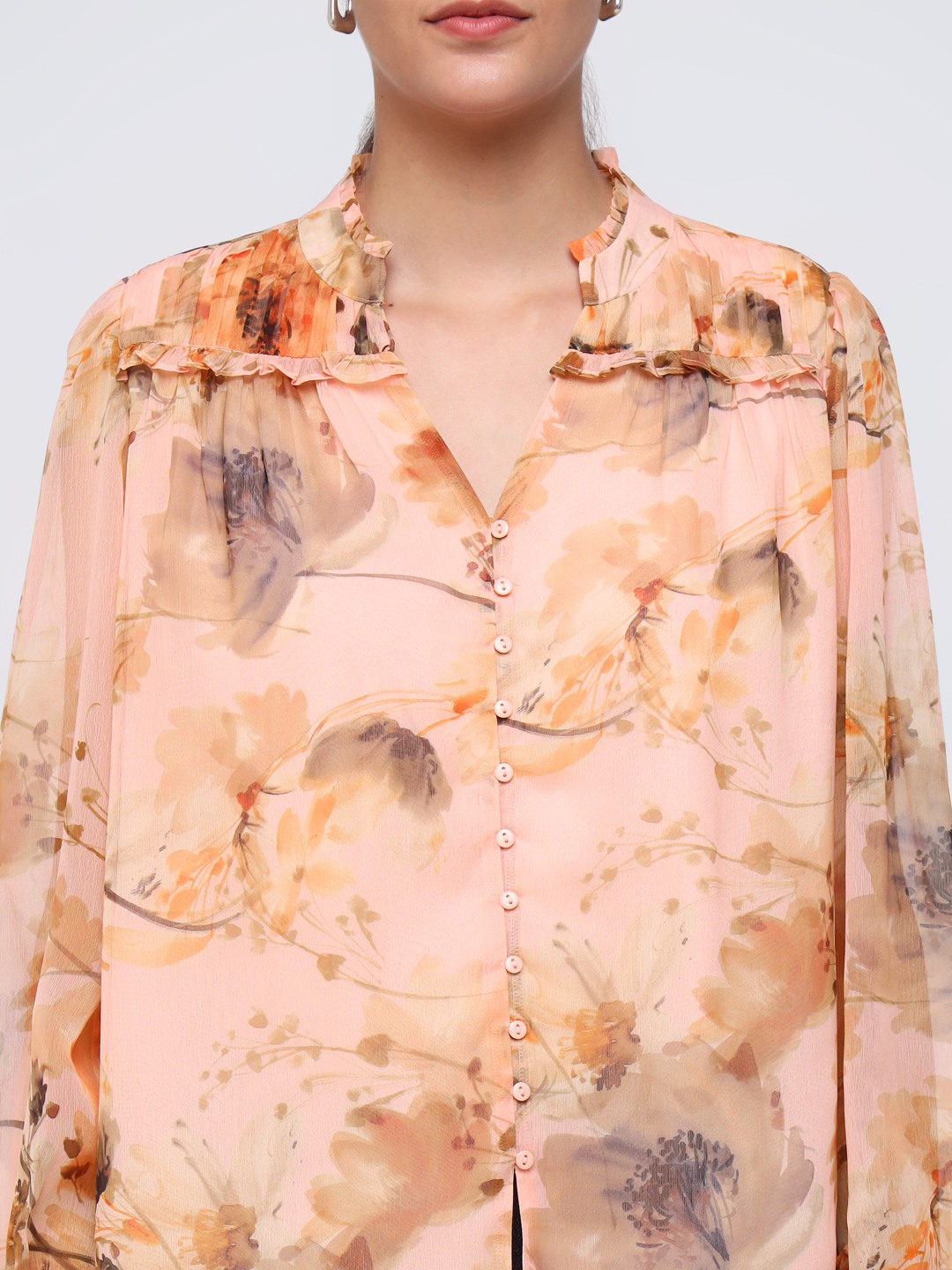 This soft peach floral Top features delicate button detailing and subtle ruffle accents for a romantic, vintage-inspired look.