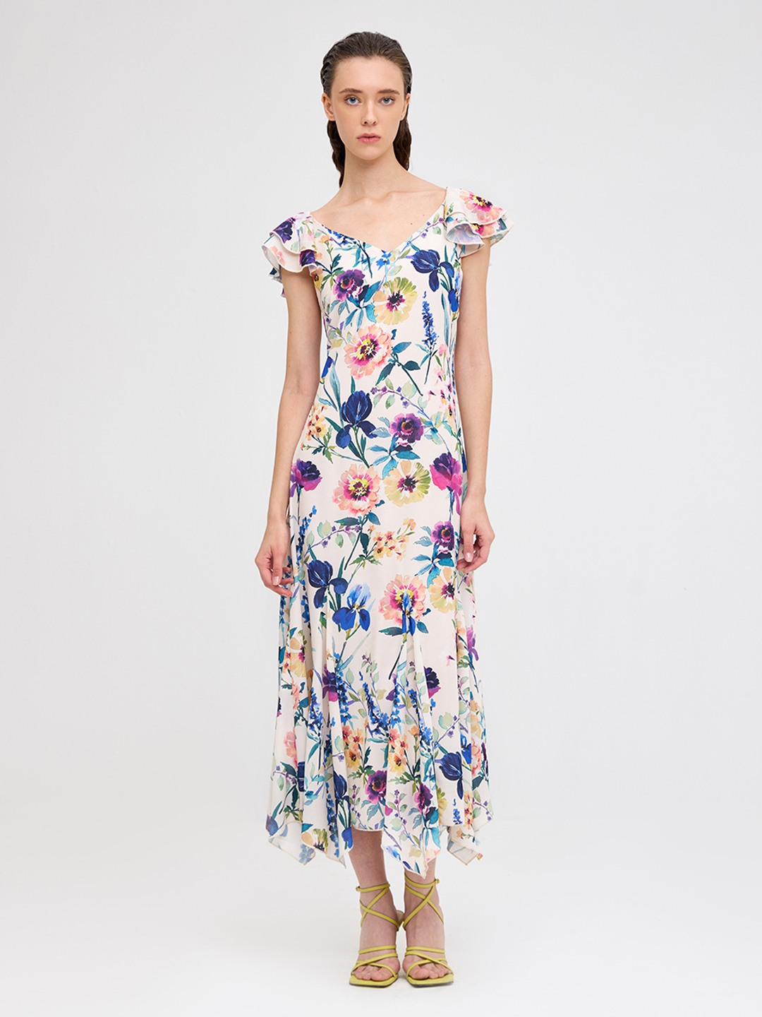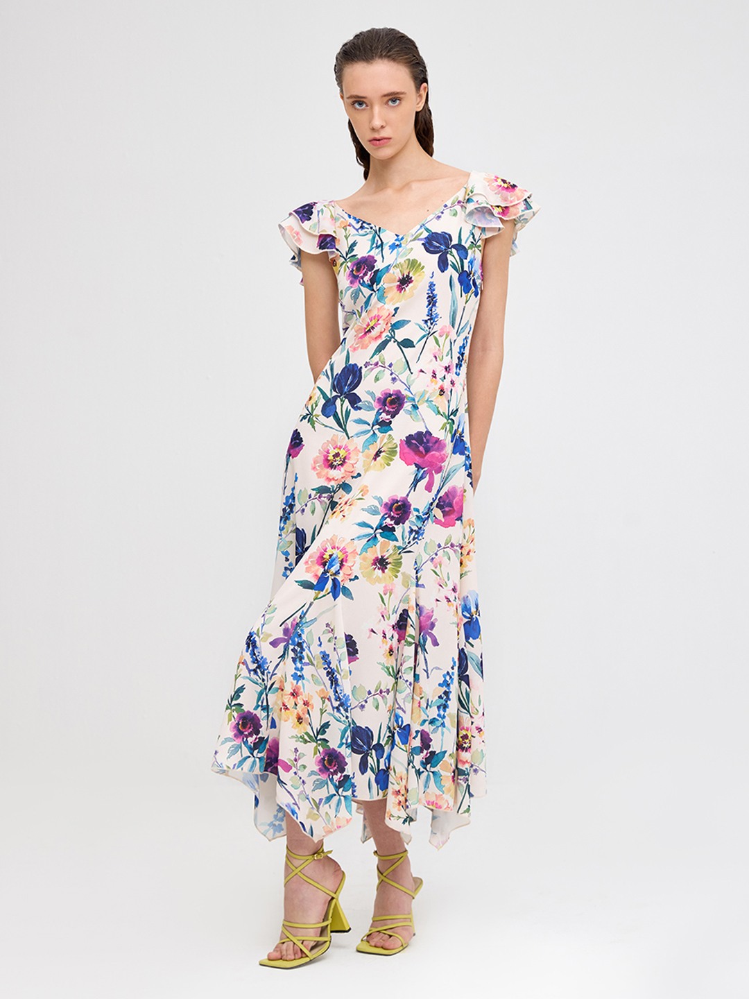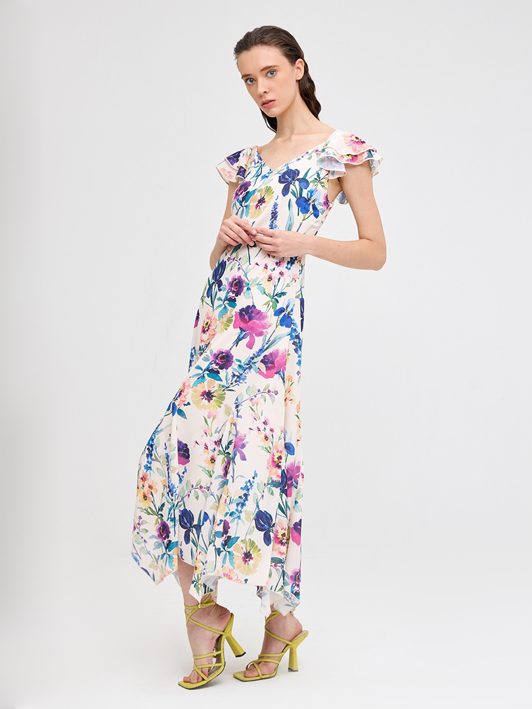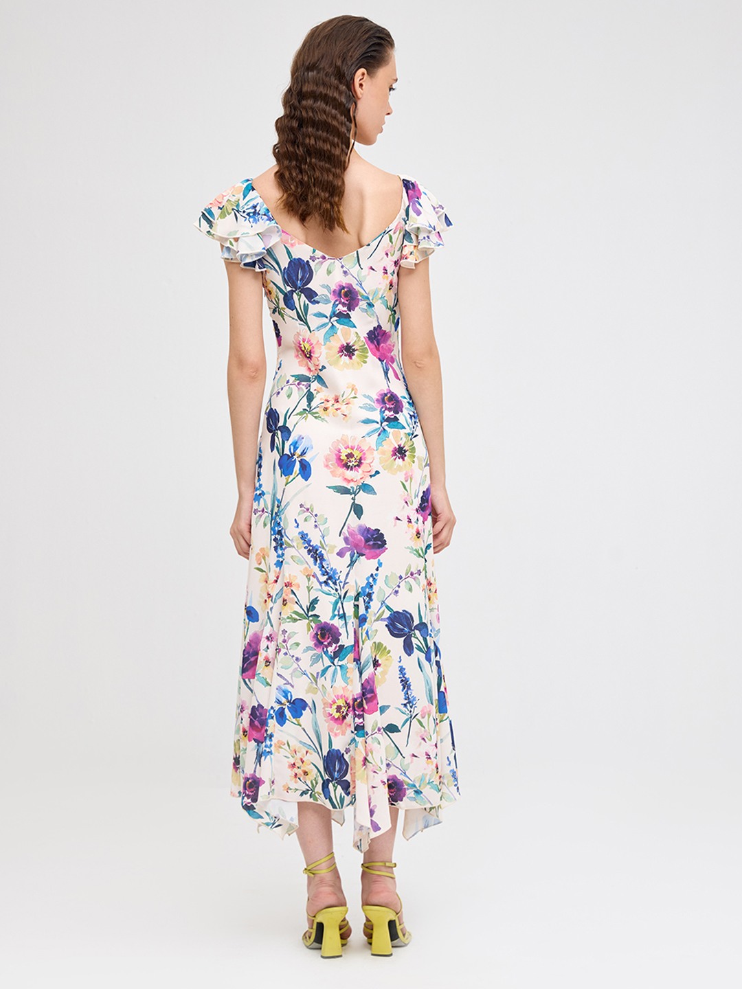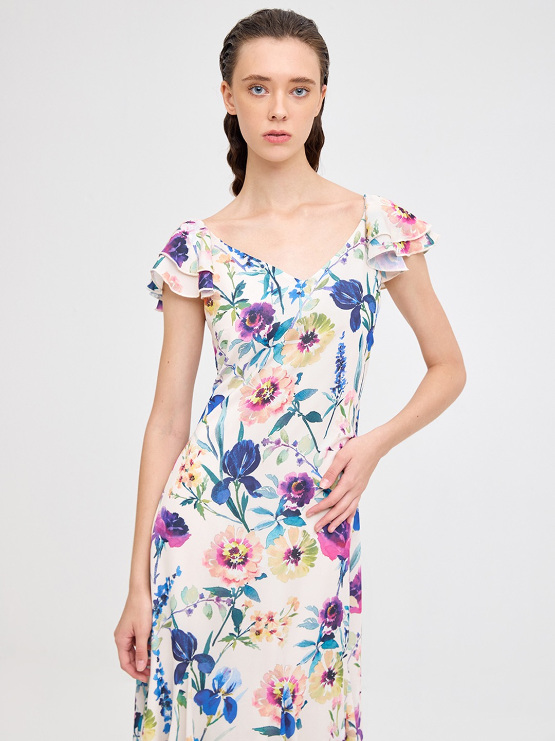 Off white floral print column maxi dress featuring sweetheart neck and short flutter sleeves