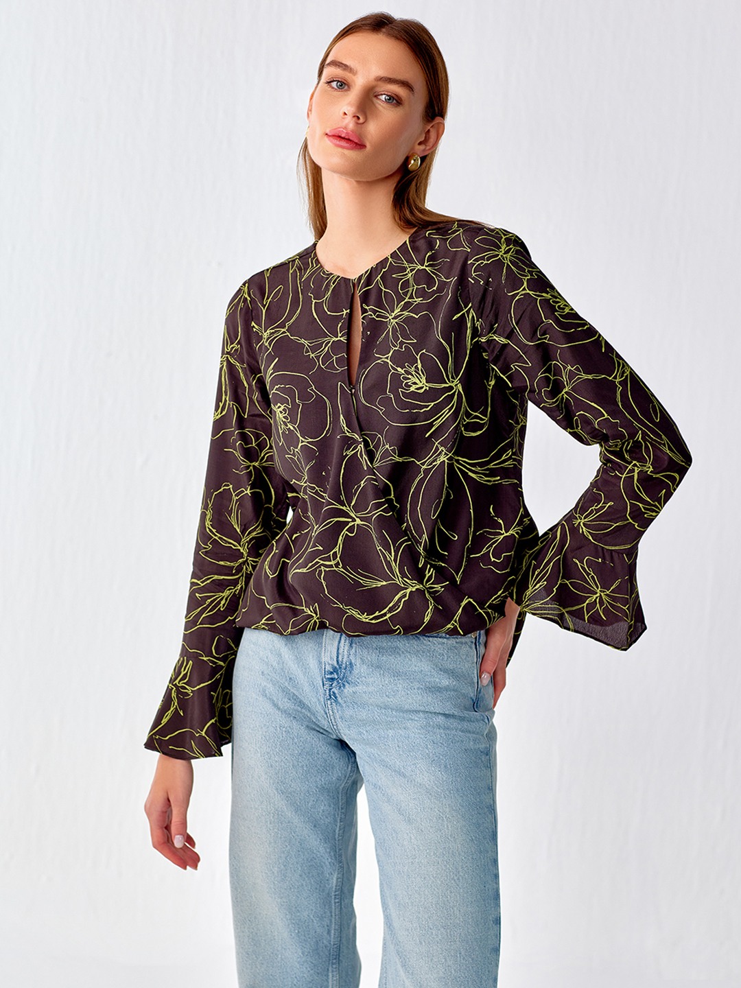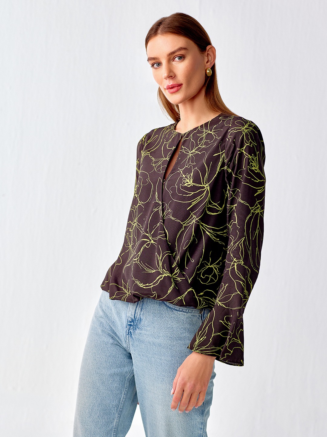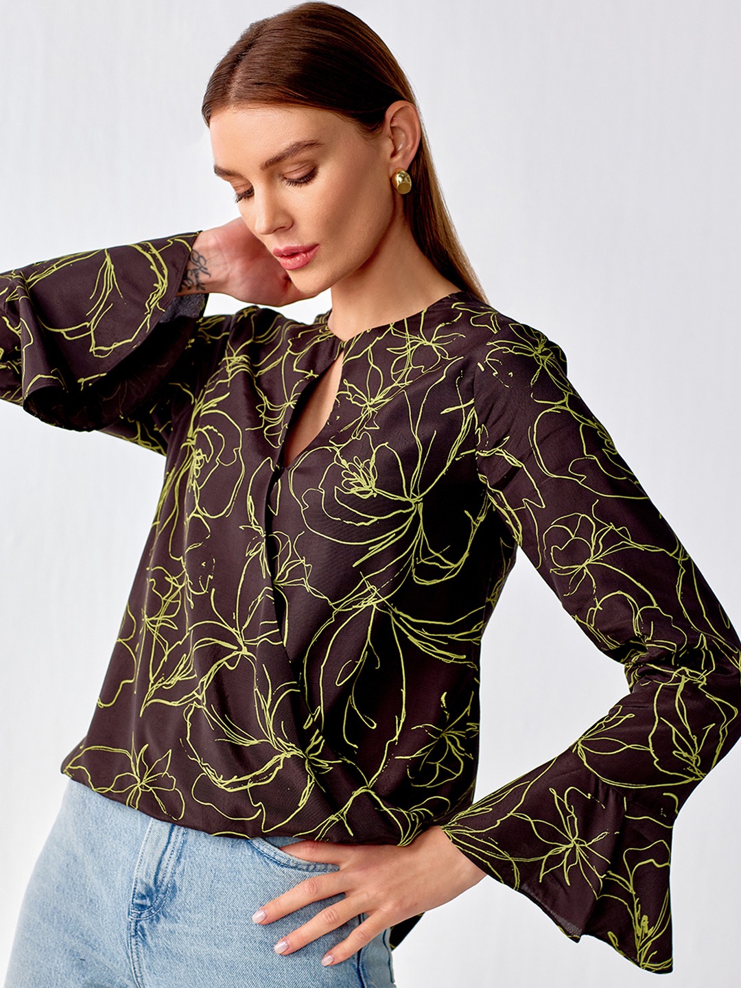 Olive printed cut out wrap top featuring flared sleeves