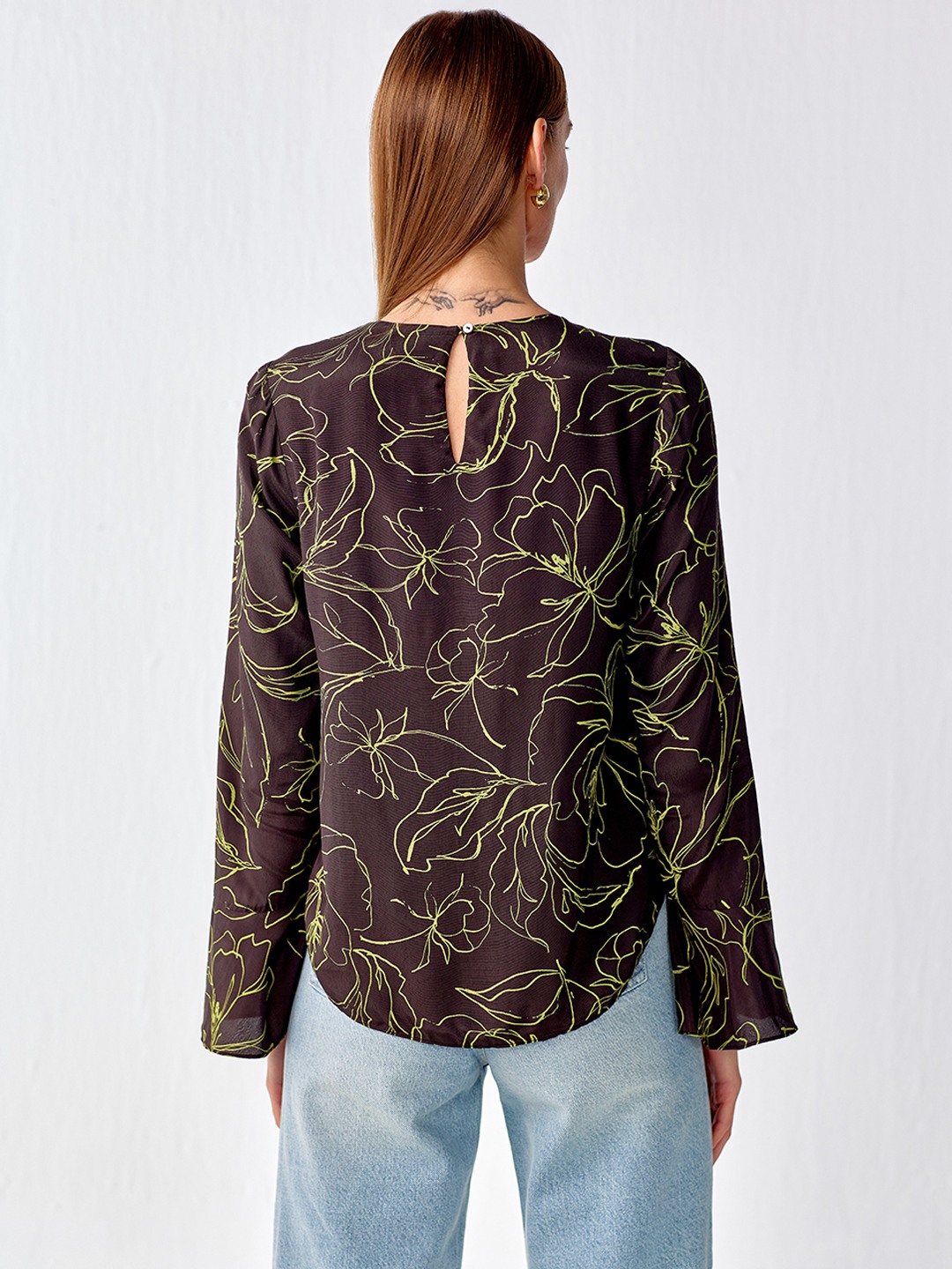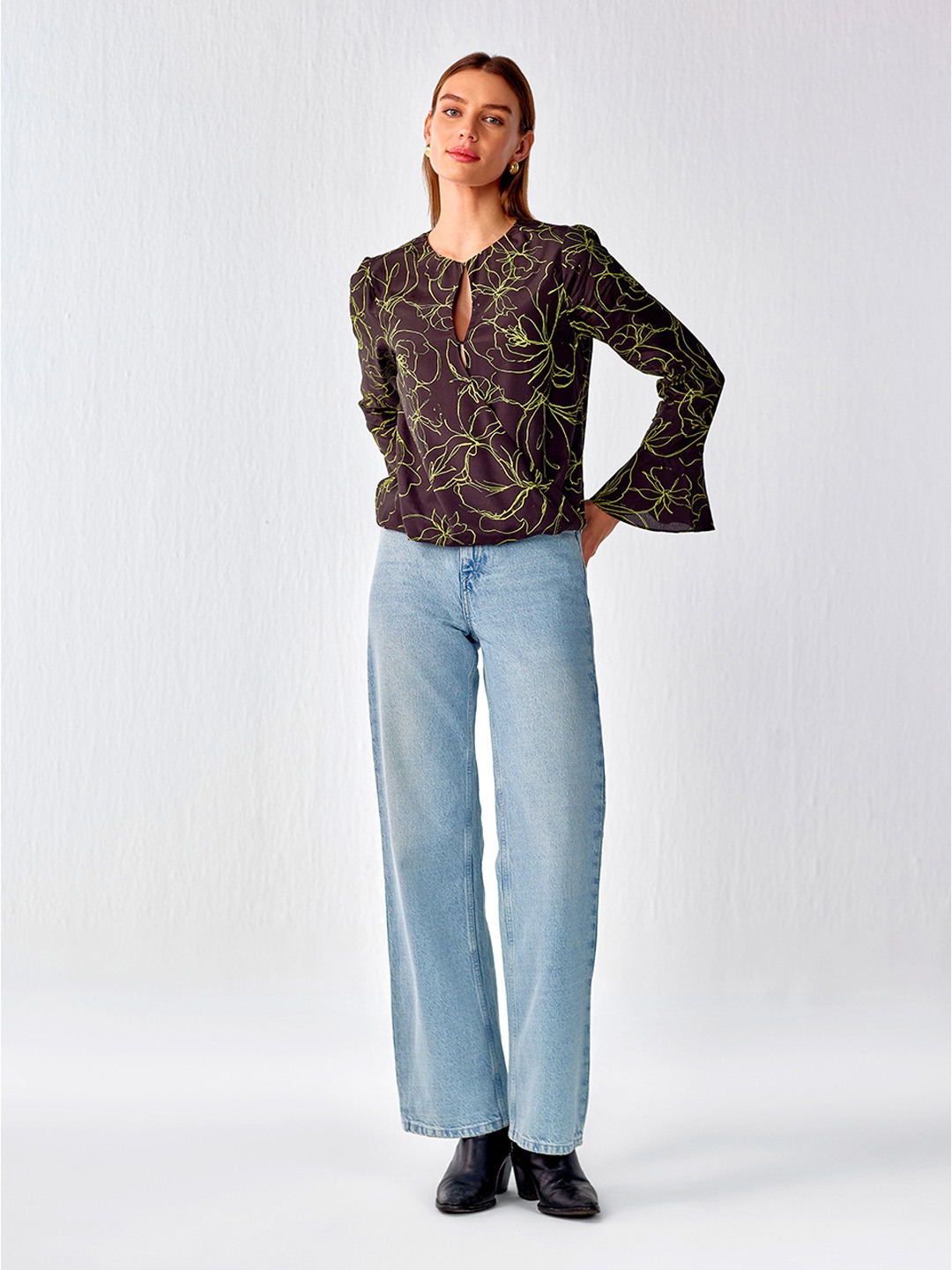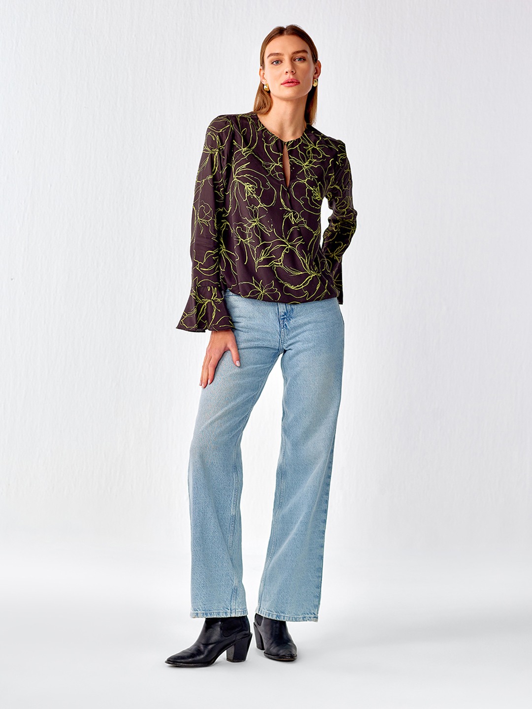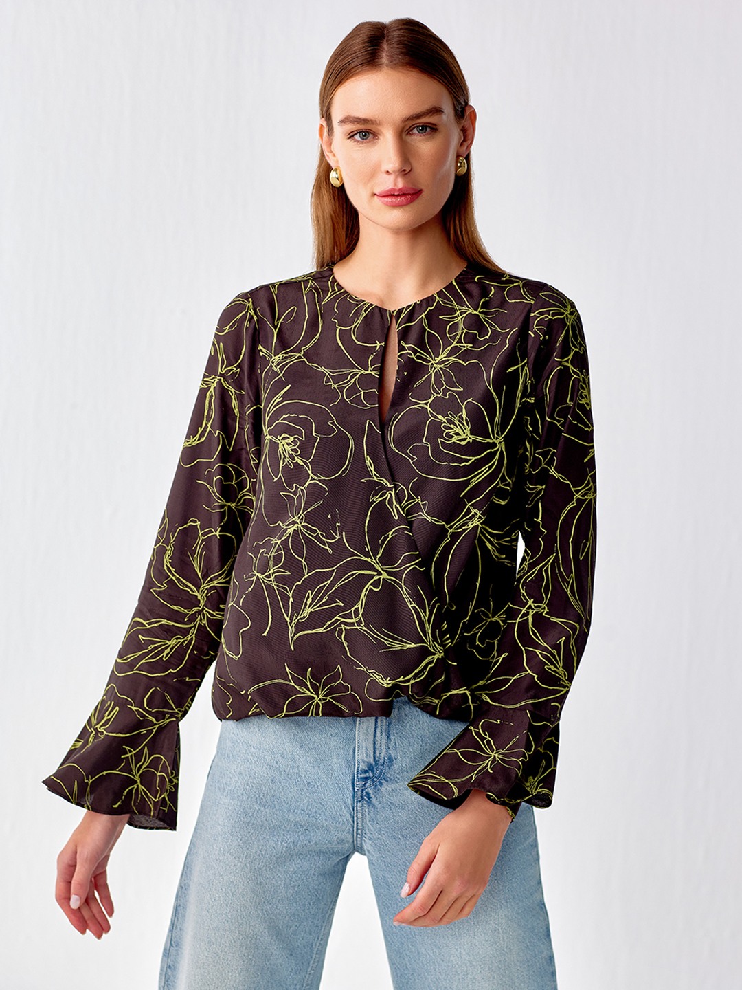 Olive printed cut out wrap top featuring flared sleeves