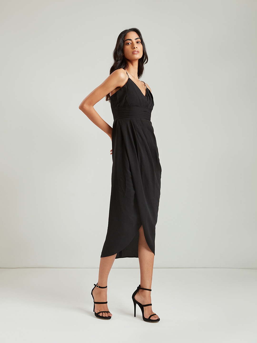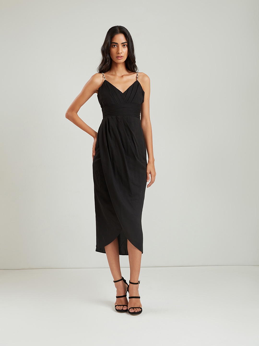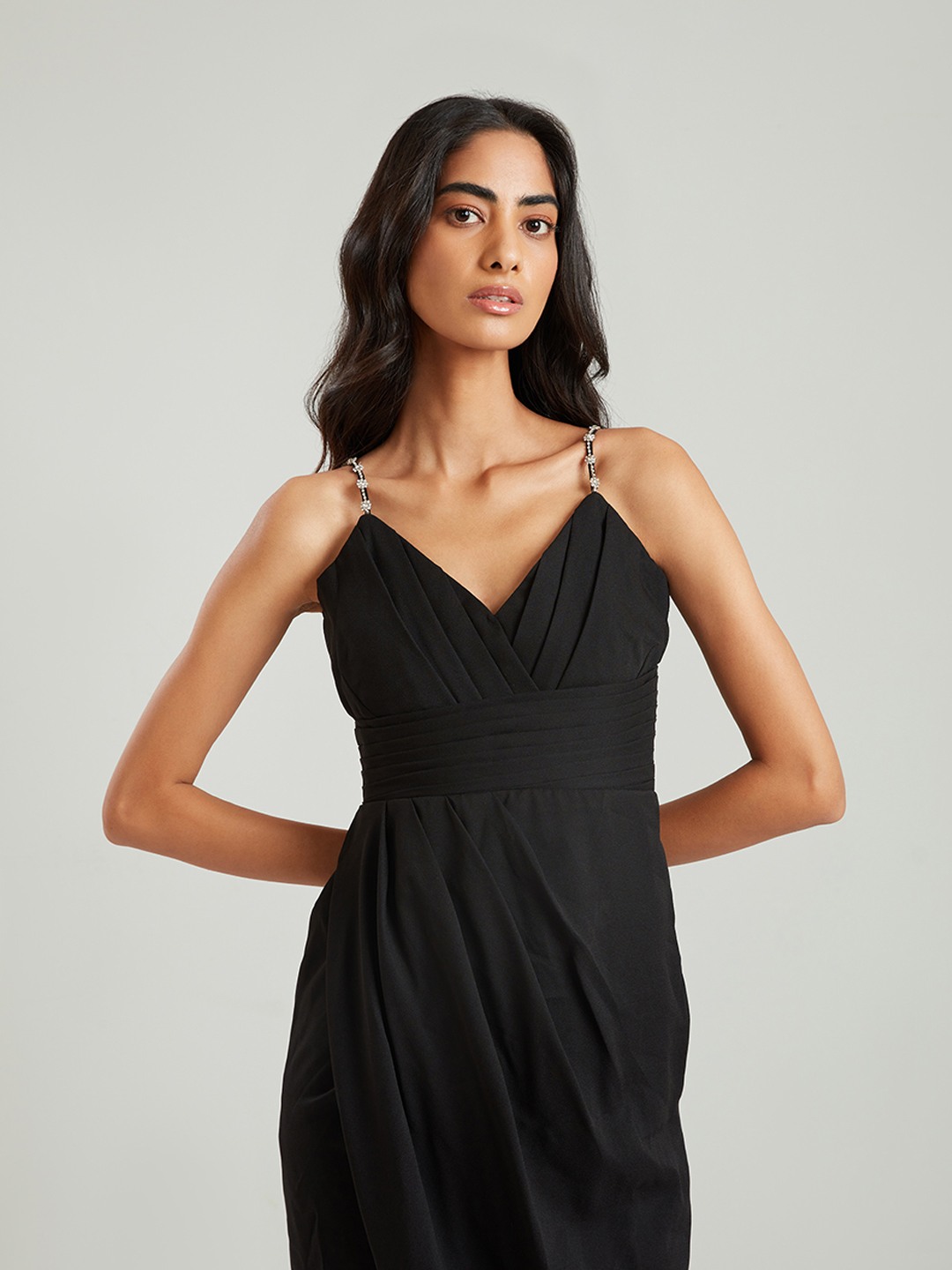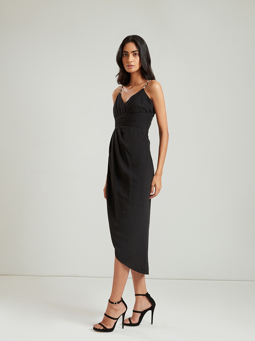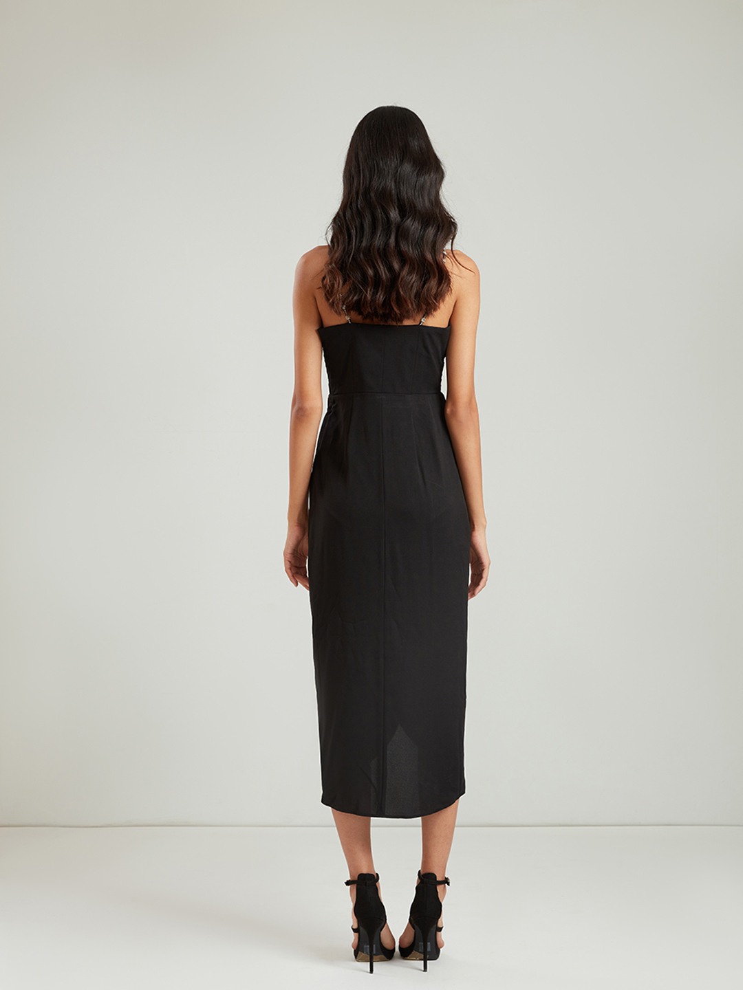 Black bodycon pleated midi wrap dress featuring a V-neck with embellished straps