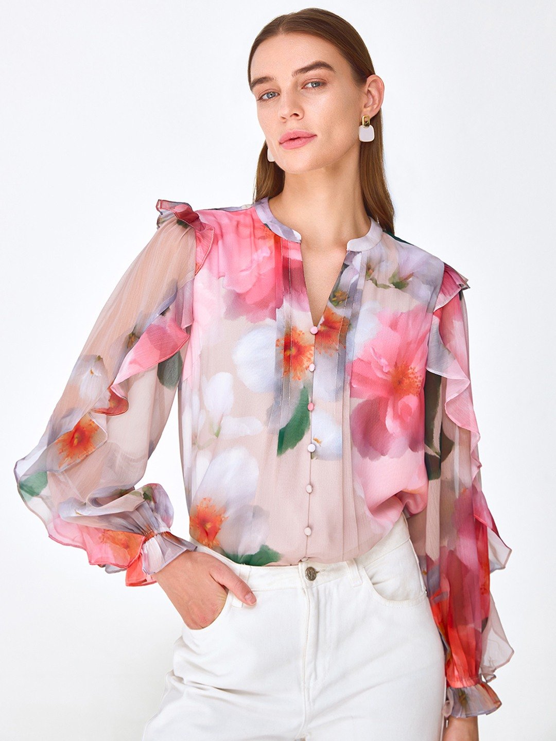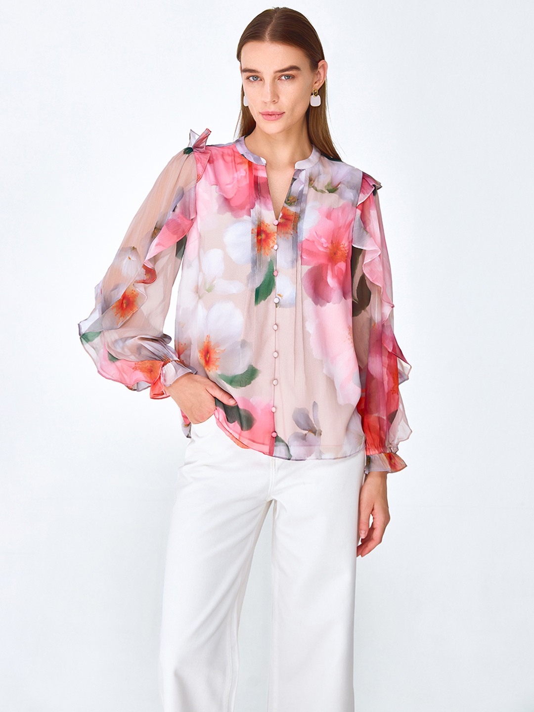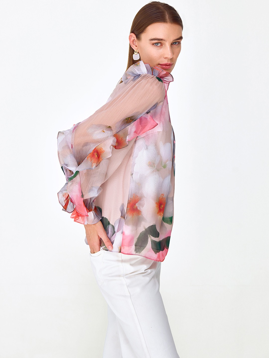 Pink floral print blouse shirt featuring long elasticated sleeves with soft ruffle detail
