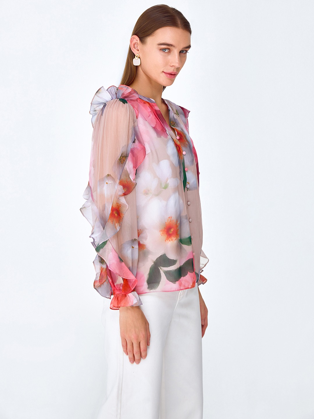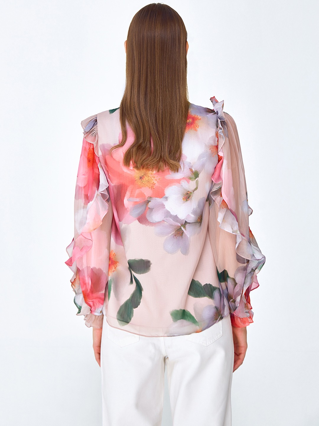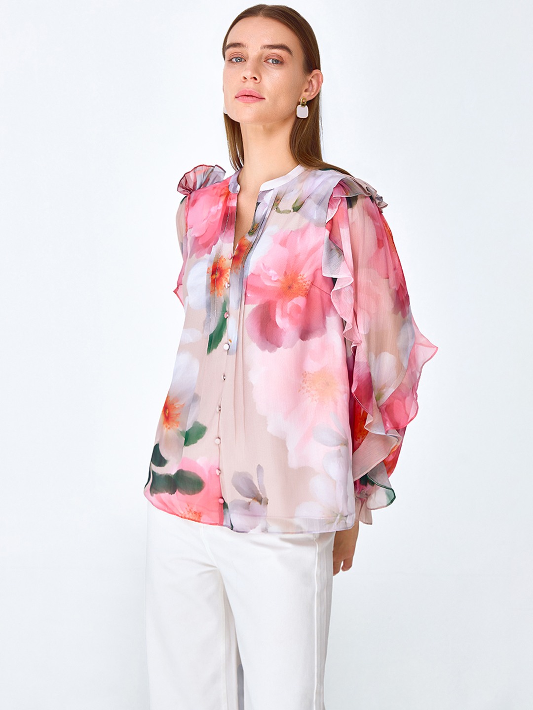 Pink floral print blouse shirt featuring long elasticated sleeves with soft ruffle detail