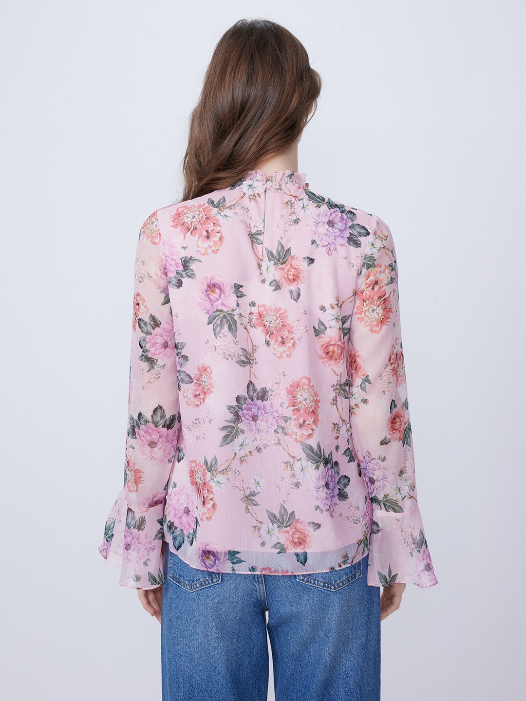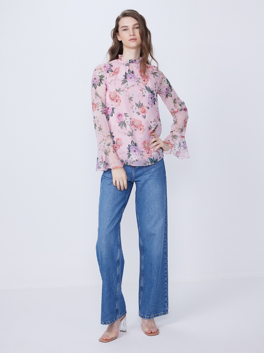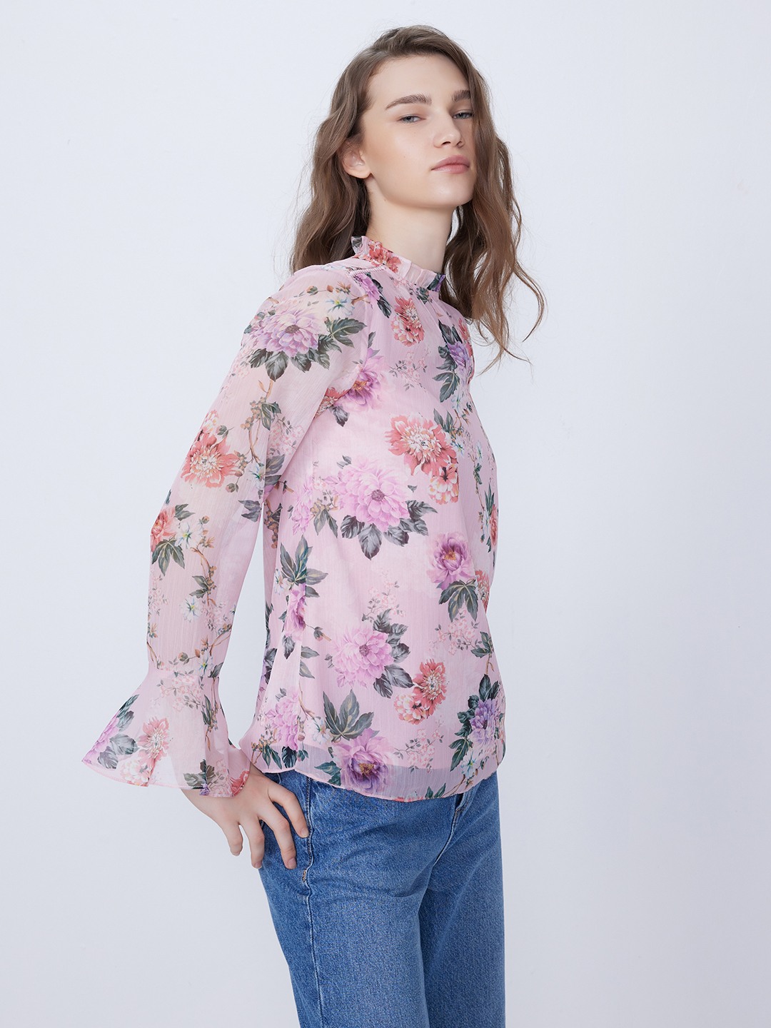 Pink Floral Printed Round Neck Top With Long Elasticated Sleeves