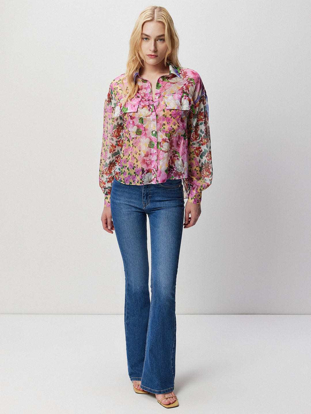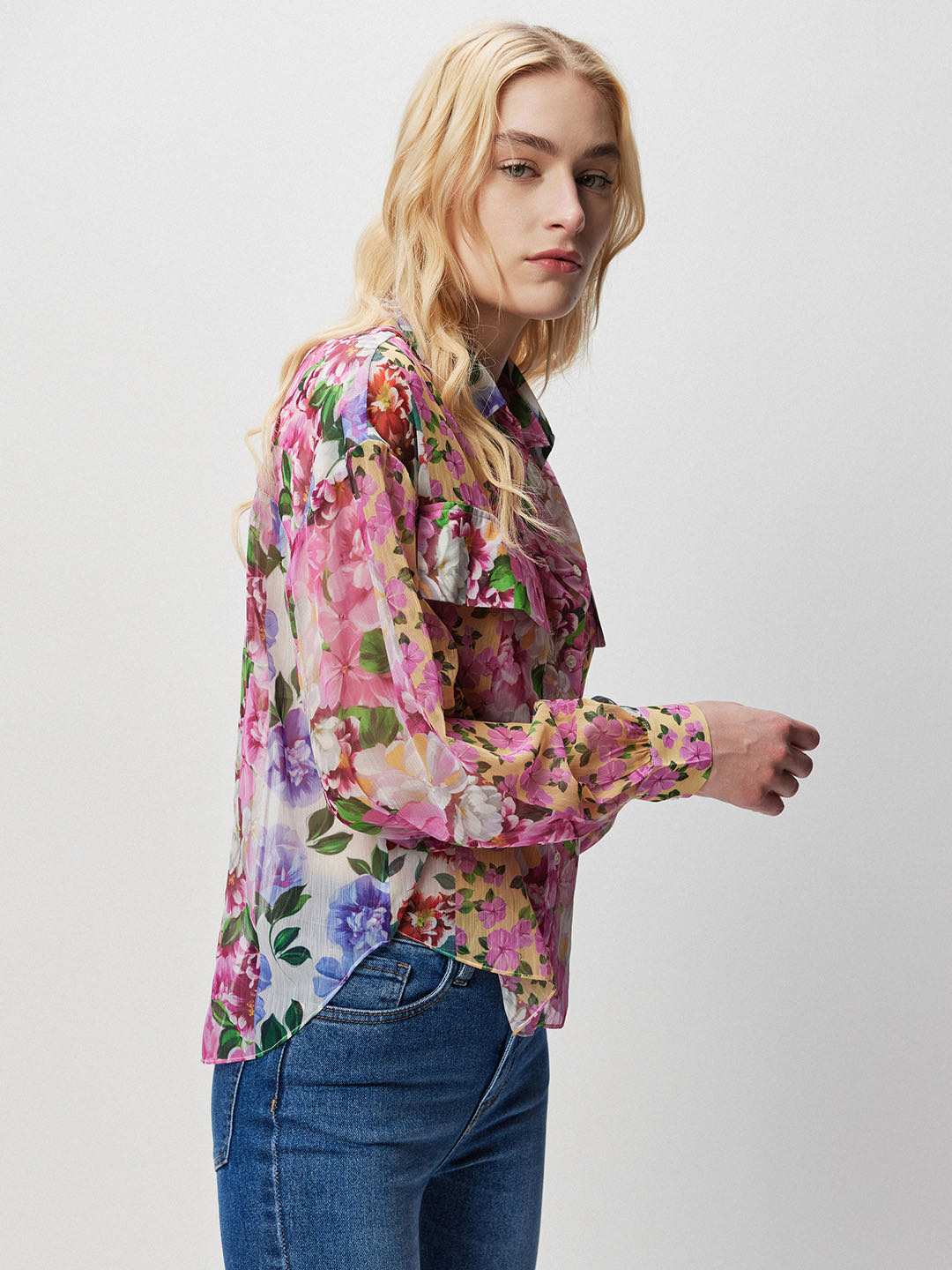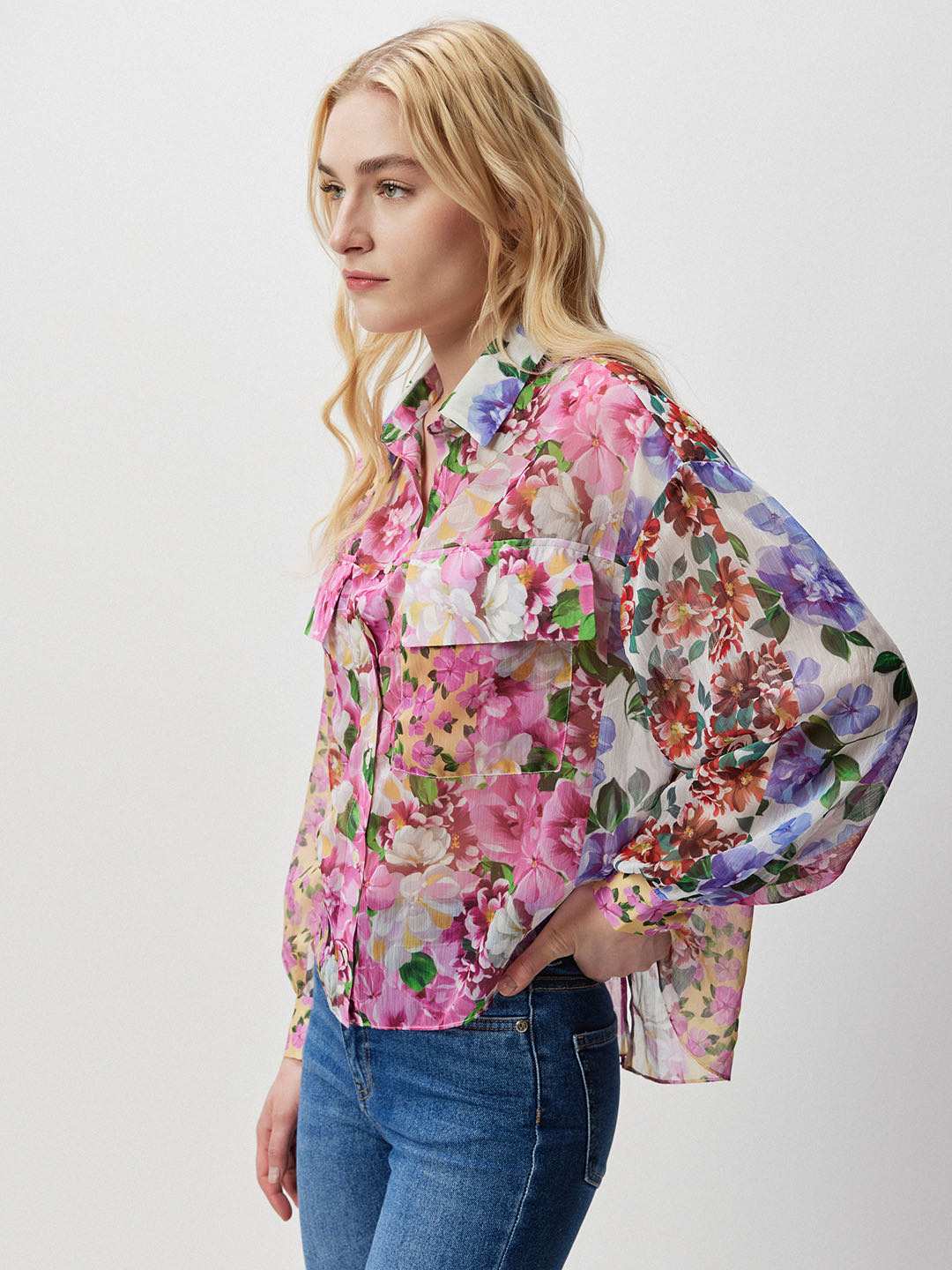 Pink patchwork floral print collared shirt featuring front flap pockets