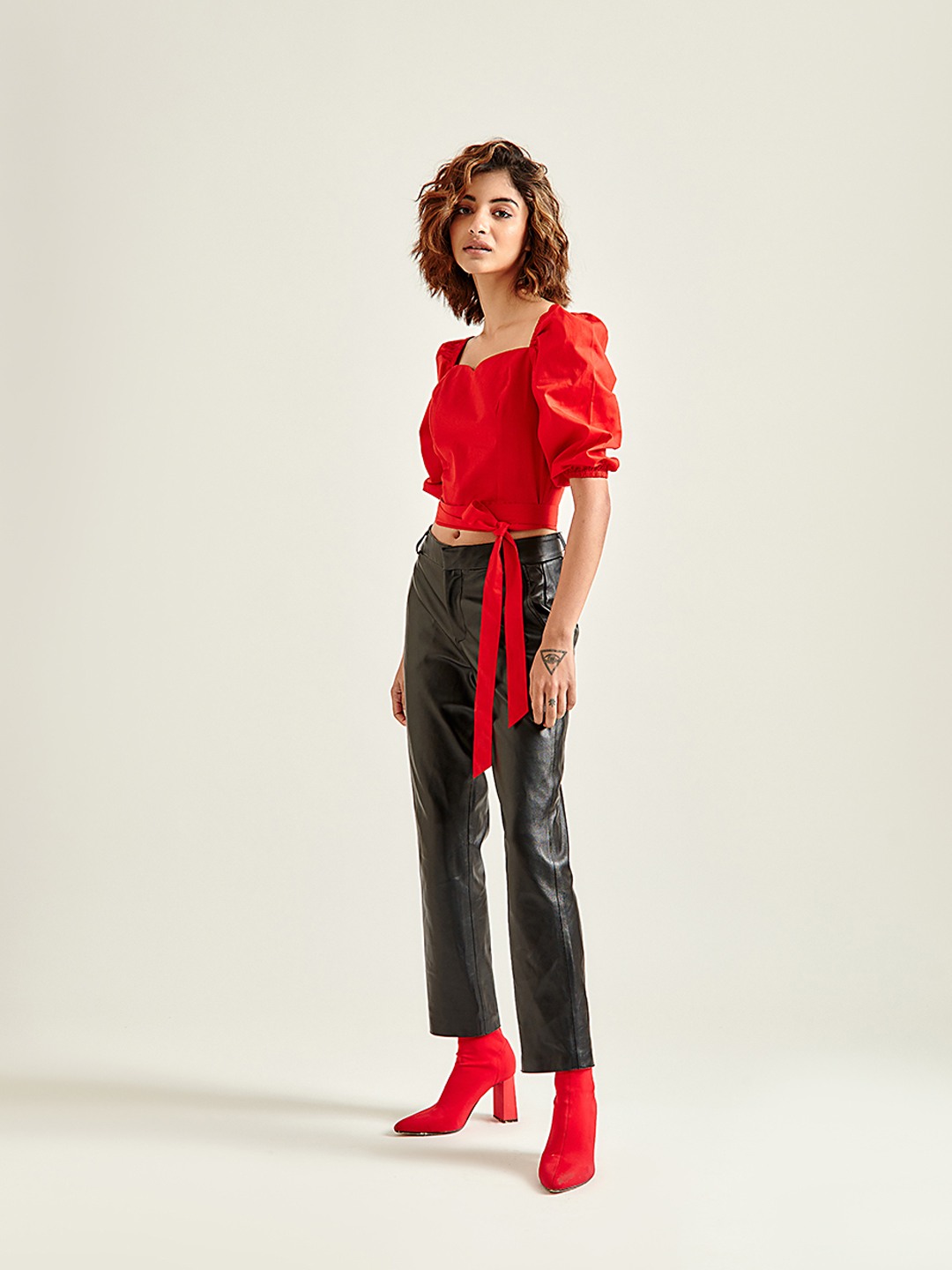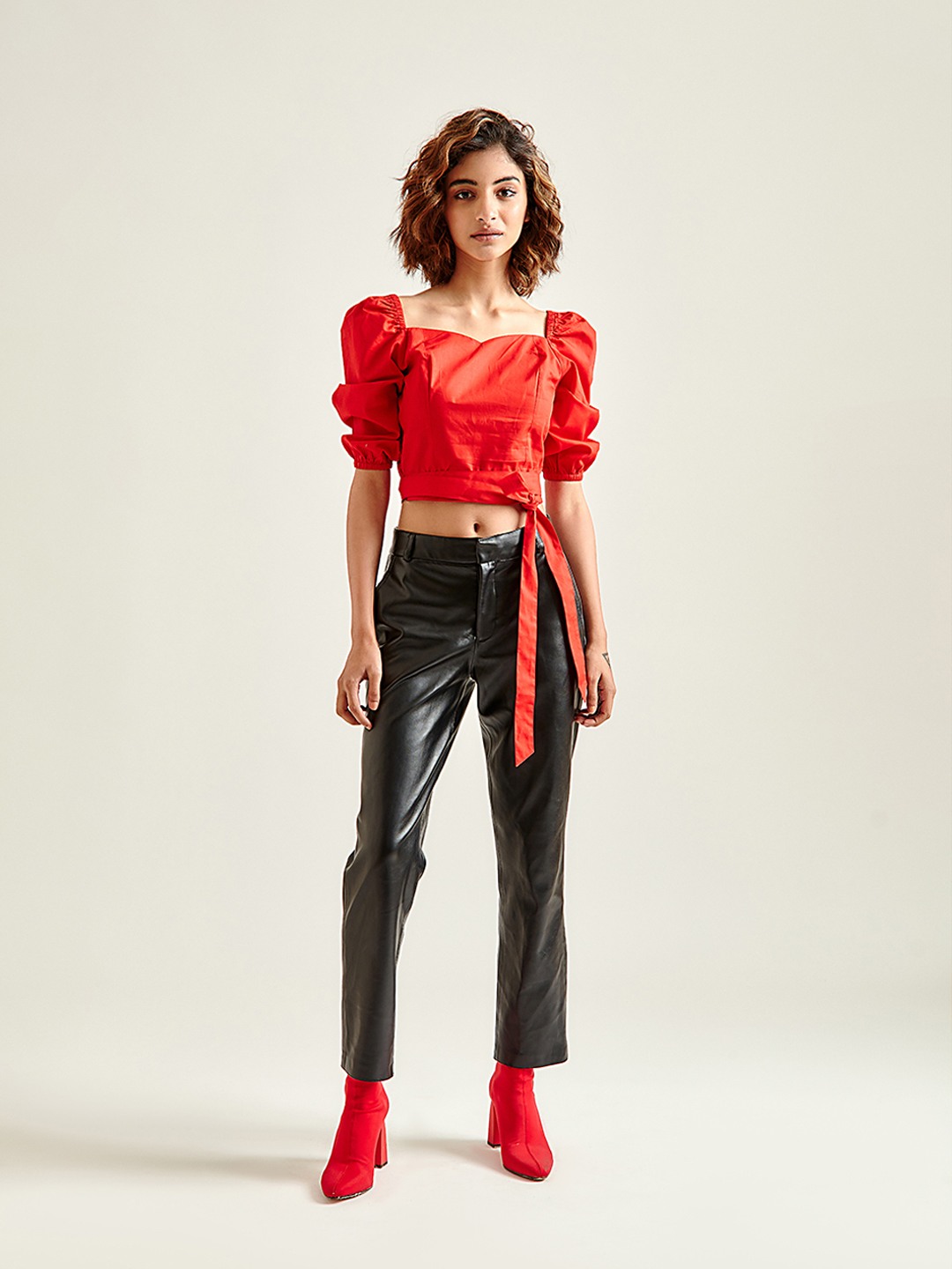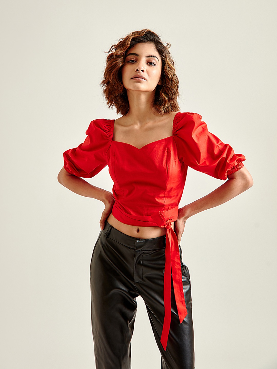 - Red wrap crop top with self fabric tie detail featuring short puff sleeves and sweetheart neckline