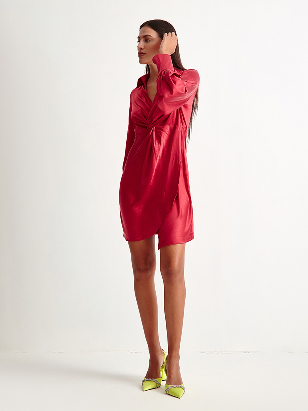 Pink wrap shift mini dress with tie detail featuring collar and long sleeves with button tabs