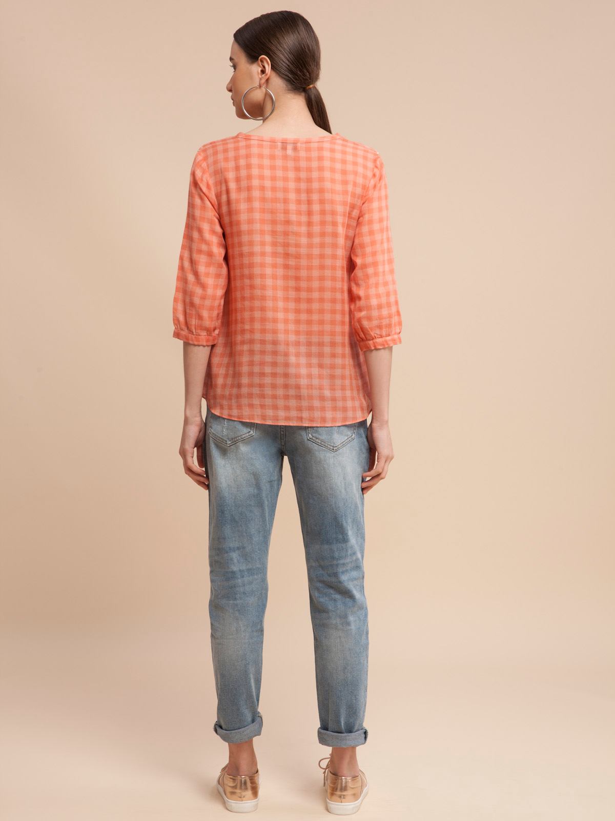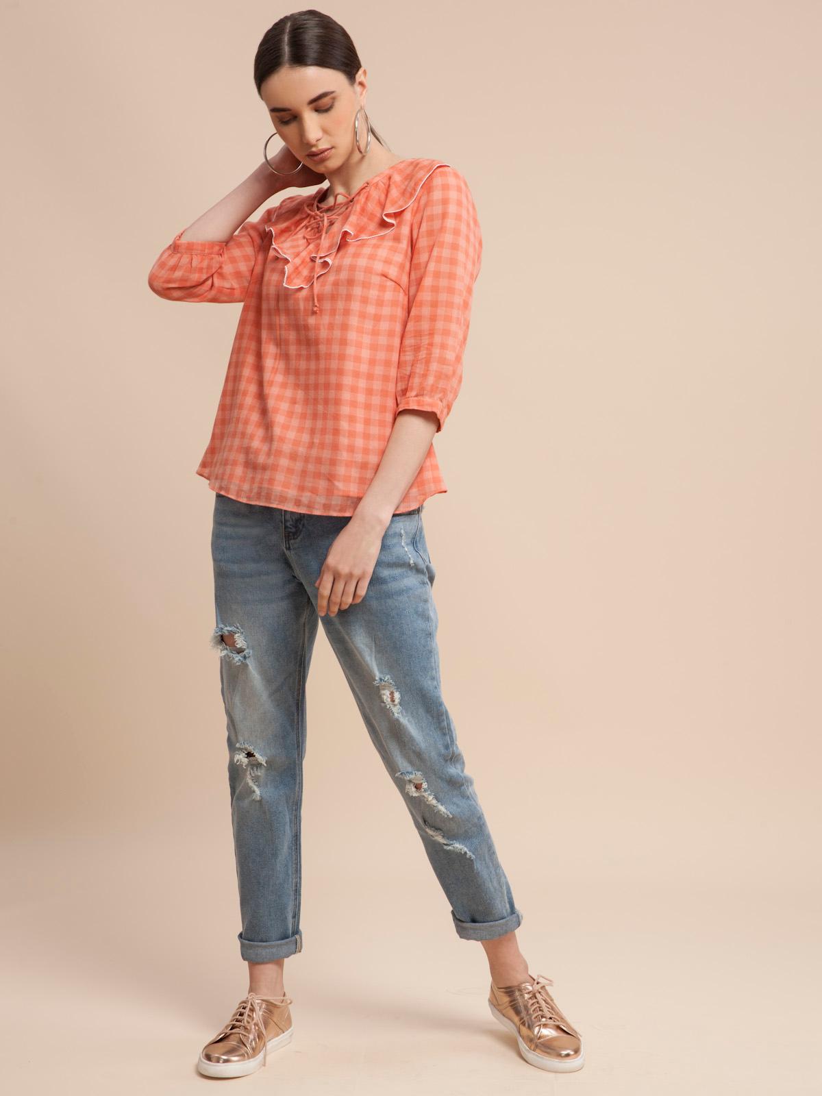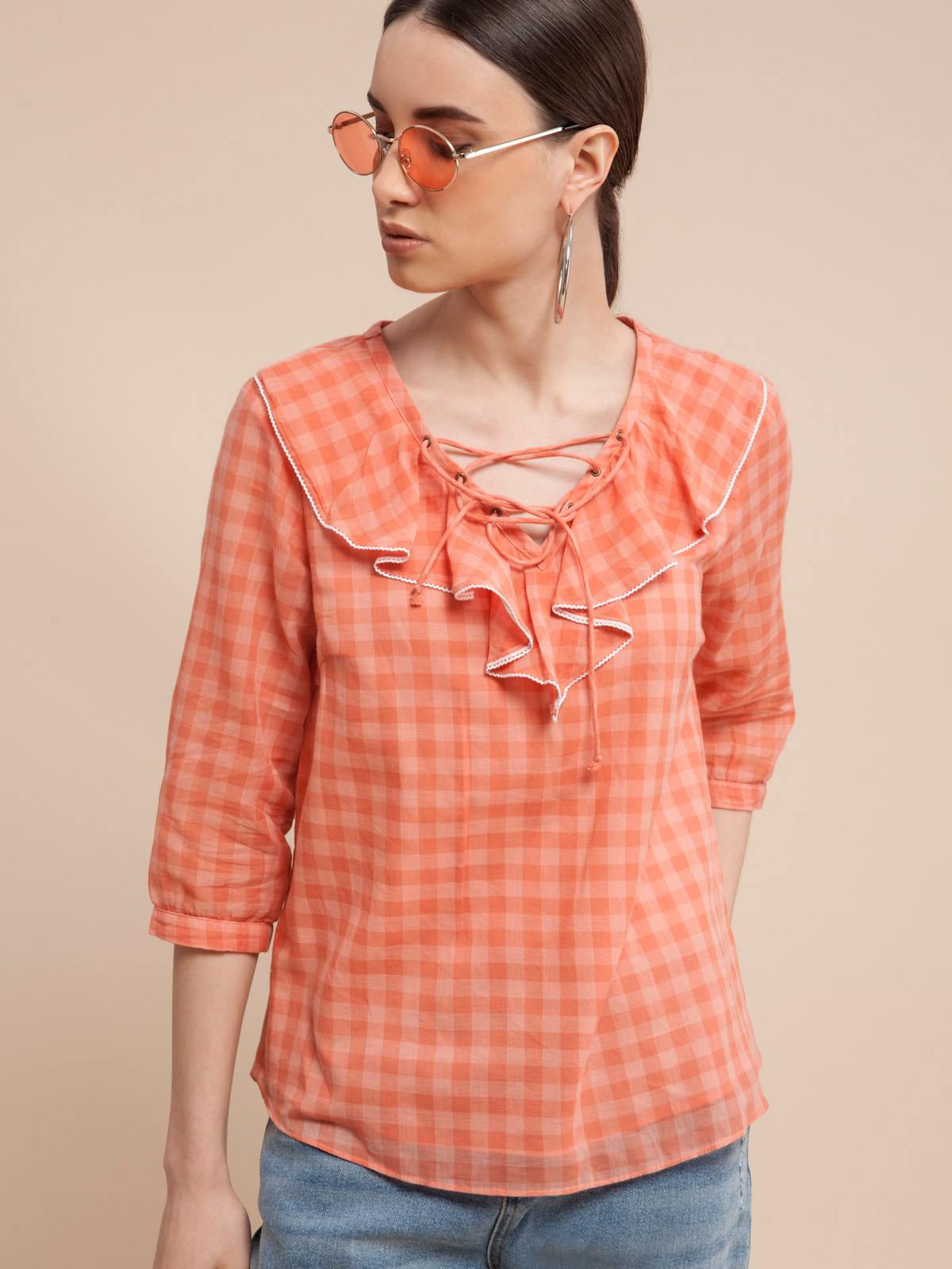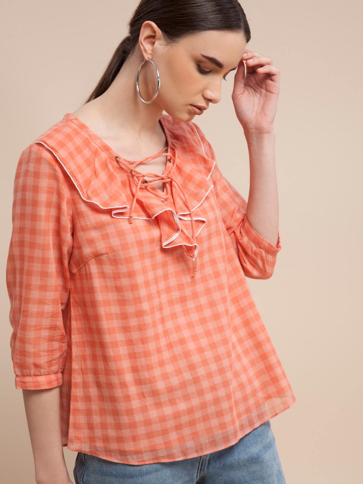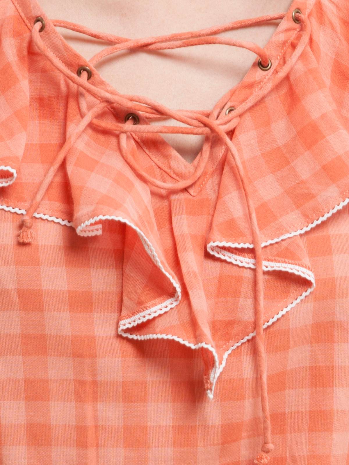 Soft Check Lace Up Blouse