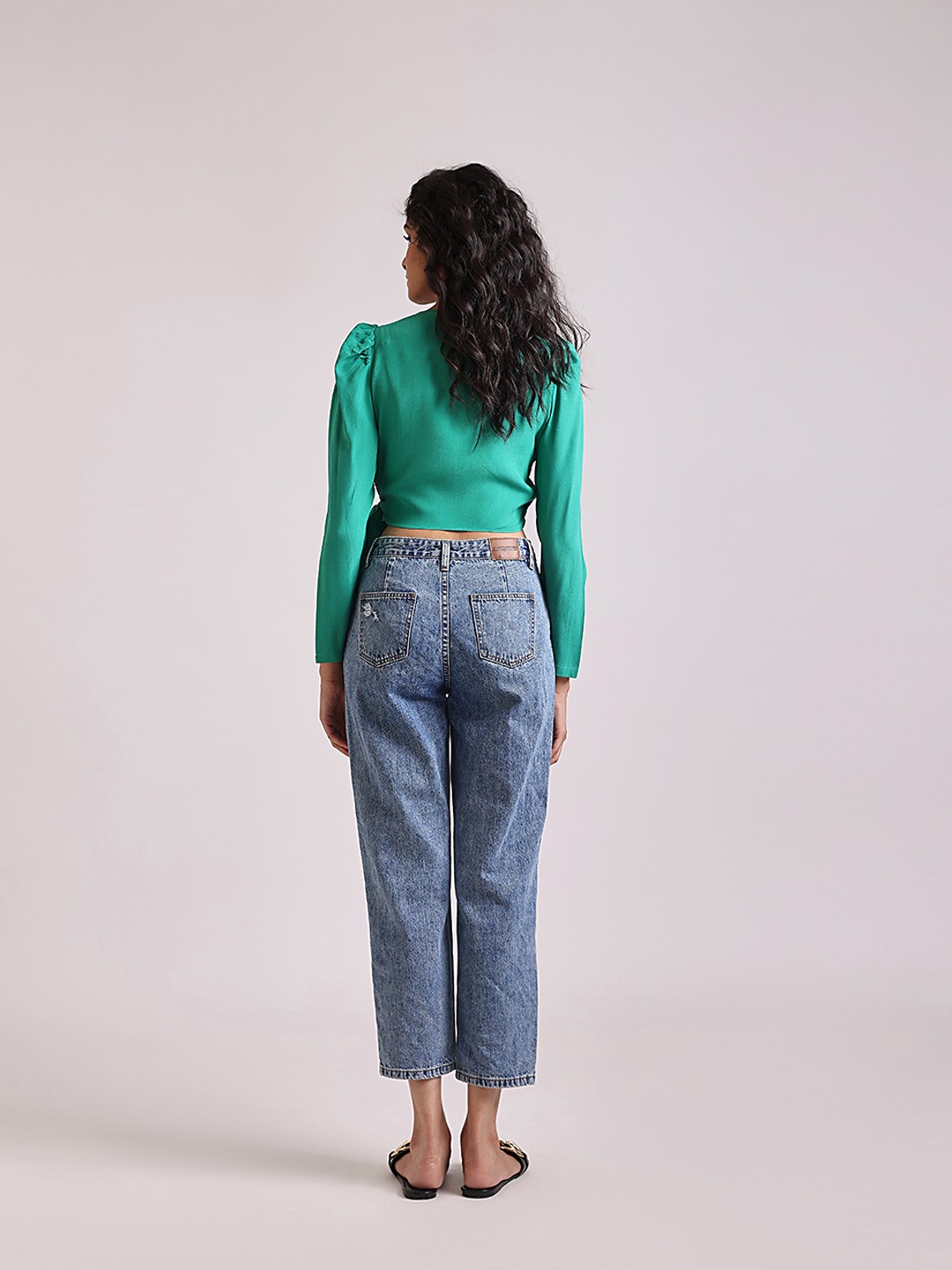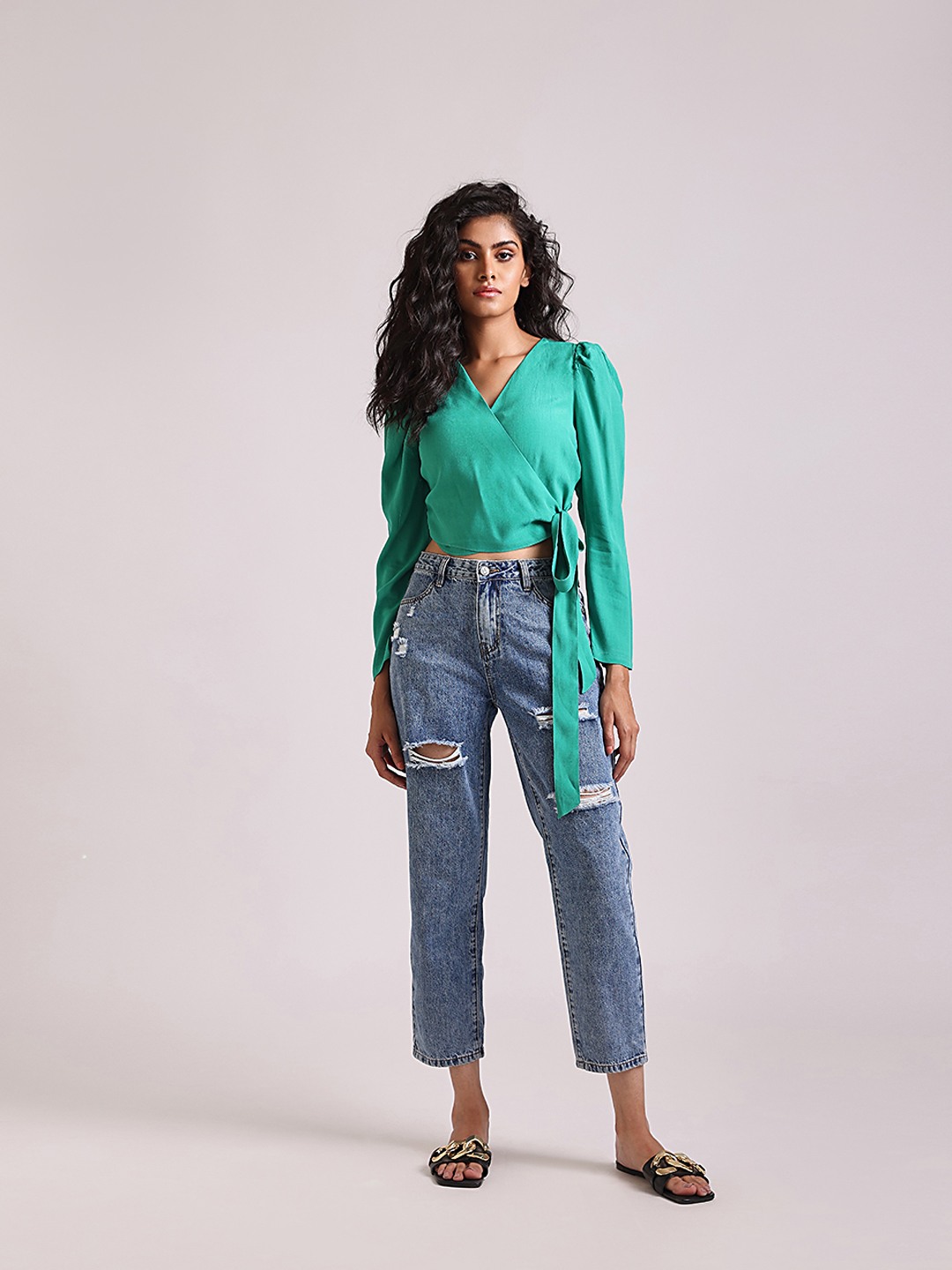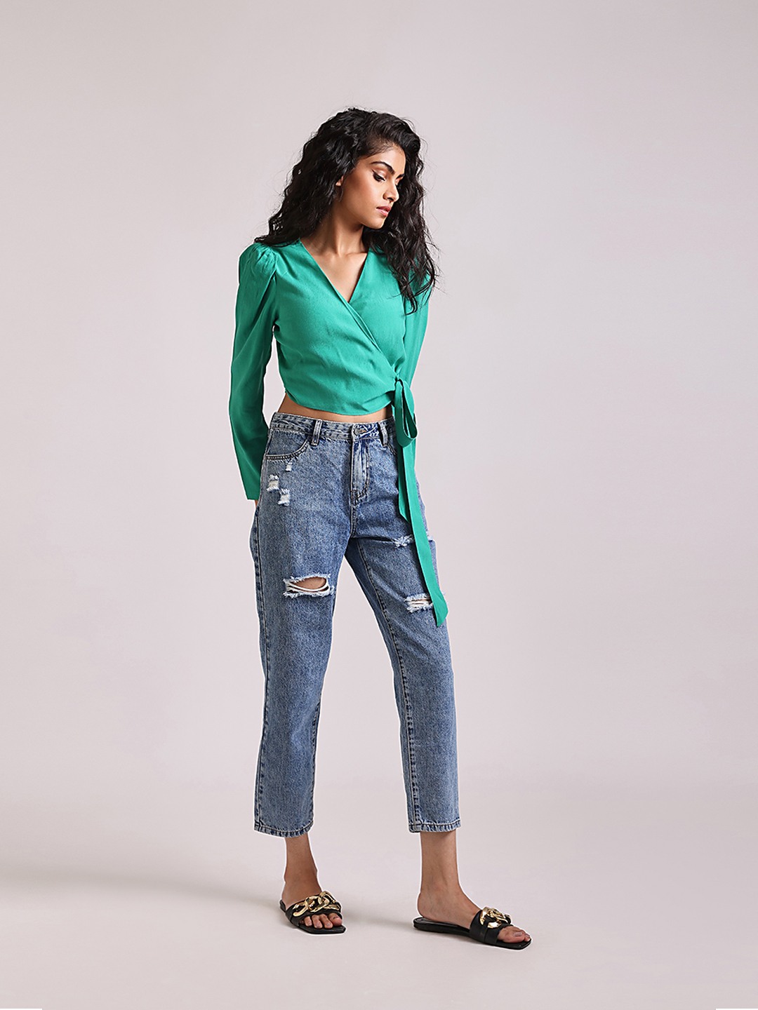 - Green wrap crop top with tie detail featuring V-neck and long sleeves