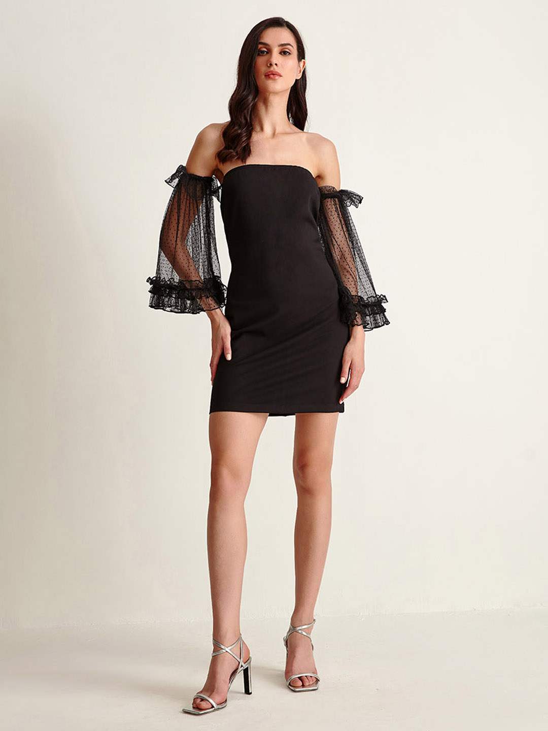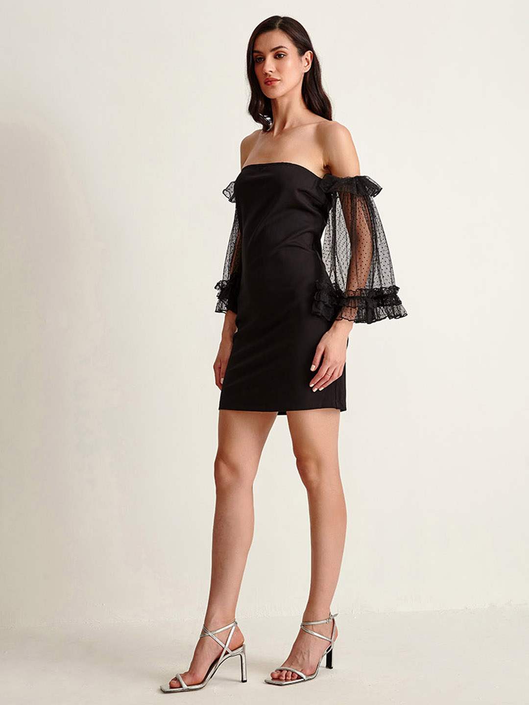 Black off-shoulder shift mini dress featuring long mesh flared sleeves