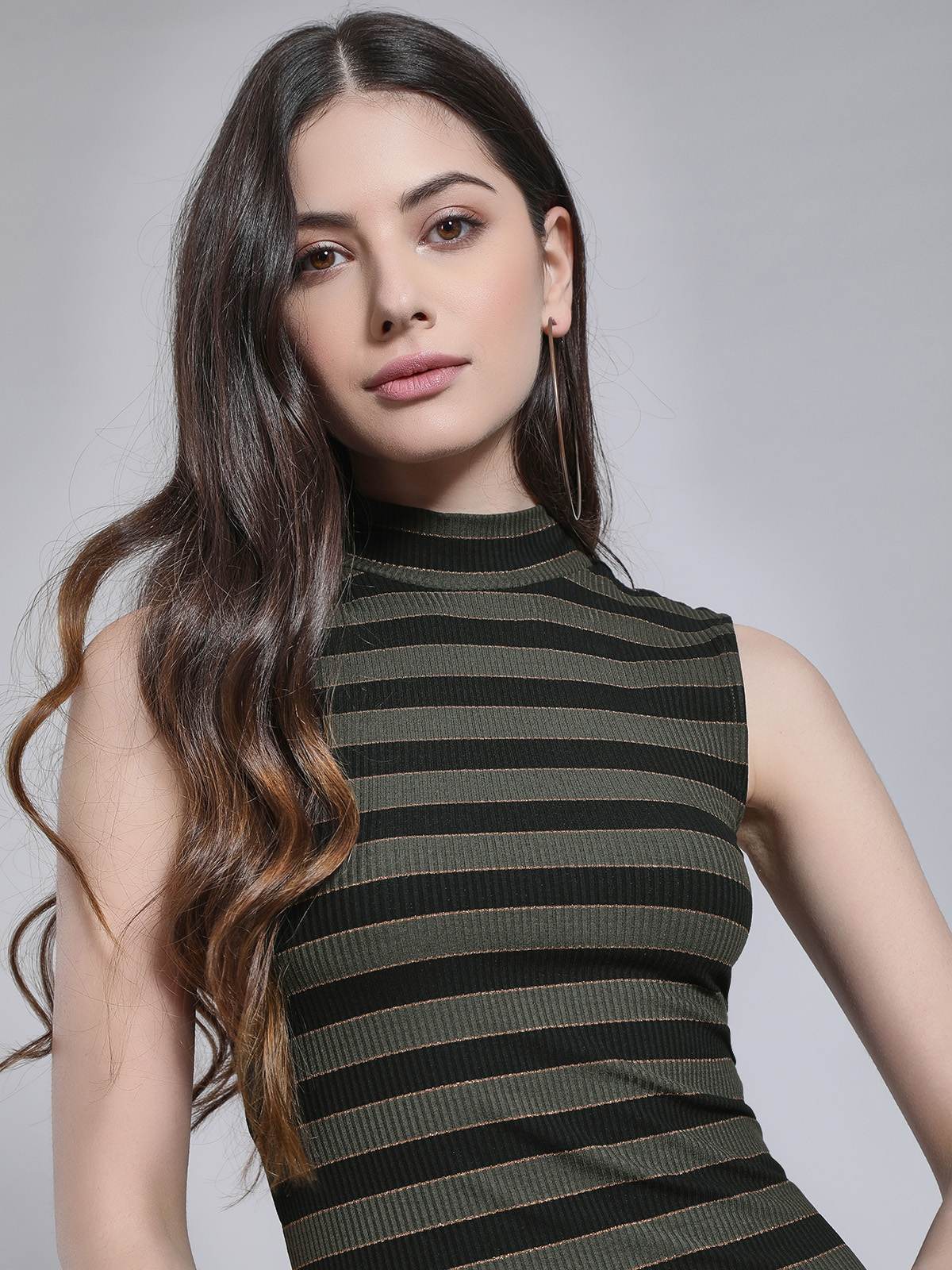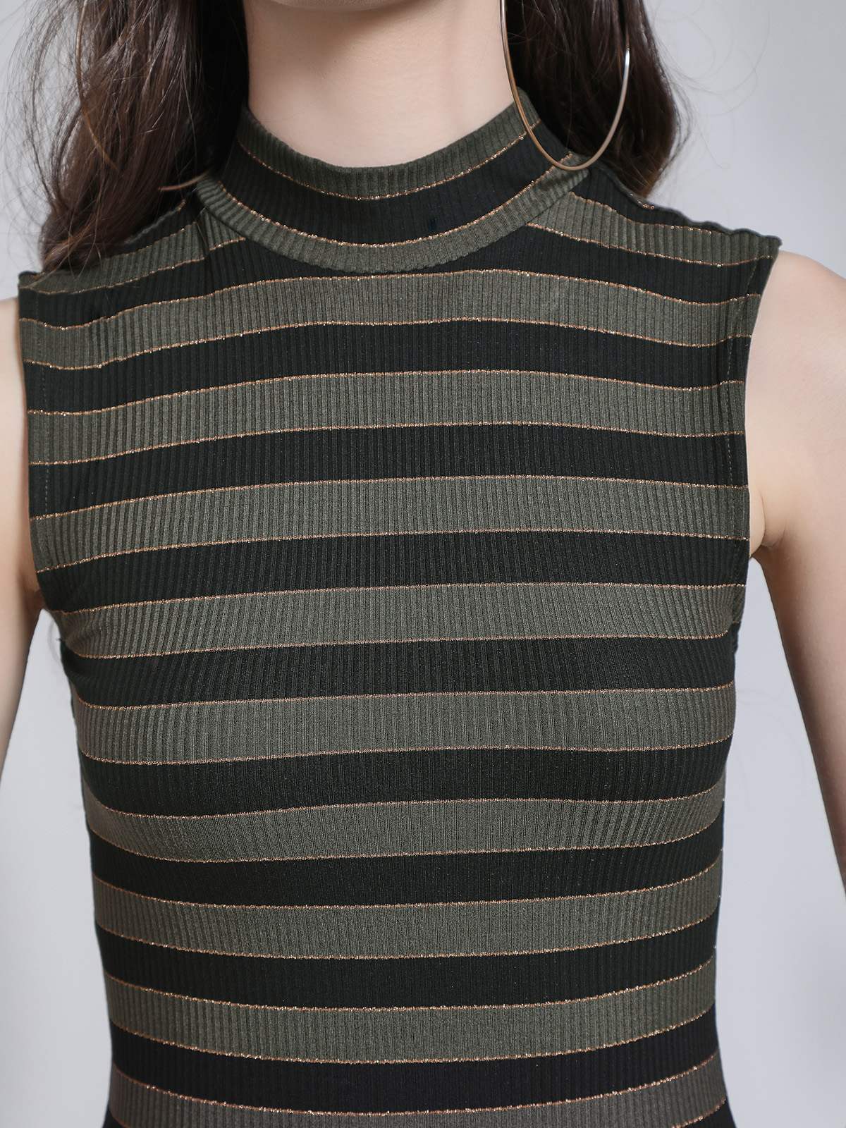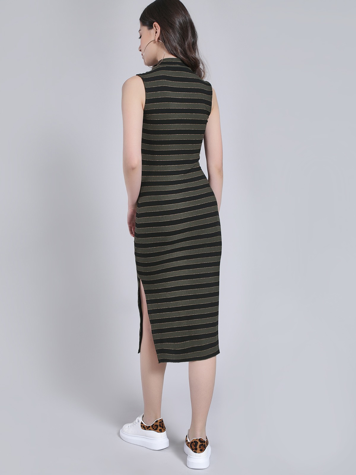 Turtle Neck Sleeveless Ribbed Striped Bodycon Dress