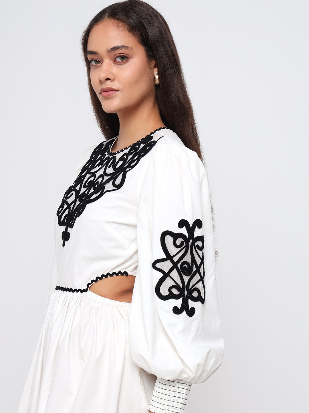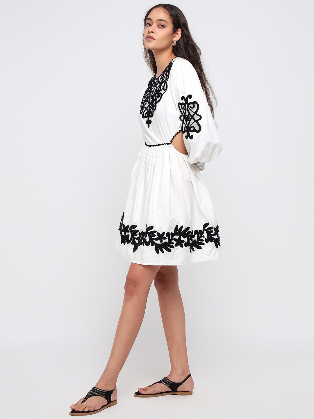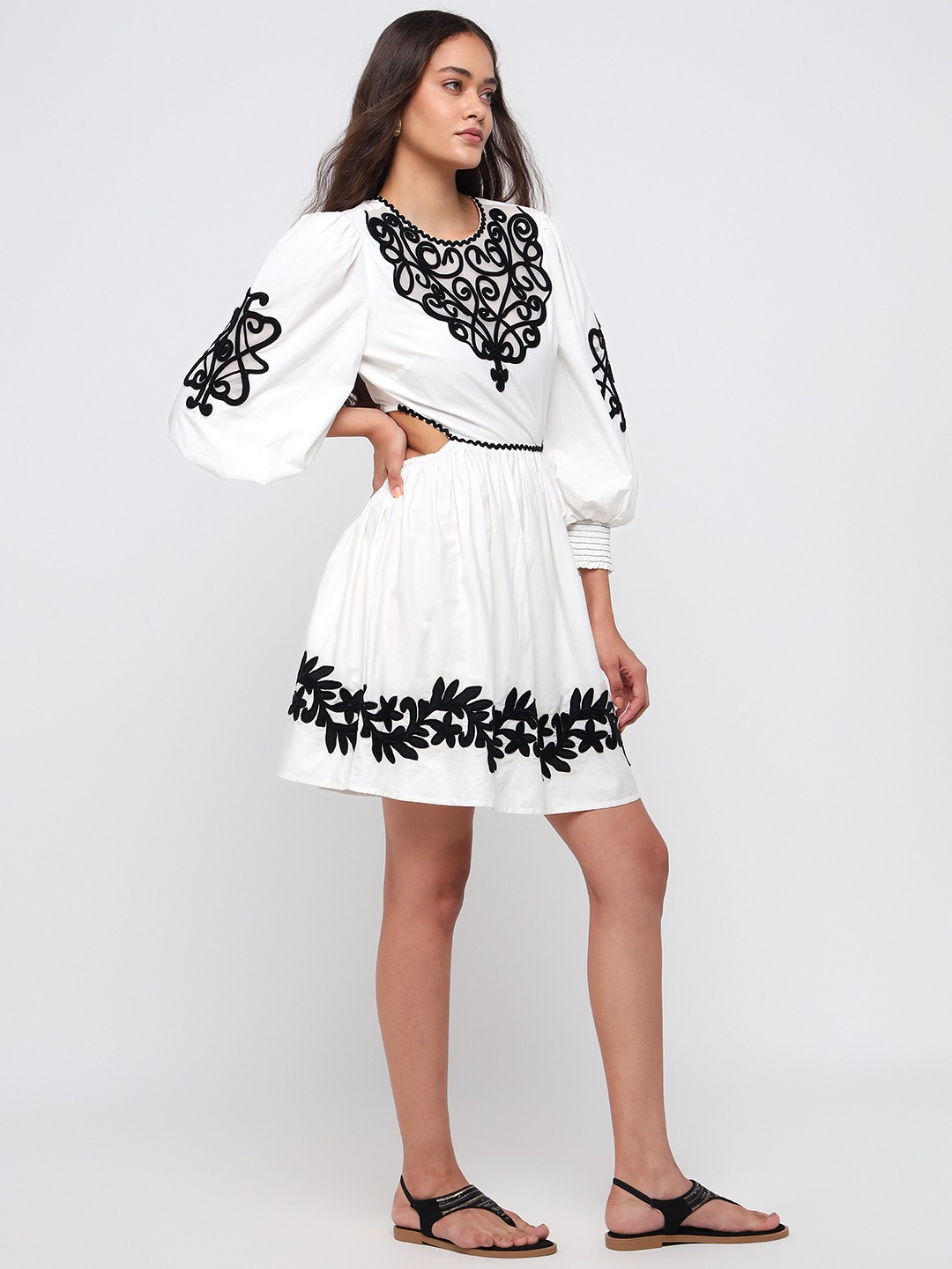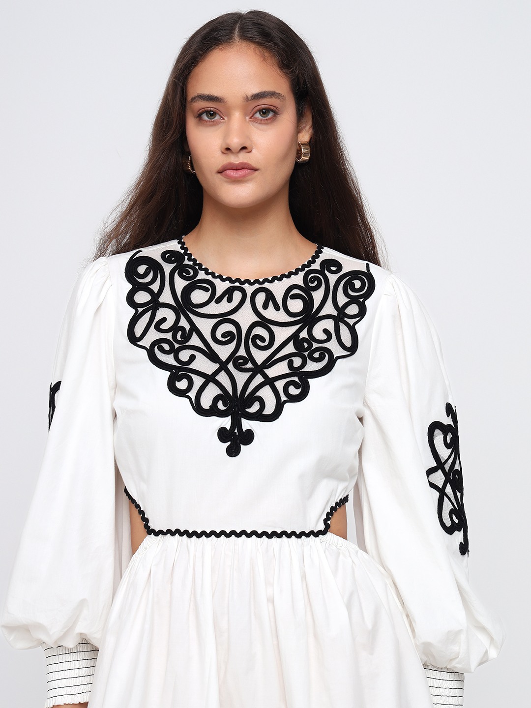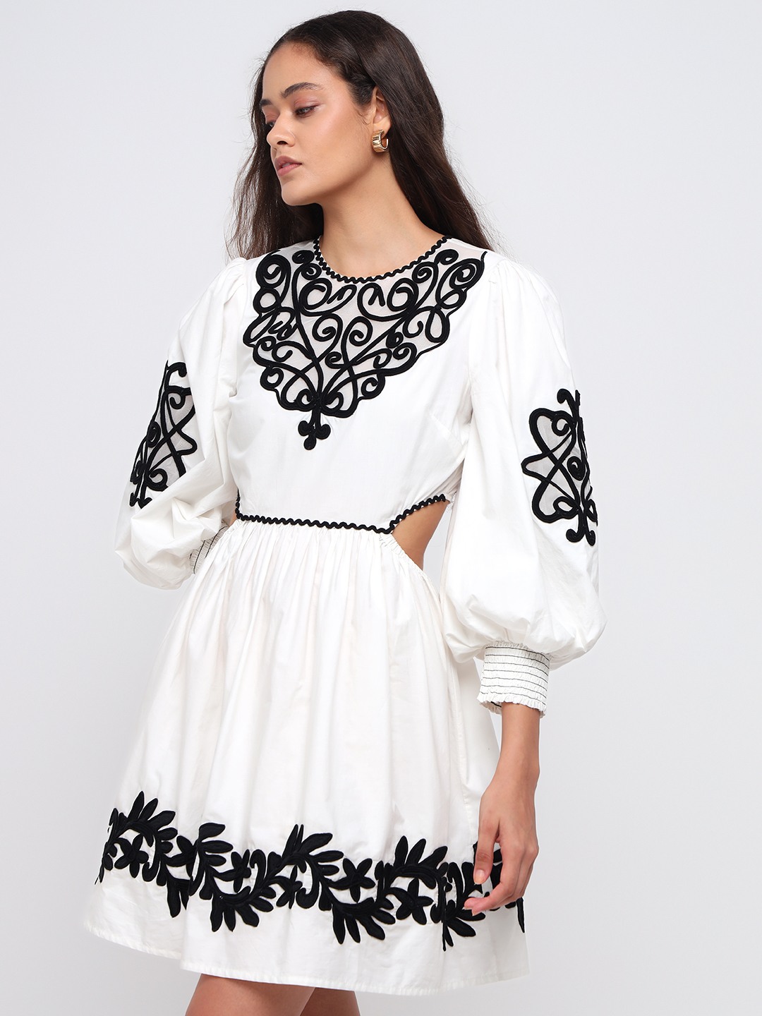 White mini dress with dramatic balloon sleeves and bold black thread embroidery. Features a cinched waist and ornate motifs for a striking boho look.