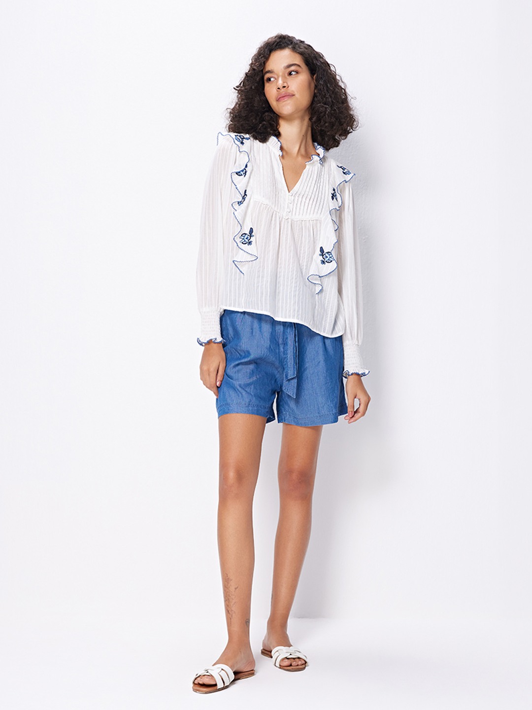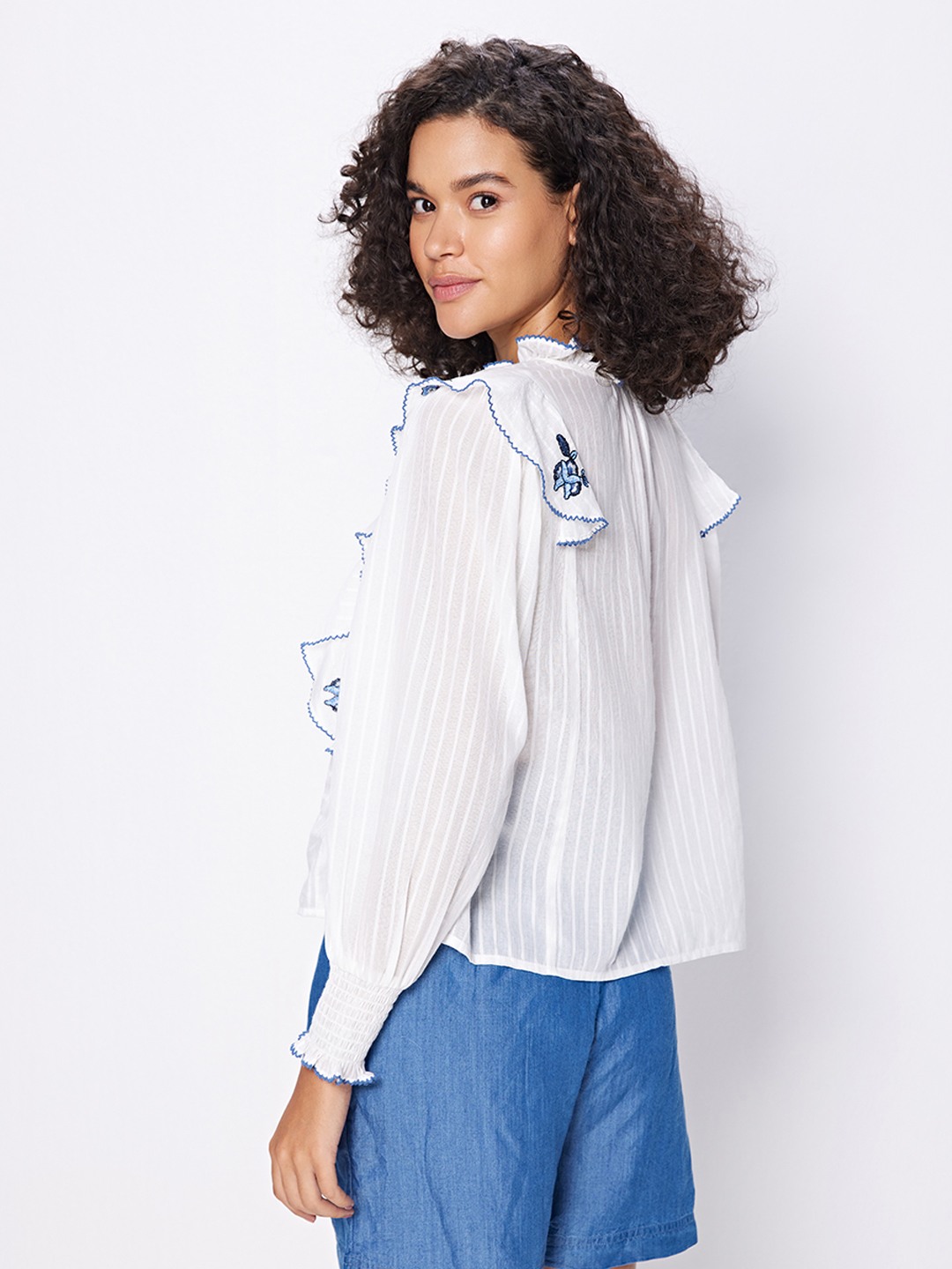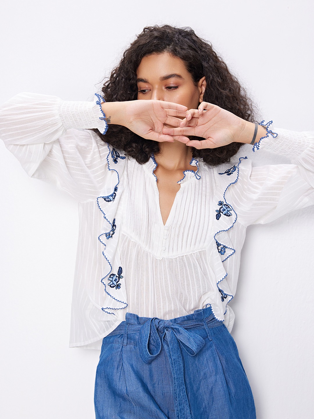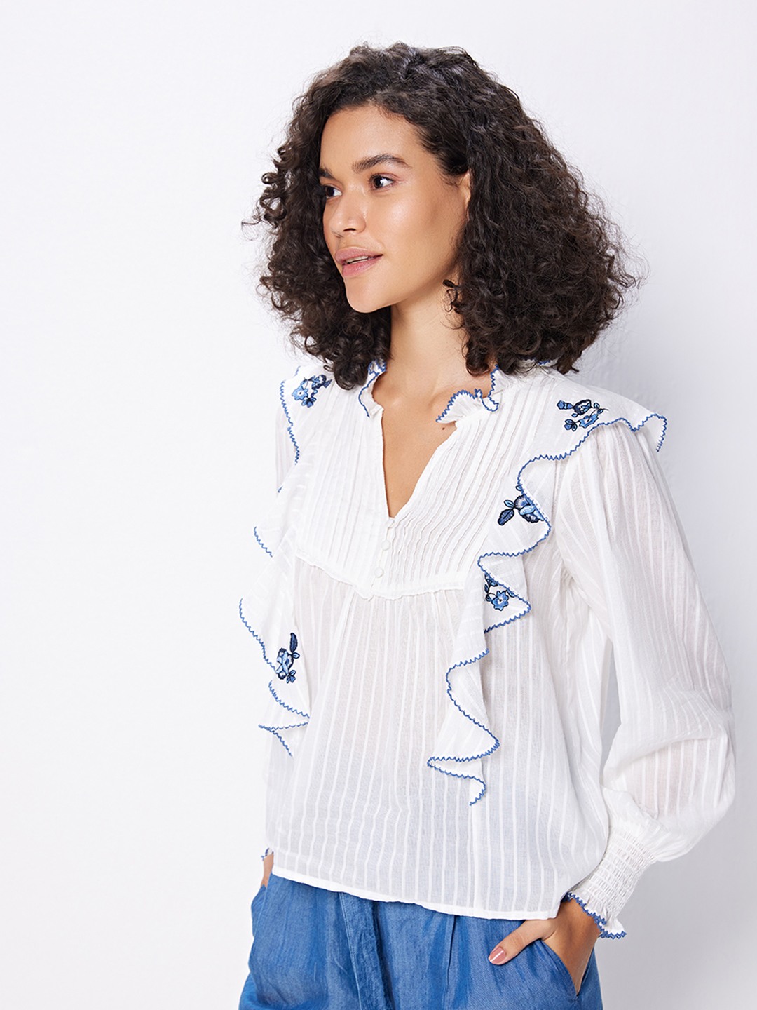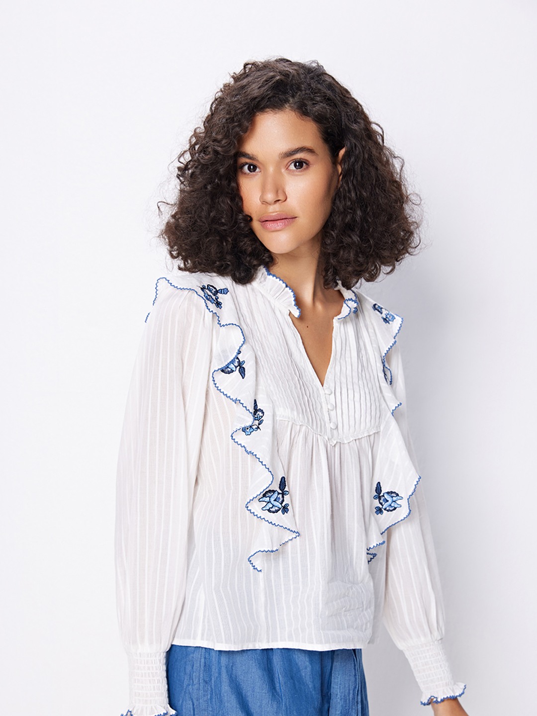 White blouse featuring long smocked sleeves and front ruffle