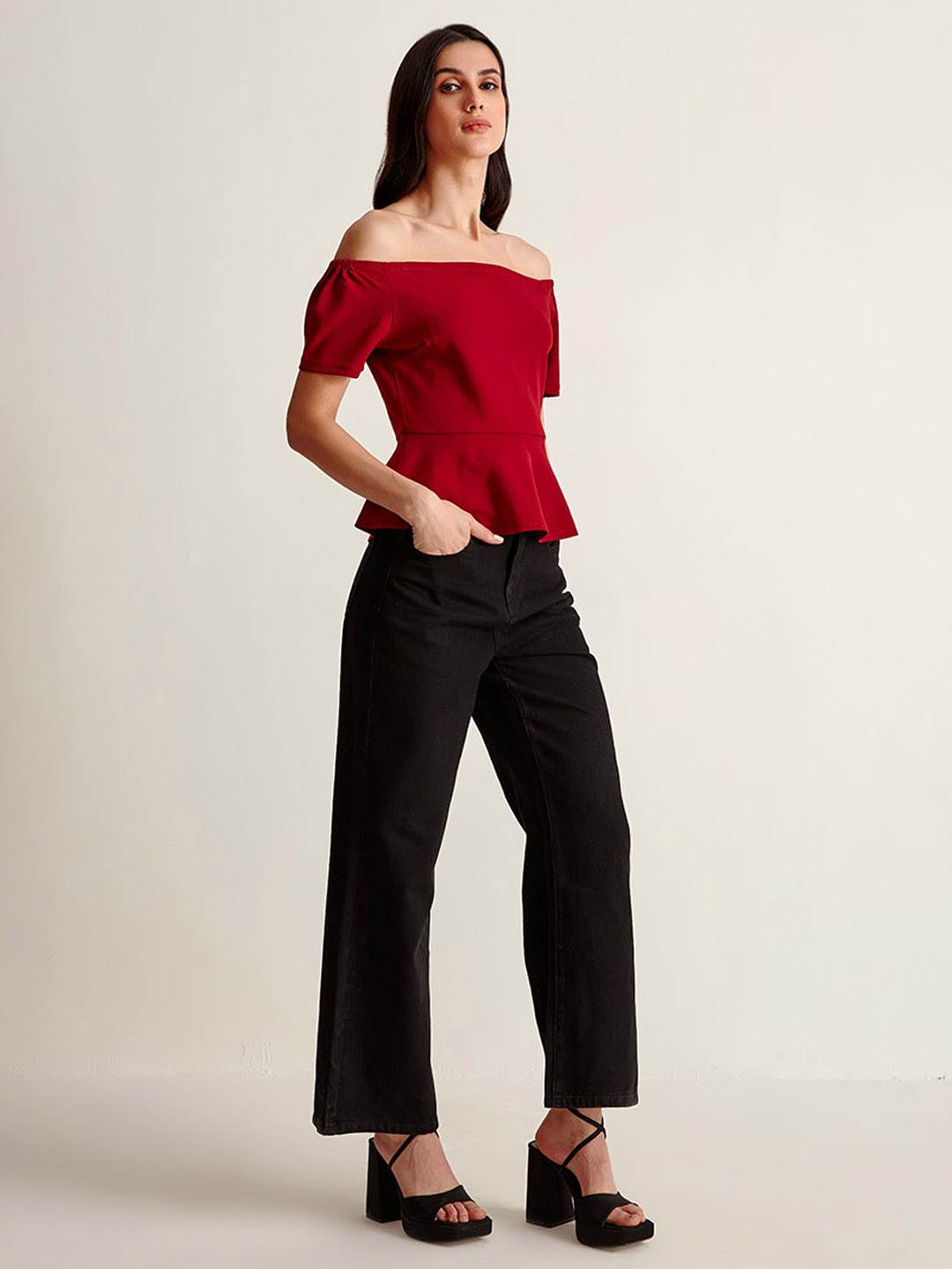 Wine bandeau peplum top featuring short sleeves