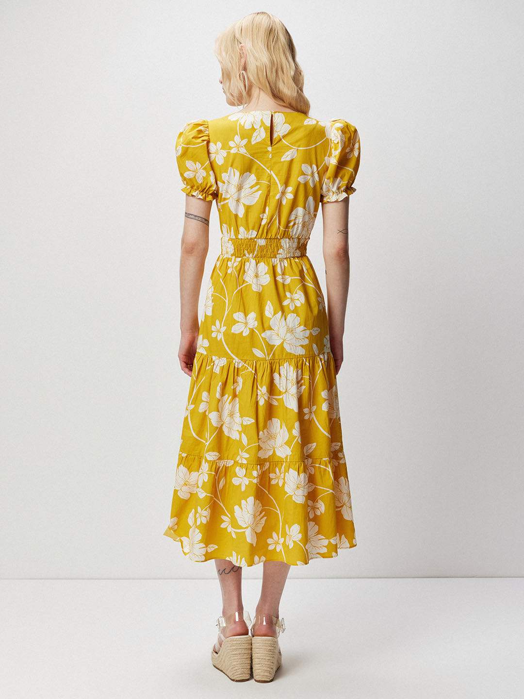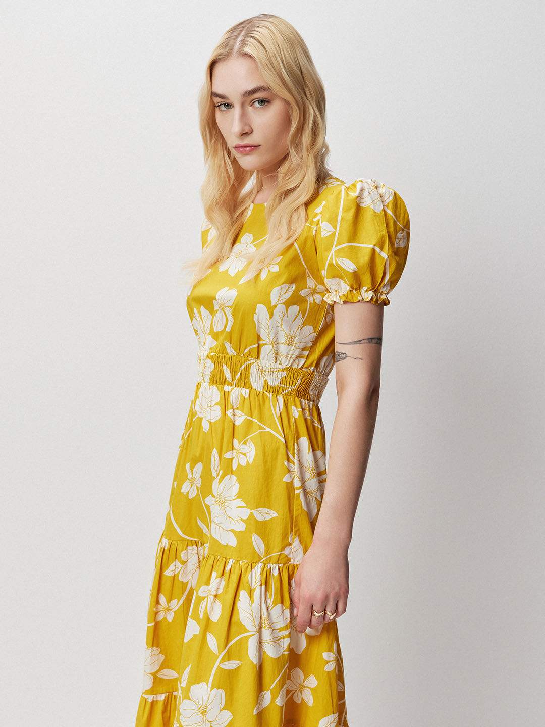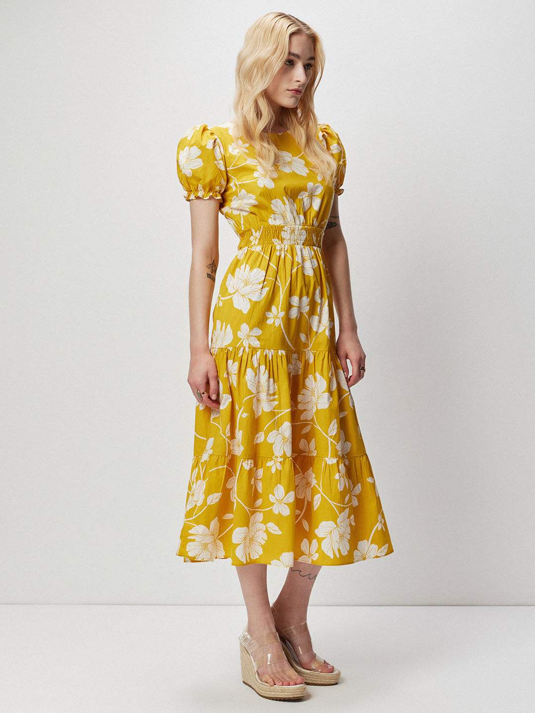 Yellow floral print poplin tiered midi dress featuring round neckline and short puff sleeves