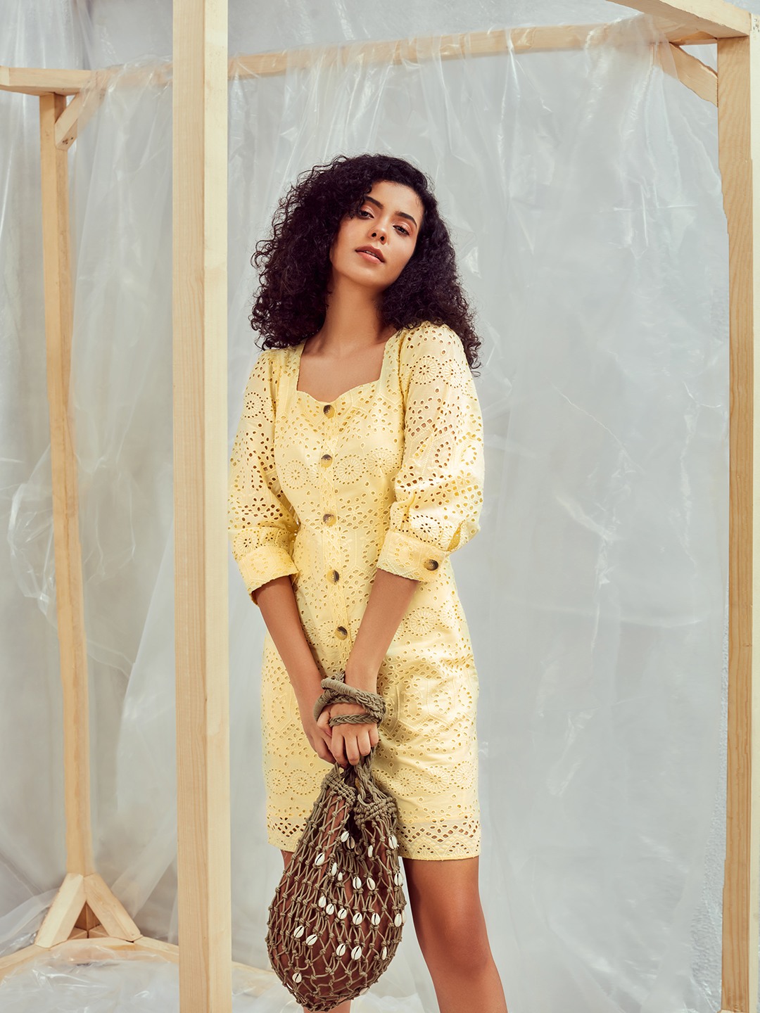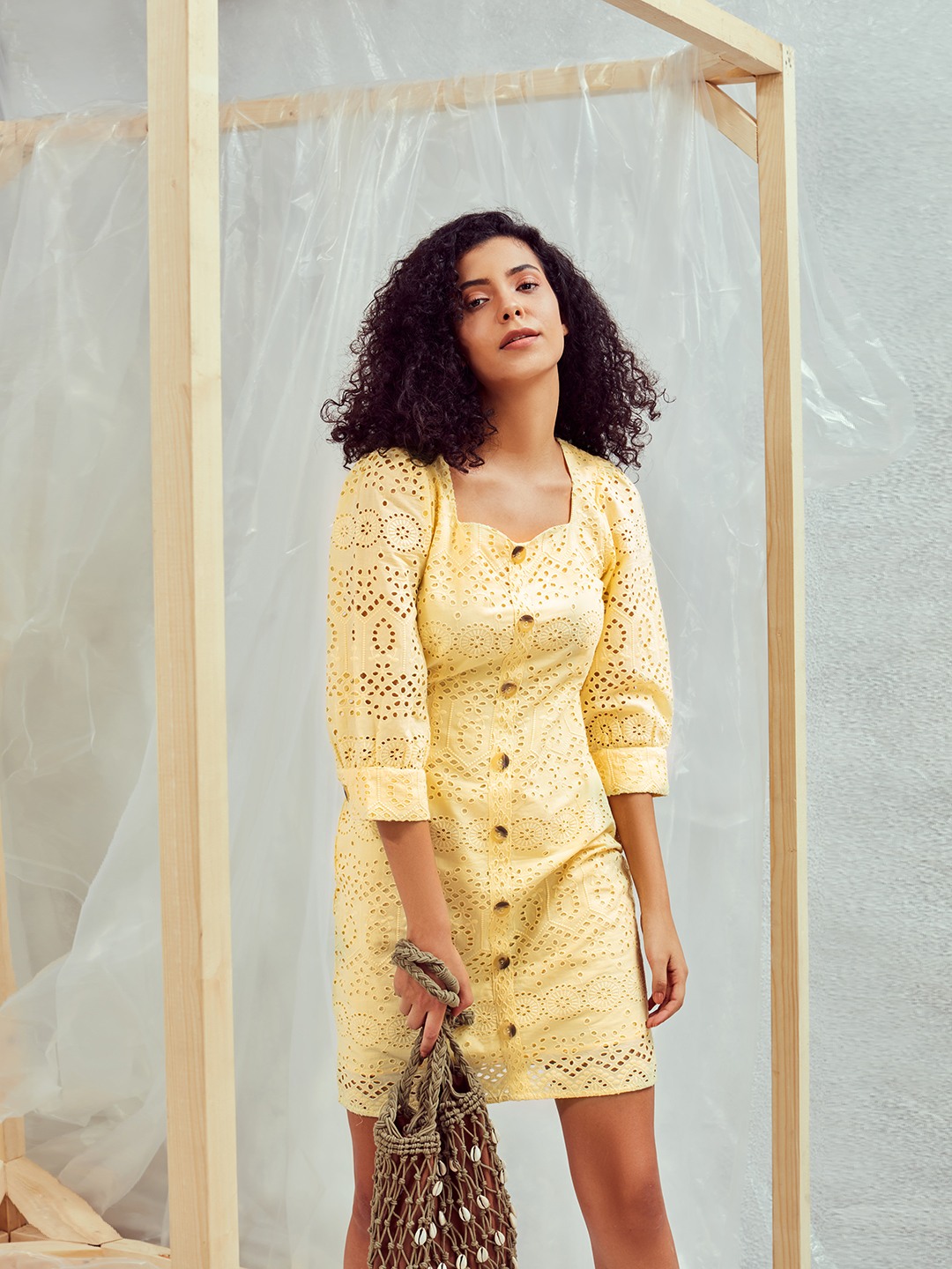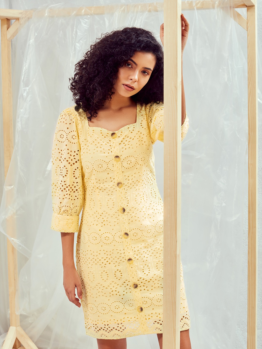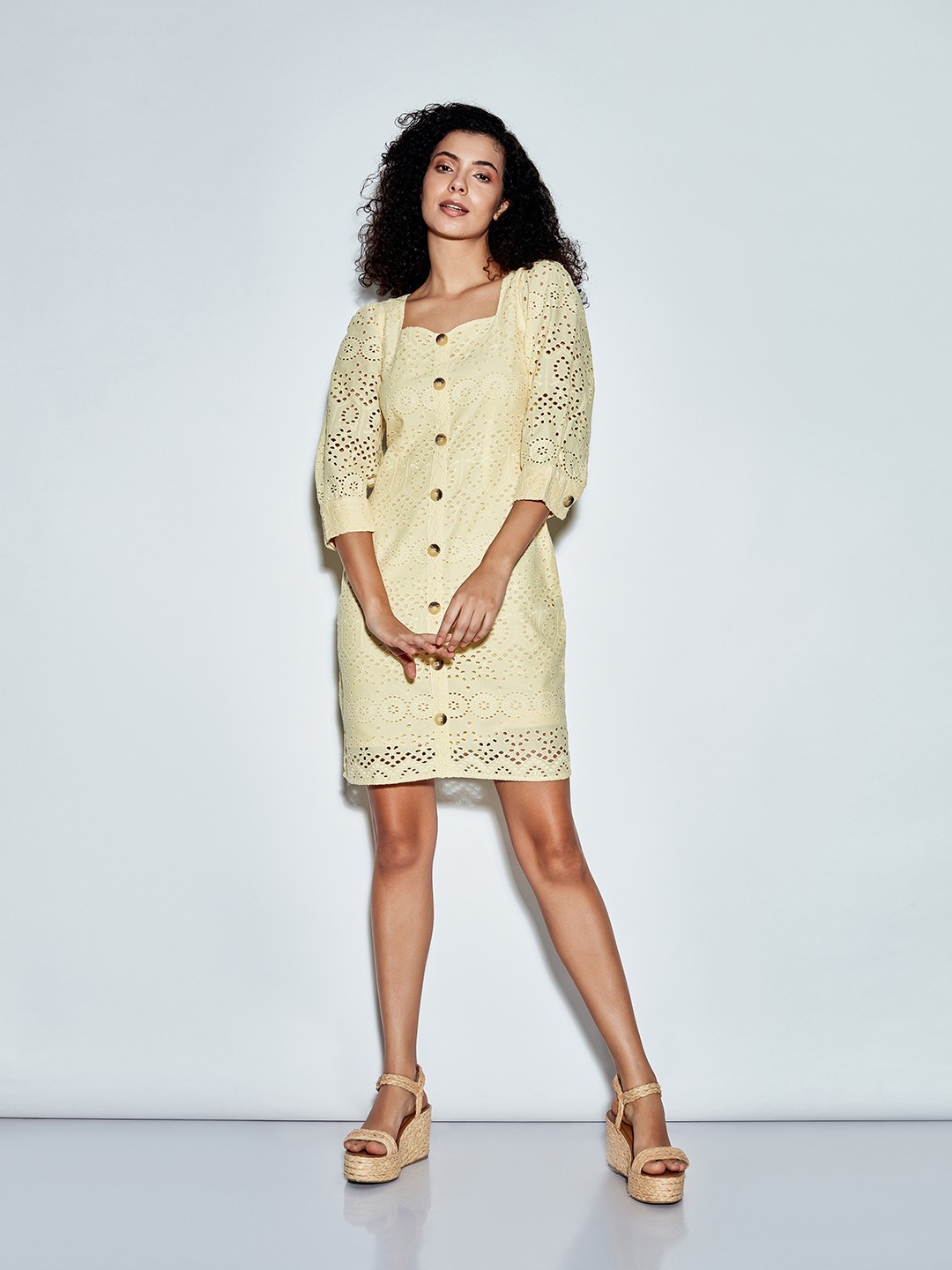 - Yellow shift dress featuring a sweetheart neckline and short puff sleeves